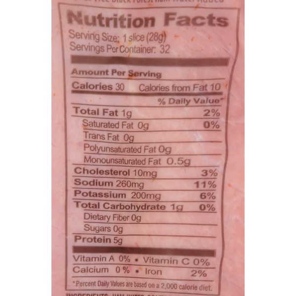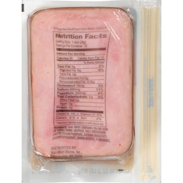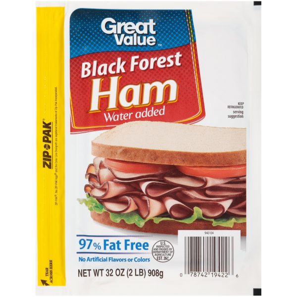 Great Value Black Forest Ham is made with fully cooked ham that is sliced and cured for at least 48 hours to ensure juicy flavor. This deli-style ham is perfect for quick and easy meals you can enjoy at home, in office or on the go. Use to make a chef salad that is loaded with fresh greens, tomatoes, boiled egg and shredded cheese, topped with creamy ranch dressing. This sandwich meat is great for health-conscious individuals as it is only 30 calories per serving, 97% fat free and made with no artificial flavors or colors. It is also gluten-free, USDA inspected and made with no added hormones or steroids. Each package makes up to 32 sandwiches, making it easy to stock up for the whole family. It comes in a zip-pak to ensure your deli meat is fresh after every use. Enjoy the fresh-from-the-deli taste with Great Value Black Forest Ham.Great Value products provide families with affordable, high-quality grocery and household consumable options. With our wide range of product categories spanning grocery and household consumables, we offer you a variety of products for your family’s needs. Our products are conveniently available online and in Walmart stores nationwide, allowing you to stock up and save money at the same time.