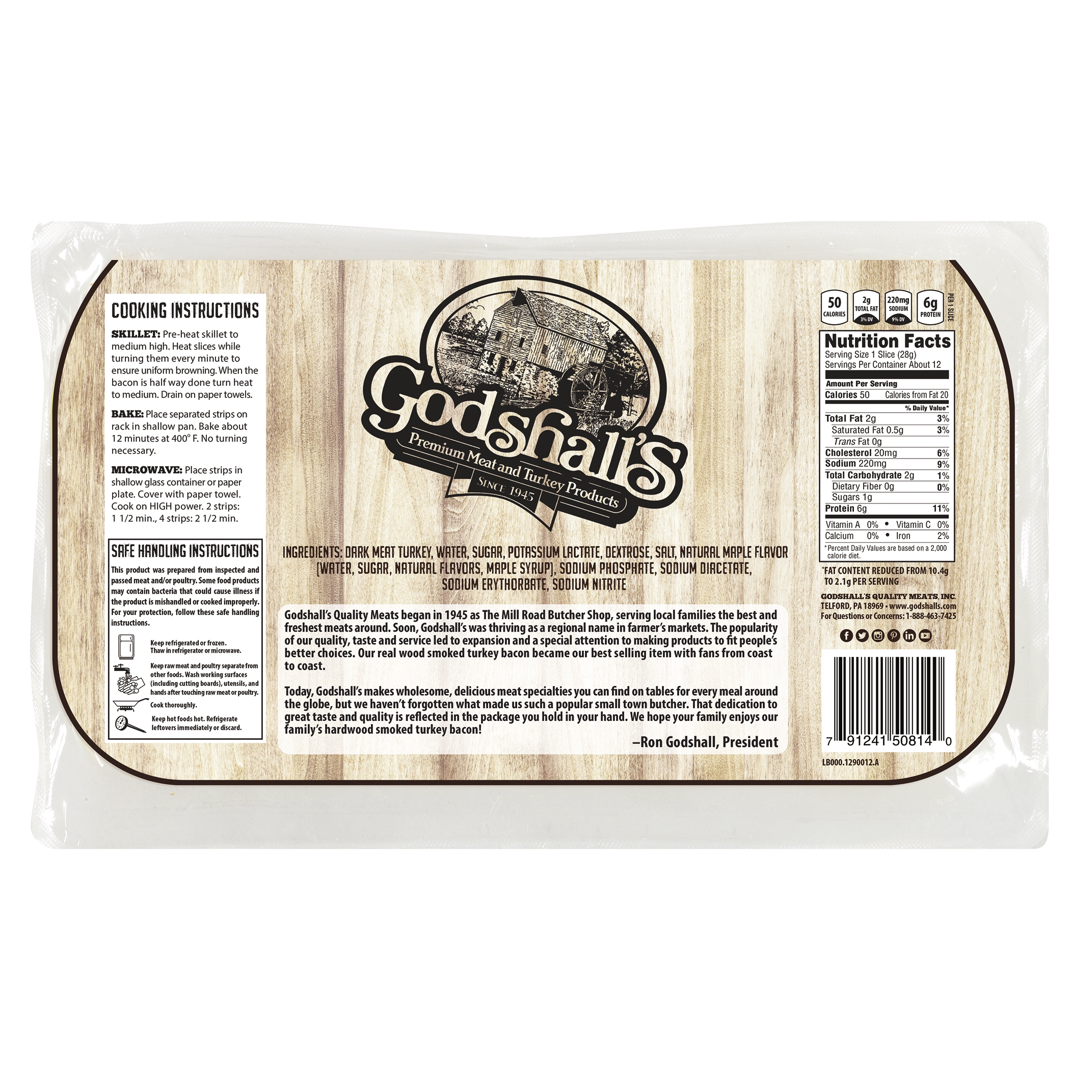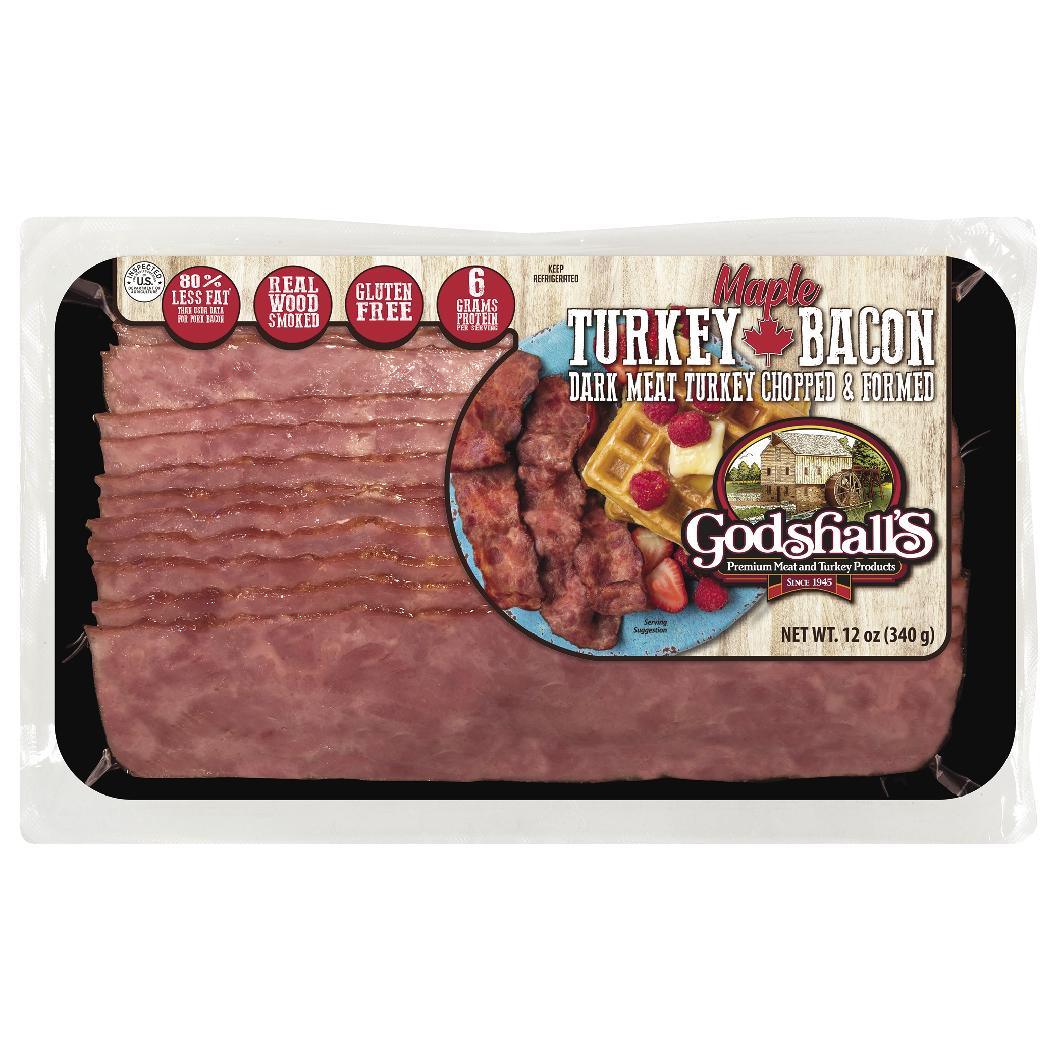 Nothing goes together like the taste of Maple Syrup and Real Wood Smoked Bacon. Godshall’s brings you both with 80% less fat in our delicious Maple Turkey Bacon. Real thigh and leg meat make Godshall’s a good source of protein with 6 grams in every slice. Godshall’s delivers the hearty, satisfying taste of real meat, smoked over a time honored, genuine hardwood blend. Our Maple Turkey Bacon is the perfect complement to breakfast, a treat on lunch’s BLT, or the secret ingredient to dozens of appetizers and dinners. Since 1945 Godshall’s has learned a lot about making meats people love. That’s why we start with cage-free turkey and country smokehouses, for the just right flavor we’re proud to serve our families. While Godshall’s has grown from the little Mill Road Butcher Shop to a leading supplier of premium meat and poultry, we still give each slice the time and attention to delight with every bite!