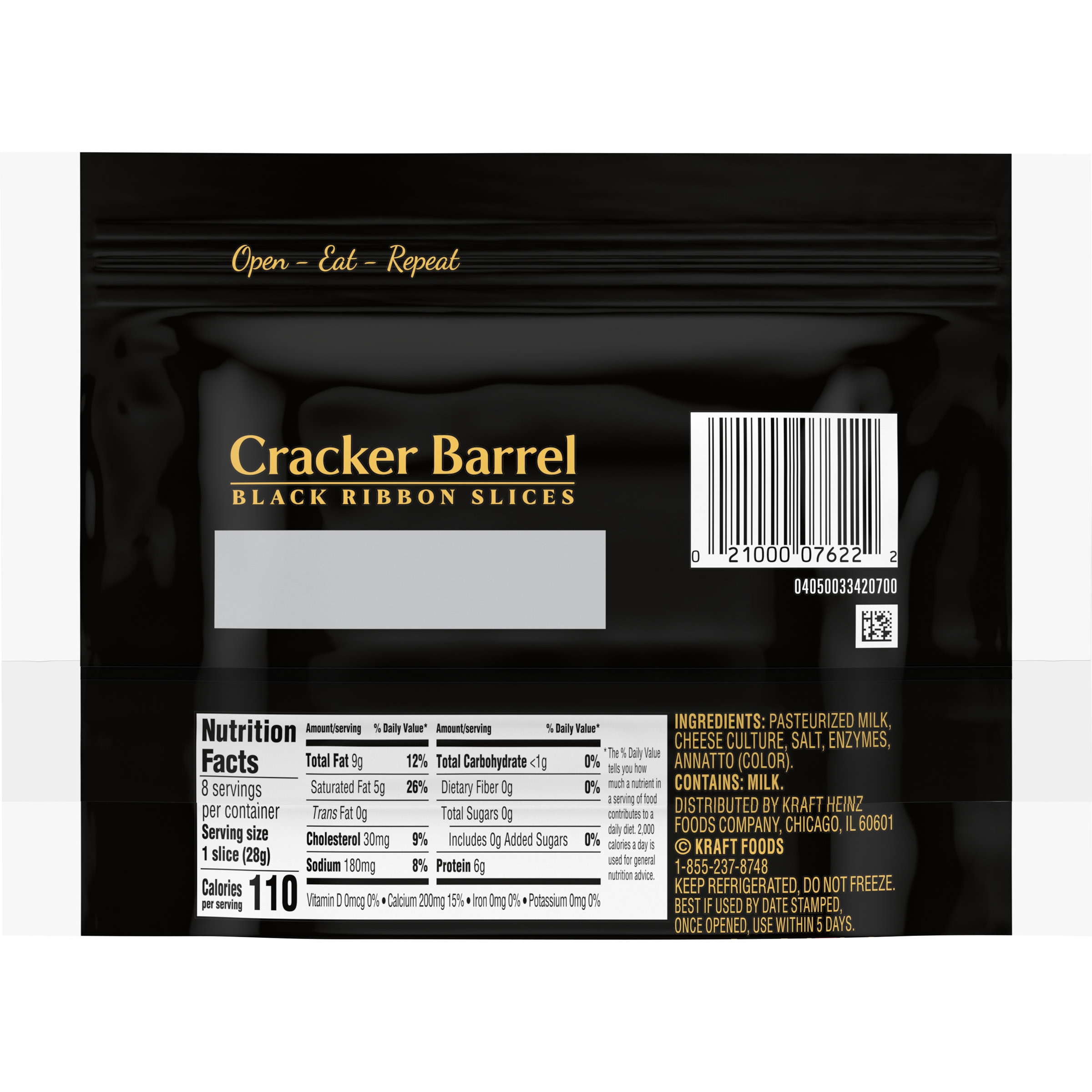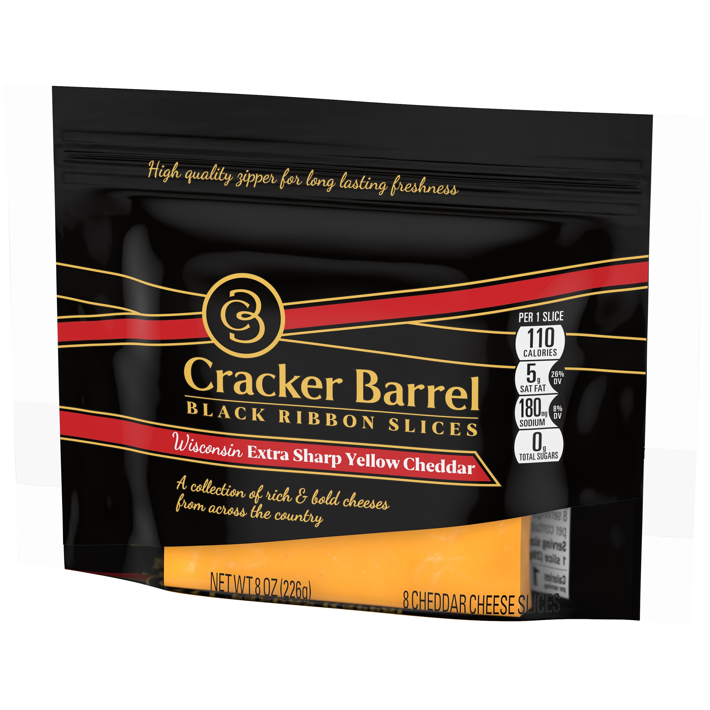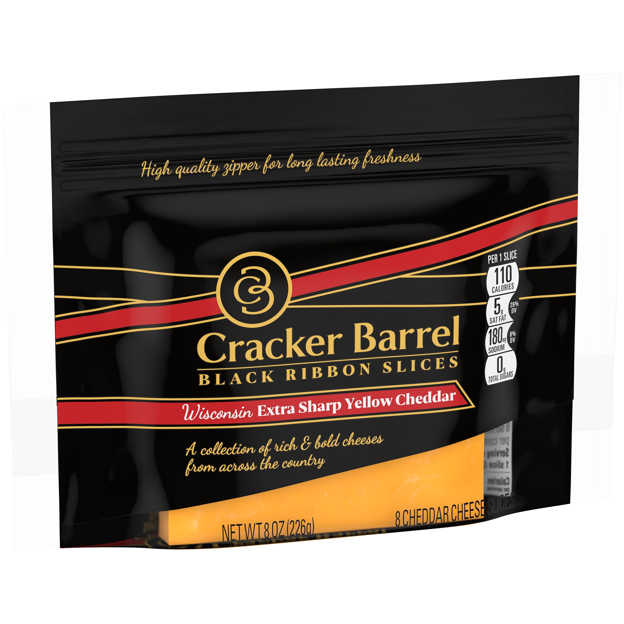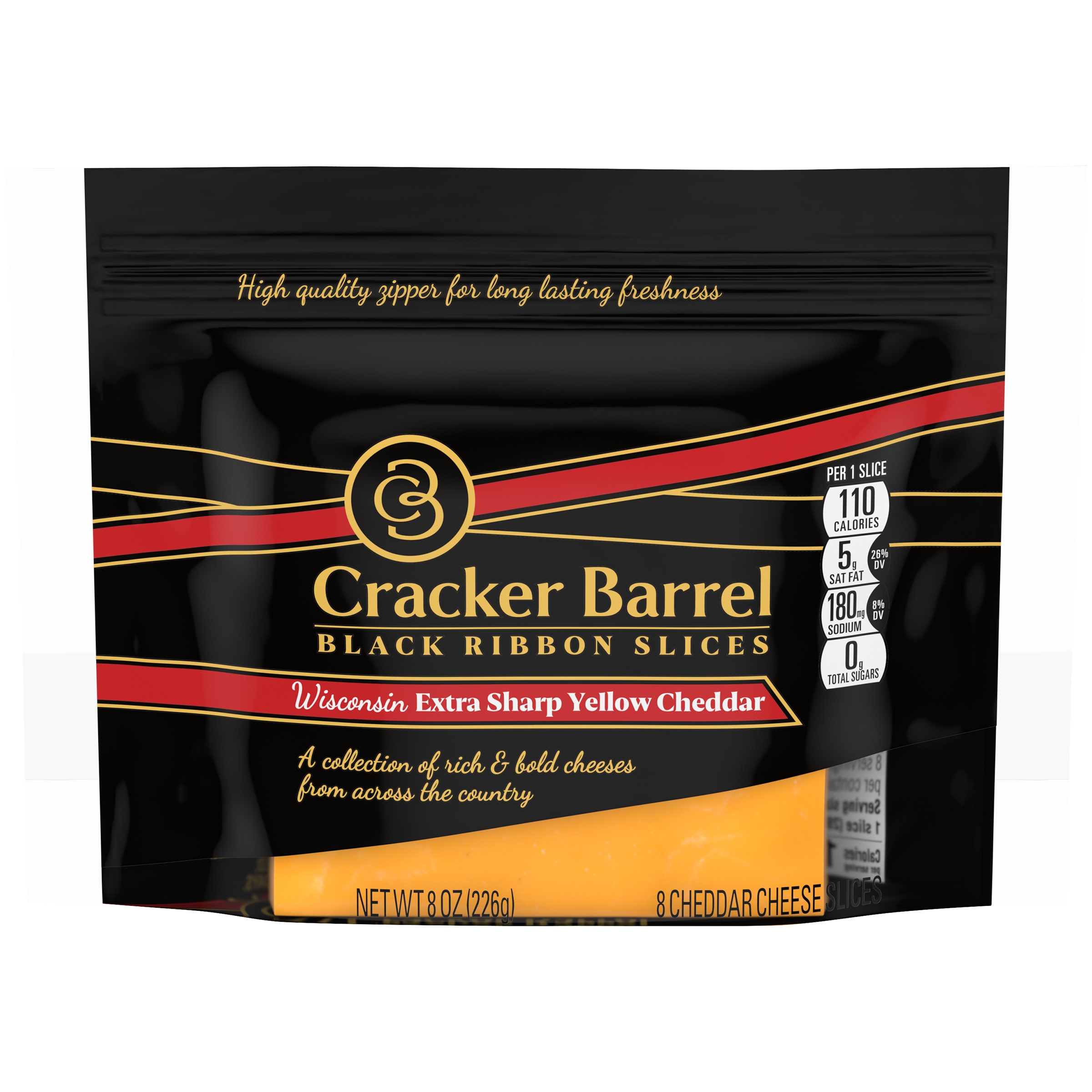 Cracker Barrel Black Ribbon Natural Slices Wisconsin Extra Sharp Yellow Cheddar Cheese Slices are part of our collection of rich and bold cheeses sourced from different regions of the US. This Extra Sharp Cheddar is fresh cut cheese directly from Wisconsin that brings a rich and bold taste. These cheese slices make for an irresistible snack you and your guests will love. Whether you are entertaining a room full of friends or wanting a cheese snack to go, these cheddar cheese slices are great for a quick snack. Cracker Barrel cheese slices pair well with deli meat or crackers. Enjoy a tasty sandwich, or simply eat by itself. One 8 ounce package of Cracker Barrel Cheddar Cheese Slices comes with 8 thick fresh cut cheese slices, while the Zip-Pak seal on every package makes for easy storage and helps lock in flavor.