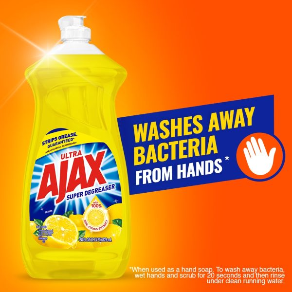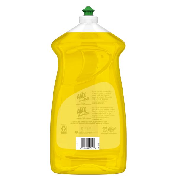 Delight in the fresh, clean aroma of AJAX’s Lemon while getting your dishes spotlessly clean. Dish soap, dish soap, dishwashing, hand dish soap, hand, moisturizing, non-drying, cuts through grease, greasy, great scent, best, grime, pots, pans, gentle, environmentally friendly, stubborn food, cleaning, scrub, safe, value, concentrated, detergent, gentleness, soapy, mild scent, oil, cutting grease, thick, stuck-on food, detergent. Made with strength and water, dissolves ingredients, ammonium lauryl sulfate removes dirt and oil, ammonium laureth sulfate or ammonium C12-15 alkyl sulfate removes dirt and oil, ammonium C12-15 pareth sulfate removes dirt and oil, sodium chloride controls thickness, lauramidopropylamine oxide removes dirt and oil, poloxamer 124 controls thickness, fragrance adds a fresh scent, pentrasodium pentetate maintains stability and performance, methylisothiazolinone maintains shelf life, benzisothiazolinone maintains shelf life, colorants adds color to the product. Washes Away Bacteria from, Hands. When used as a hand soap. Wash away dirt and bacteria for good hand hygiene. Healthcare agencies recommend wetting hands with clean water, lather, scrubbing for 20 seconds, and rinsing. America’s no:1 Value Dish Brand, based in part on data reported by Nielsen through the Nielsen Retail Measurement Service/Scan track for the Light Duty Liquid Dish Value category for the latest 52 weeks ending in 9/19/20 in the total U.S. market XAOC, according to the Nielsen standard product hierarchy.
