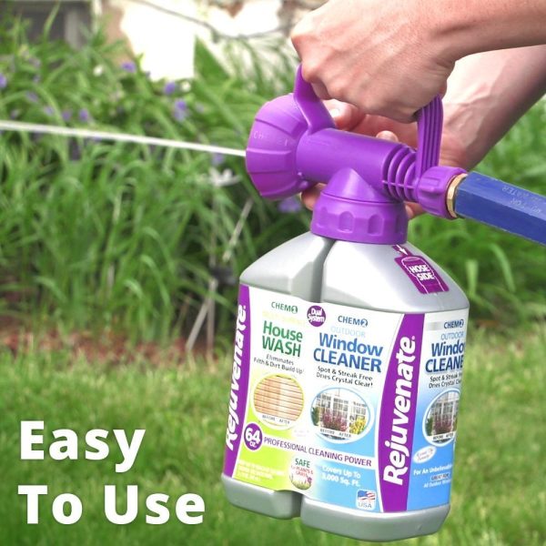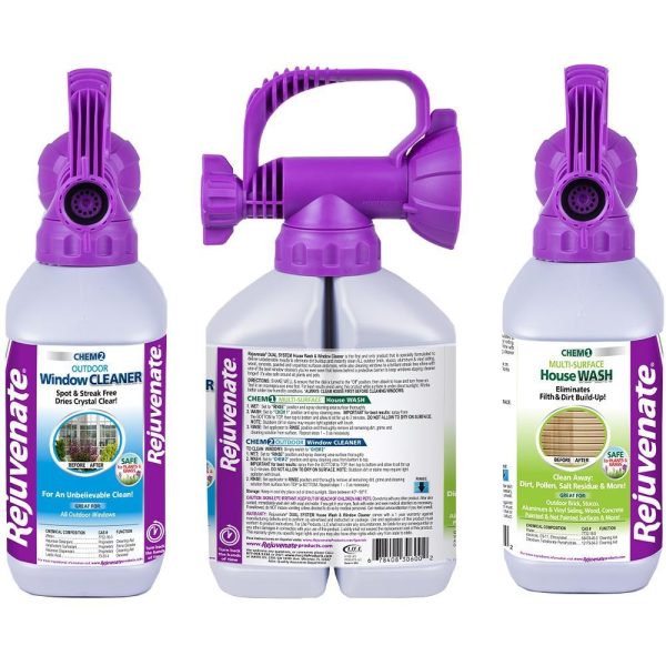 Neighbors will come from miles and want to know how you cleaned so much, so fast, without hard scrubbing, without a ladder, without a squeegee and without breaking a sweat. Rejuvenates Outdoor MULTI-Surface House Wash and Window Cleaner is a concentrated formula that instantly removes stains dirt, debris, bird droppings and wind grime from outdoor windows and siding without any hard scrubbing. The formula is simple; rinse, spray on formula, wait 2-minutes and rinse. Repeat as needed or scrub to agitate areas with layers of caked-on dirt. The best way to wash windows is never having to get on a ladder and clean up to 40 remove dirt, pollen, salt residue and other stuck on messes. This window cleaner leaves behind a streak-free shine. Its also effective to use on vinyl siding, wood siding, brick, stucco, painted walls and exterior window cleaning.