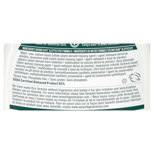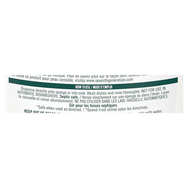 Tough on dirty dishes, not the hands that wash them. Seventh Generation Free & Clear Liquid Dish Soap cuts through grease and powers away tough residue without the use of fragrances, dyes, phosphates, or triclosan. This hypoallergenic fragrance-free dishwashing soap is dermatologist tested and made for sensitive skin. It?s gluten free, too. Our safe and effective formula is 100% biodegradable, made with plant-based ingredients and is designed with safety in mind. Seventh Generation has been thoughtfully formulating safe and effective plant-based products that work. Really well. Our dish liquid and dishwasher detergent uses powerful plant-based ingredients to break down tough residue and lift away food, leaving your dishes sparkling clean. Yes, even those fussy egg stains. Based in Vermont, Seventh Generation is proud to be a Certified B Corporation. B Corps are certified to be better for workers, better for communities, and better for the environment. You may also notice a cute Leaping Bunny seal on our products. That means we never test our products on animals and our products do not contain animal-based ingredients. We design our dish soap and dish detergent to be safe for people, their homes, and the environment. By choosing Seventh Generation products, you?re joining us in nurturing the health of the next seven generations. Safe when used as directed.