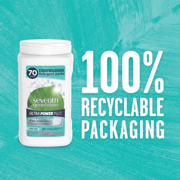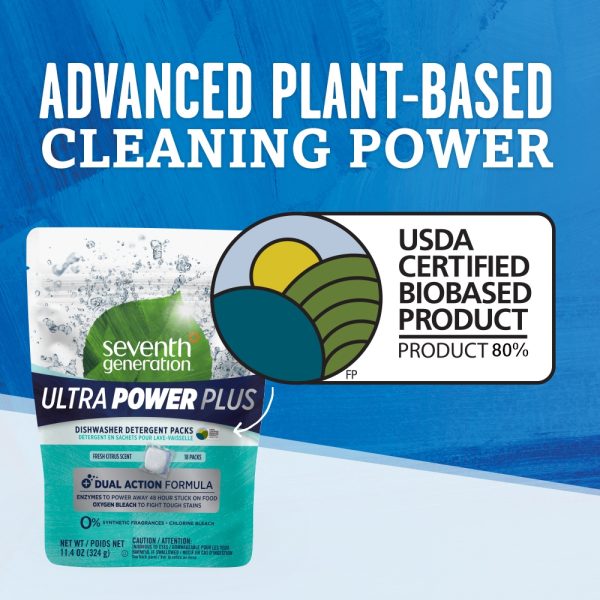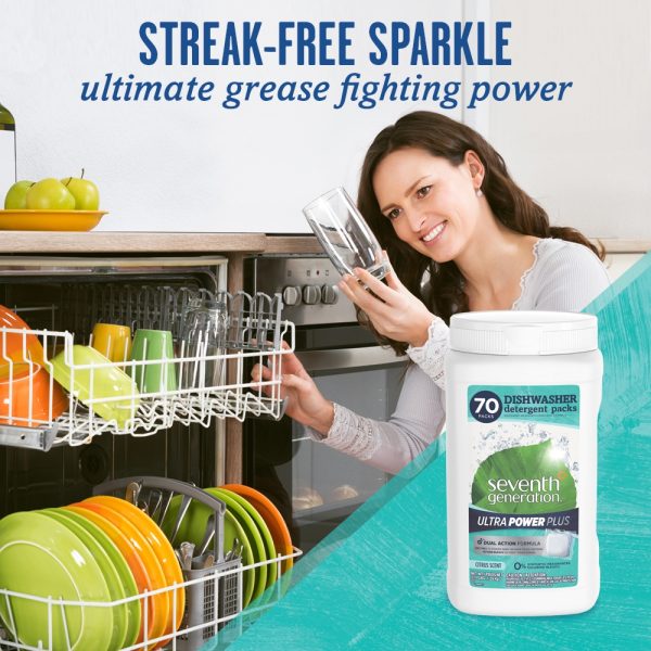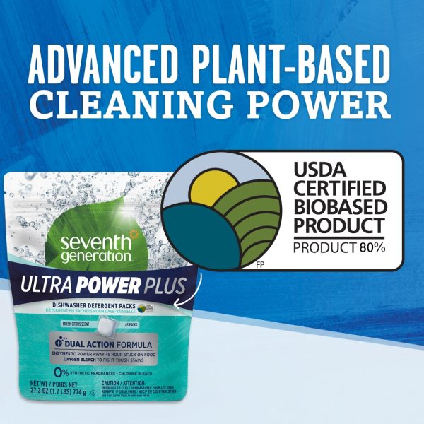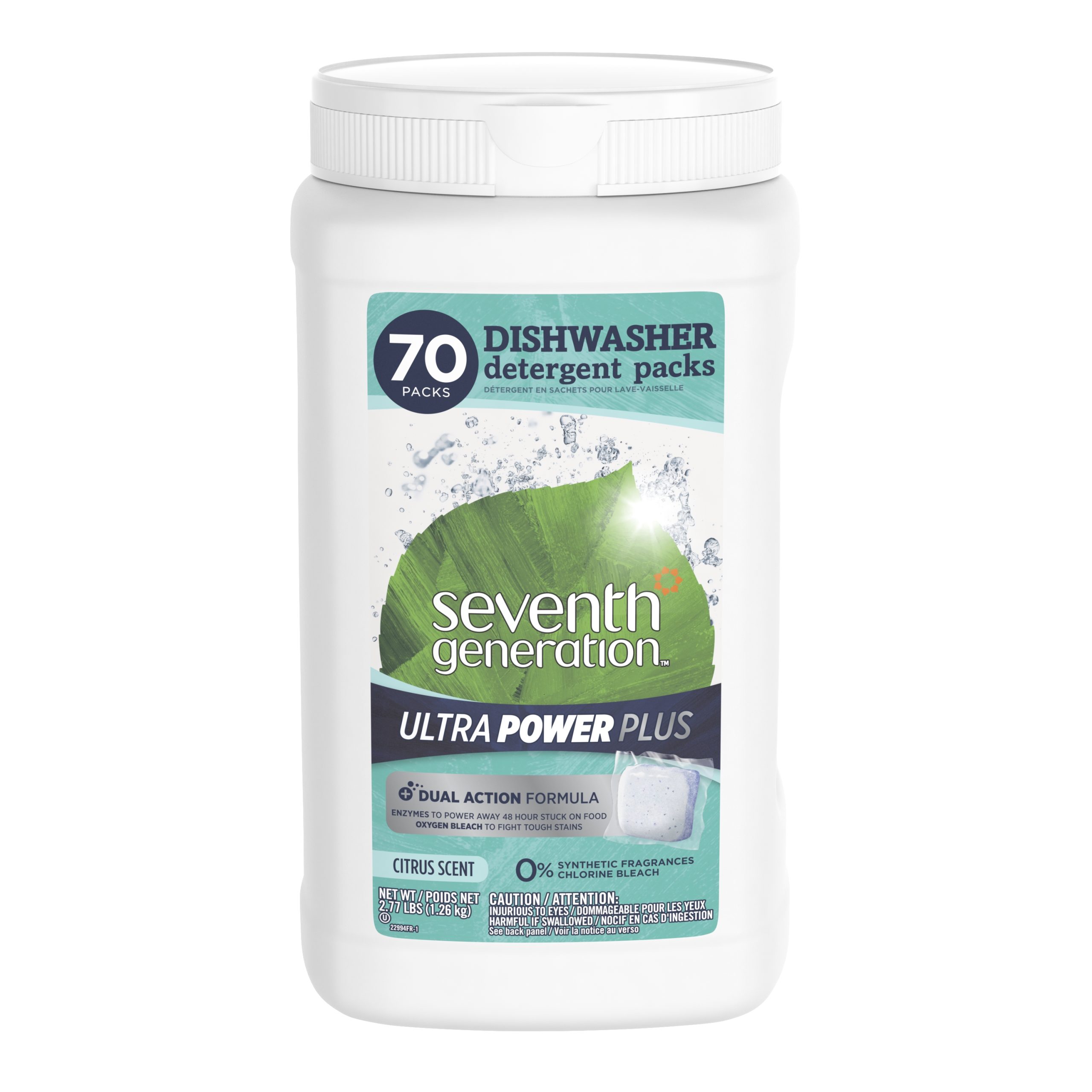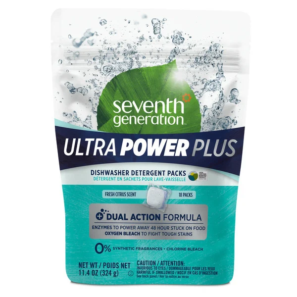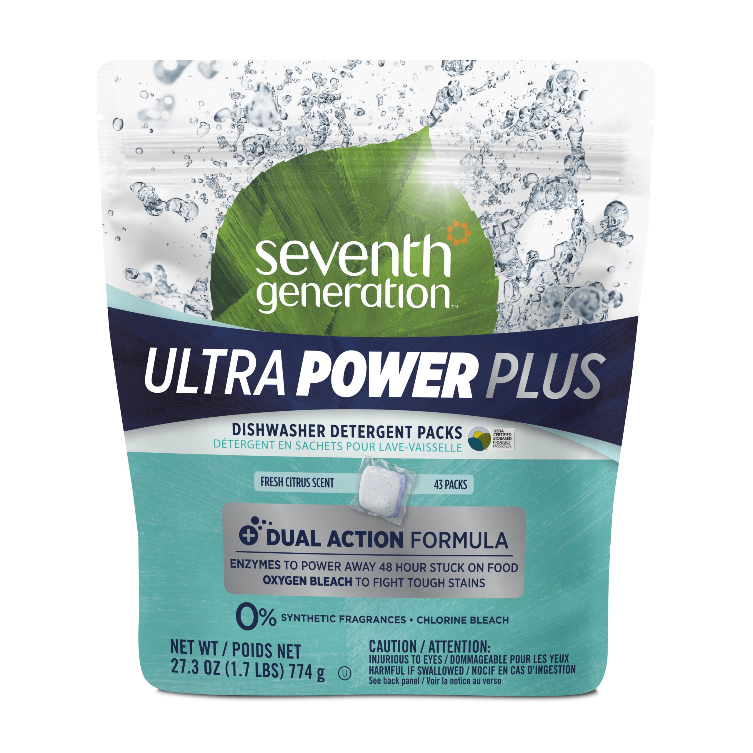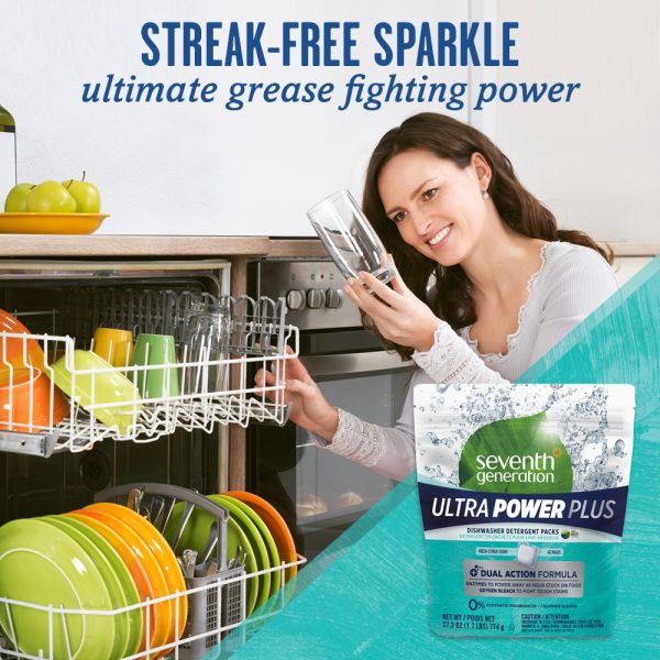 Have a tough job. We have an easy answer. Ultra Power Plus Seventh Generation Dish Detergent Packs feature our powerful grease-fighting formula to leave your dishes with a sparkling, streak-free shine. This dish detergent?s hardworking enzymes power away 48-hour stuck-on food, while oxygen bleach fights tough stains ? all without the use of synthetic fragrances, dyes, phosphates, or chlorine bleach. Our single dose dishwasher detergent pods come in a dissolvable PVA film that can be tossed right in the dishwasher for a hassle-free alternative to traditional powders and gels no need to unwrap or measure. Because when things get messier, you shouldn?t have to work harder. That?s our job. For more than 25 years, Seventh Generation has been thoughtfully formulating safe and effective plant-based products that work. Really well. Our dishwasher soap uses powerful plant-based ingredients like surfactants and enzymes to break down tough residue and lift away food leaving your dishes sparkling clean. So how does it all work. The dishwasher tablets enzymes cut through grease and food by breaking down starch and protein-based residue while the surfactants remove dirt and grease by holding the molecules in suspension so they can wash away. Yes, even those fussy egg stains. Based in Vermont, Seventh Generation is proud to be a Certified B Corporation. B Corps are certified to be better for workers, better for communities, and better for the environment. By choosing Seventh Generation products, you?re joining us in nurturing the health of the next seven generations.