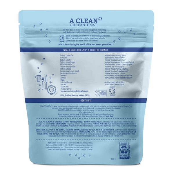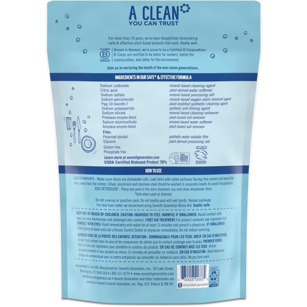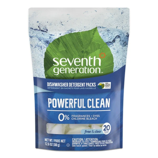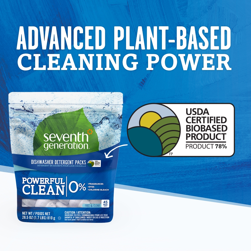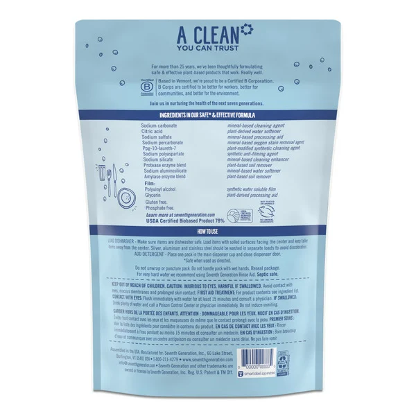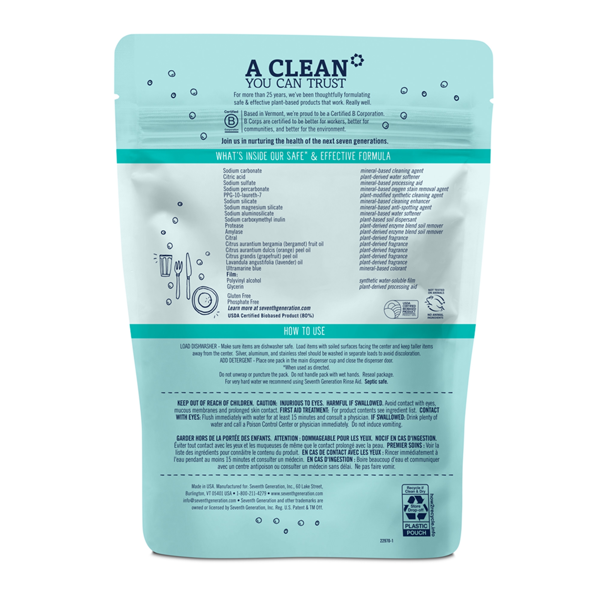 When life is busy, don?t let messes slow you down. Seventh Generation dishwasher packs offer a convenient and powerful clean that blasts through tough residue to leave your dishes streak-free with just one wash, no pre-rinse necessary. Our single dose dishwasher packs come in a dissolvable PVA film that can be tossed right into the dishwasher for a hassle-free alternative to traditional powders and gels ? no need to unwrap or measure. Seventh Generation Free and Clear Dishwasher Detergent Packs are made with plant-based ingredients free of fragrances, dyes, phosphates, and chlorine bleach. Because trust us, we can handle the job without them. For more than 25 years, Seventh Generation has been thoughtfully formulating safe and effective plant-based products that work. Really well. Our dish detergent uses powerful plant-based ingredients like surfactants and enzymes to break down tough residue and lift away food, leaving your dishes sparkling clean. So, how does it all work. The enzymes cut through grease and food by breaking down starch and protein-based residue while the surfactants remove dirt and grease by holding the molecules in suspension, so they can wash away. Yes, even those fussy egg stains. Based in Vermont, Seventh Generation is proud to be a Certified B Corporation. B Corps are certified to be better for workers, better for communities, and better for the environment. By choosing Seventh Generation dishwasher soap products, you?re joining us in nurturing the health of the next seven generations.