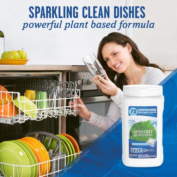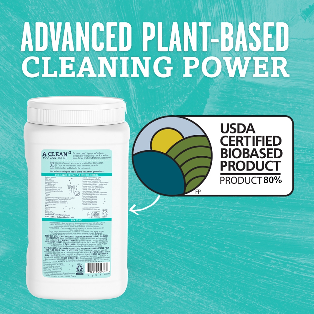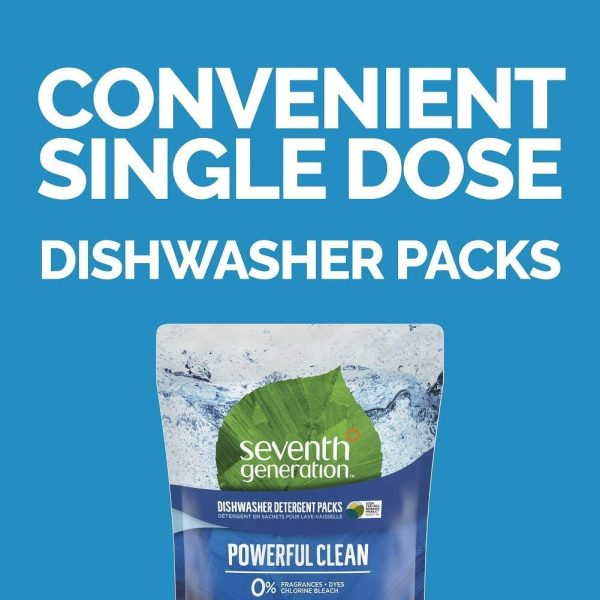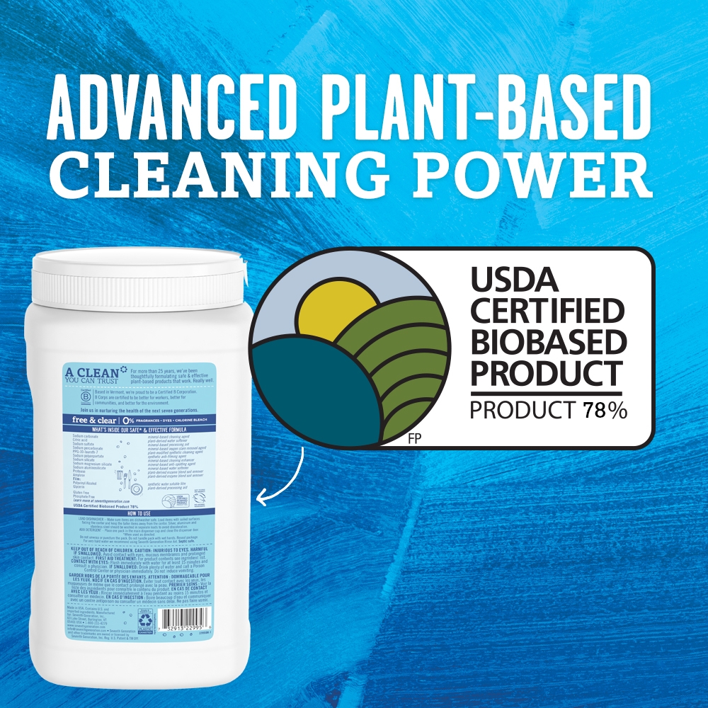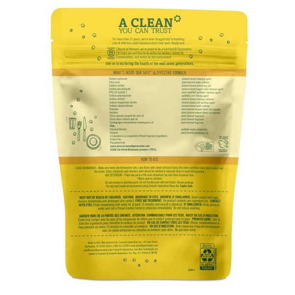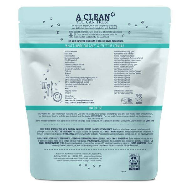 When life is busy, don?t let messes slow you down. Seventh Generation dishwasher packs offer a convenient and powerful clean that blasts through tough residue to leave your dishes streak-free with just one wash, no pre-rinse necessary. Our single dose dishwasher packs come in a dissolvable PVA film that can be tossed right into the dishwasher for a hassle-free alternative to traditional powders and gels ? no need to unwrap or measure. Seventh Generation Free and Clear Dishwasher Detergent Packs are made with plant-based ingredients free of fragrances, dyes, phosphates, and chlorine bleach. Because trust us, we can handle the job without them. For more than 25 years, Seventh Generation has been thoughtfully formulating safe and effective plant-based products that work. Really well. Our dish detergent uses powerful plant-based ingredients like surfactants and enzymes to break down tough residue and lift away food, leaving your dishes sparkling clean. So, how does it all work. The enzymes cut through grease and food by breaking down starch and protein-based residue while the surfactants remove dirt and grease by holding the molecules in suspension, so they can wash away. Yes, even those fussy egg stains. Based in Vermont, Seventh Generation is proud to be a Certified B Corporation. B Corps are certified to be better for workers, better for communities, and better for the environment. By choosing Seventh Generation dishwasher soap products, you?re joining us in nurturing the health of the next seven generations.