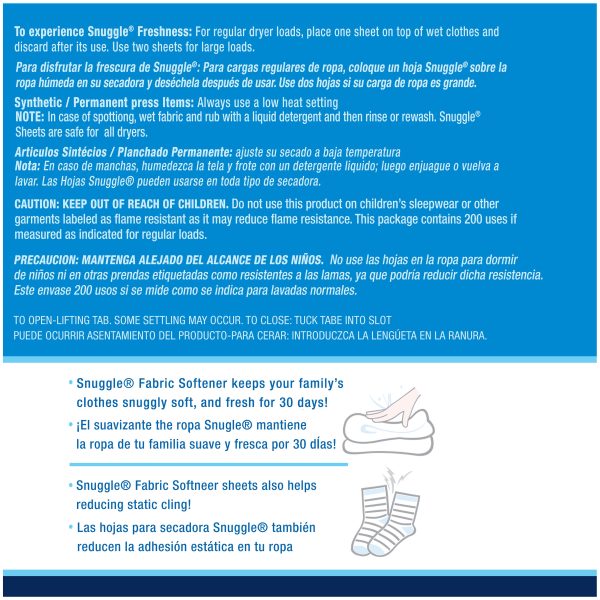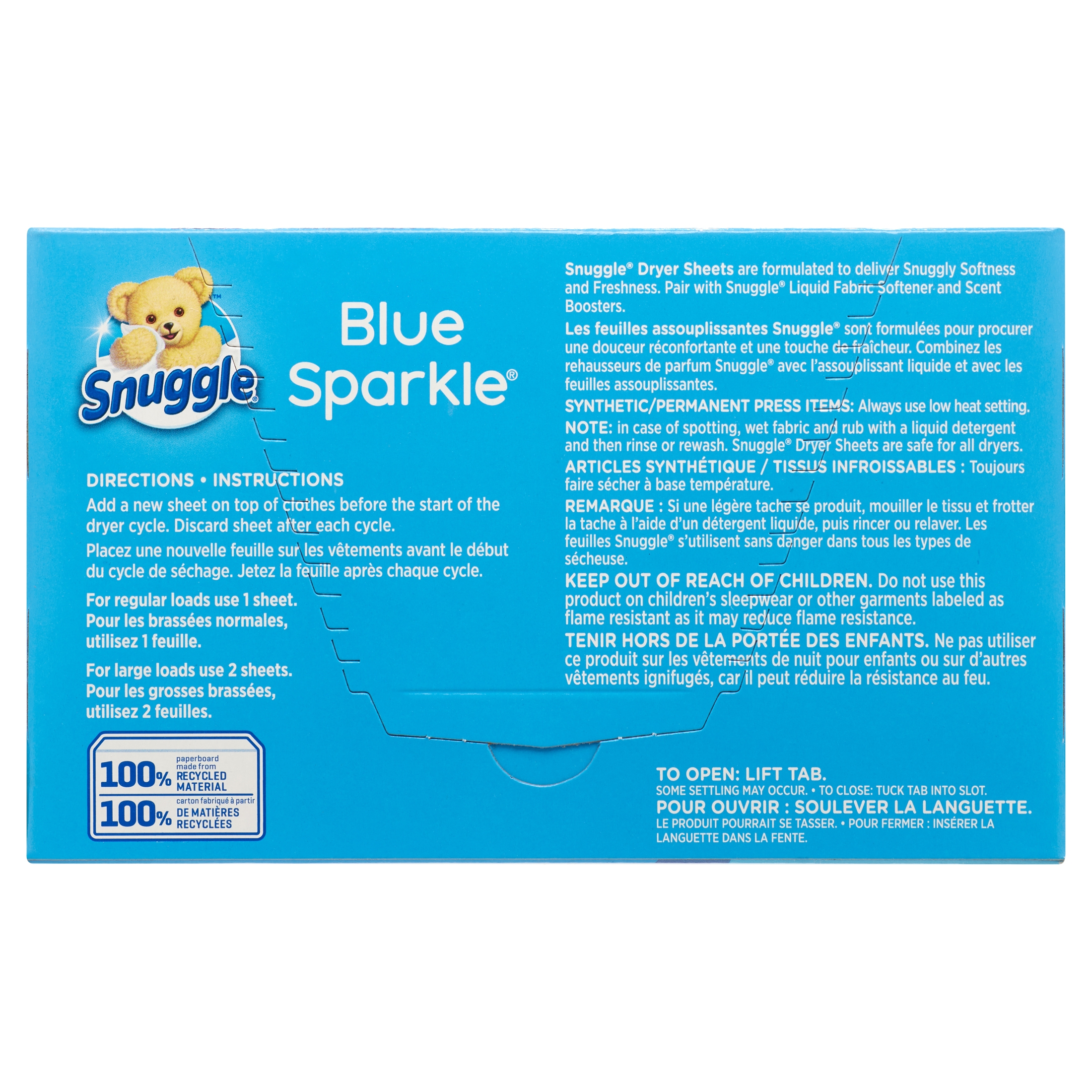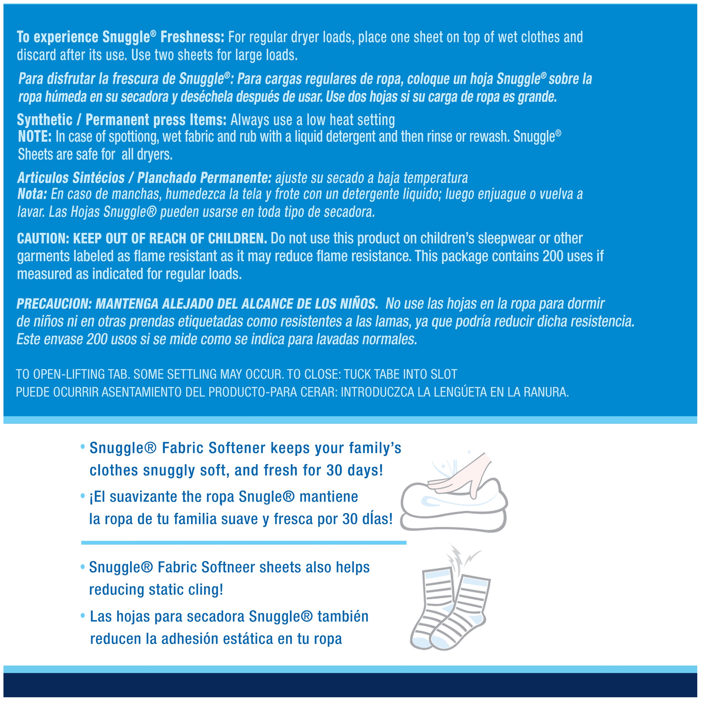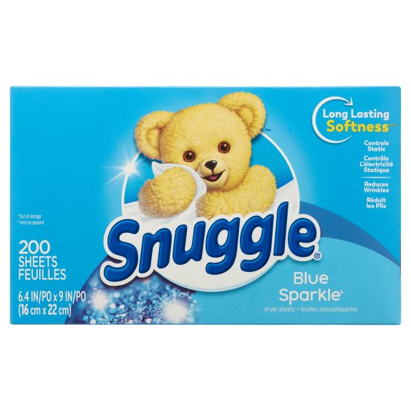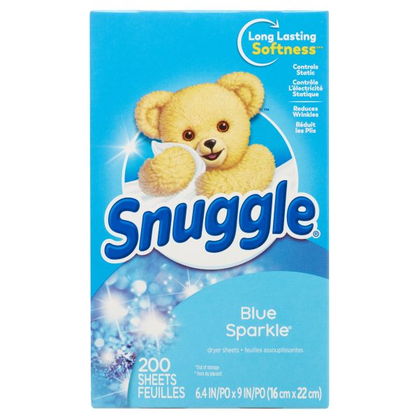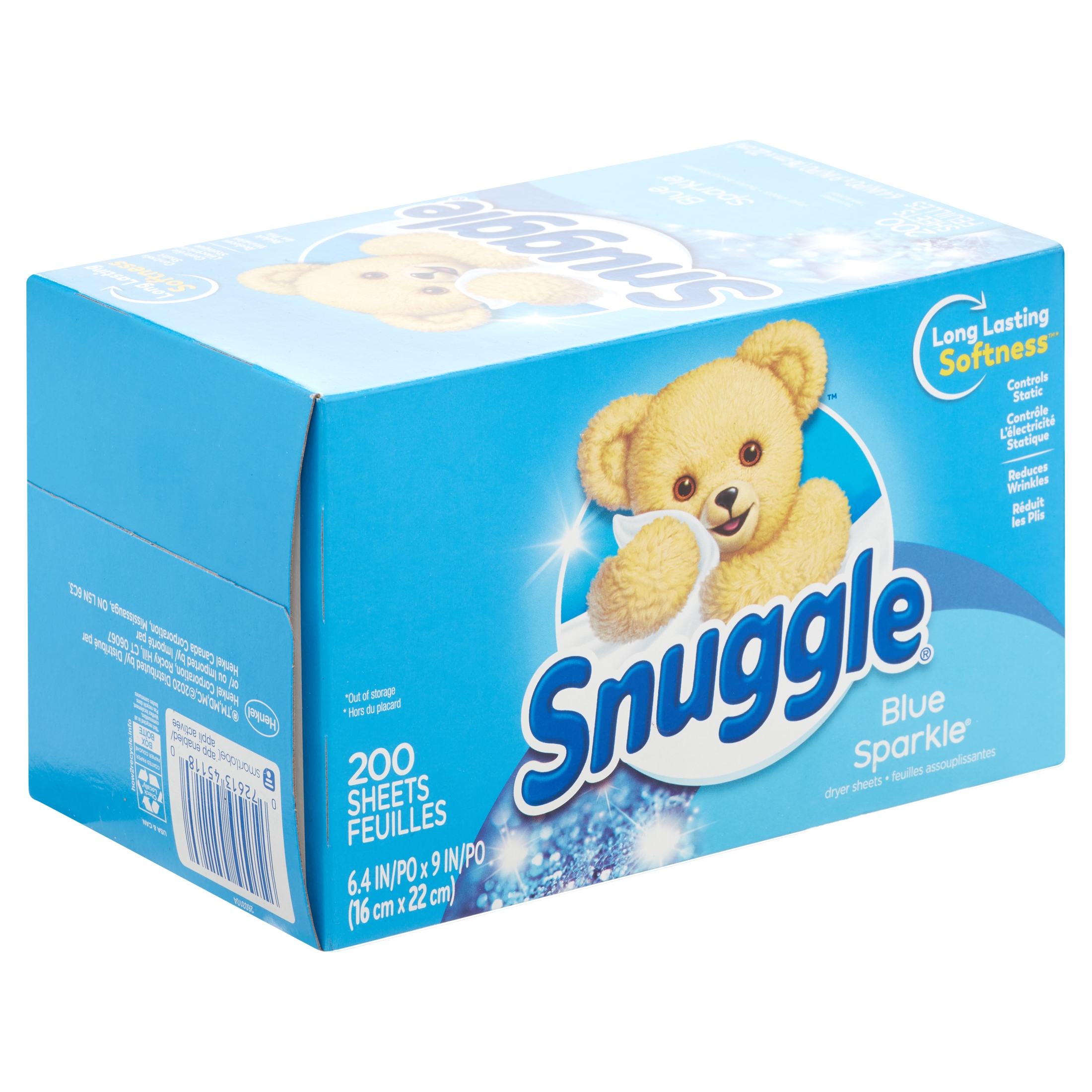 Snuggle’s original Blue Sparkle scent is a fresh and clean blend of white floral and bright green citrus notes that snuggle up to warm woody notes and soft musk for a comforting, long-lasting freshness your family will love. In addition to using in the dryer to make your clothes feel softer, dryer sheets can also be used in a variety of places like closets, gym bags, suitcases, and cars to make them smell fresh. For long-lasting freshness and static reduction, add a Snuggle brand dryer sheet to every load you dry. Place the sheet on top of wet clothes and start the dryer cycle as usual. Discard after use. Safe for standard and HE dryers. Includes one box of 200 dryer sheets.