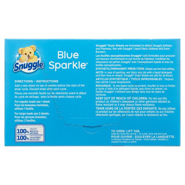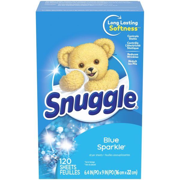 Snuggle’s original Blue Sparkle scent is a fresh and clean blend of white floral and bright green citrus notes that snuggle up to warm woody notes and soft musk for a comforting, long-lasting freshness your family will love. In addition to using in the dryer to make your clothes feel softer, dryer sheets can also be used in a variety of places like closets, gym bags, suitcases, and cars to make them smell fresh. For long-lasting freshness and static reduction, add a Snuggle brand dryer sheet to every load you dry. Place the sheet on top of wet clothes and start the dryer cycle as usual. Discard after use. Safe for standard and HE dryers. Synthetic/Permanent Press Items: Always use a low heat setting. Note: In case of spotting, wet fabric and rub with a liquid detergent and then rinse or rewash. Snuggle Sheets are safe for all dryers. To experience Snuggle Freshness: For regular dryer loads, place one sheet on top of wet clothes and discard after its use. Use two sheets for large loads. Includes one box of 120 dryer sheets.
