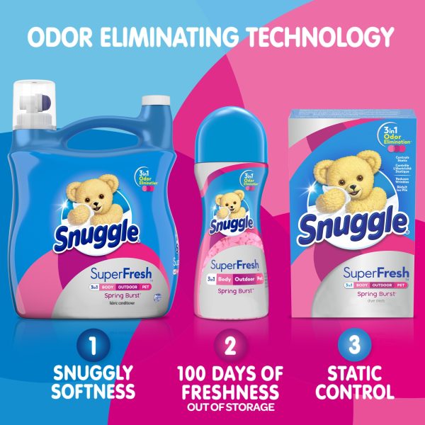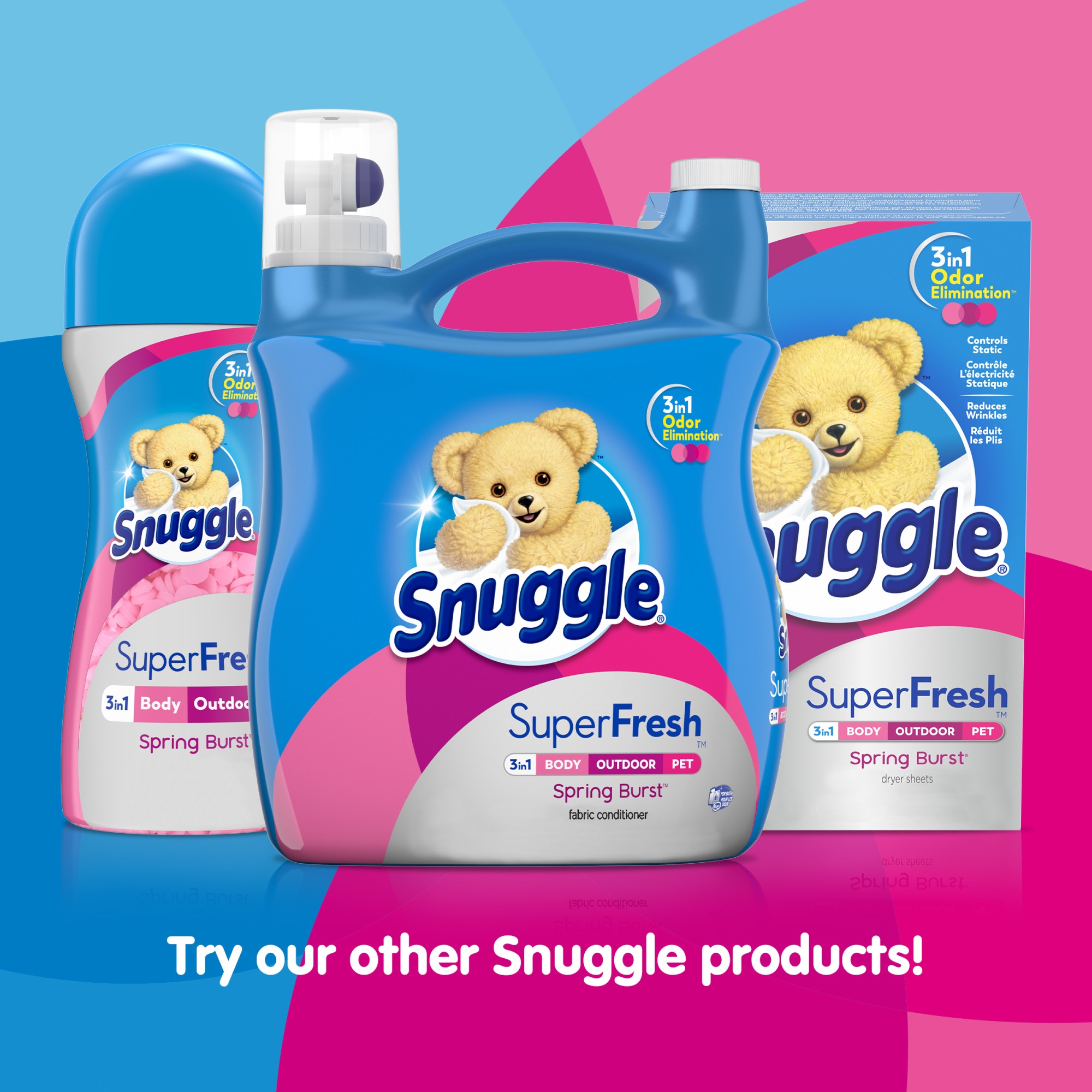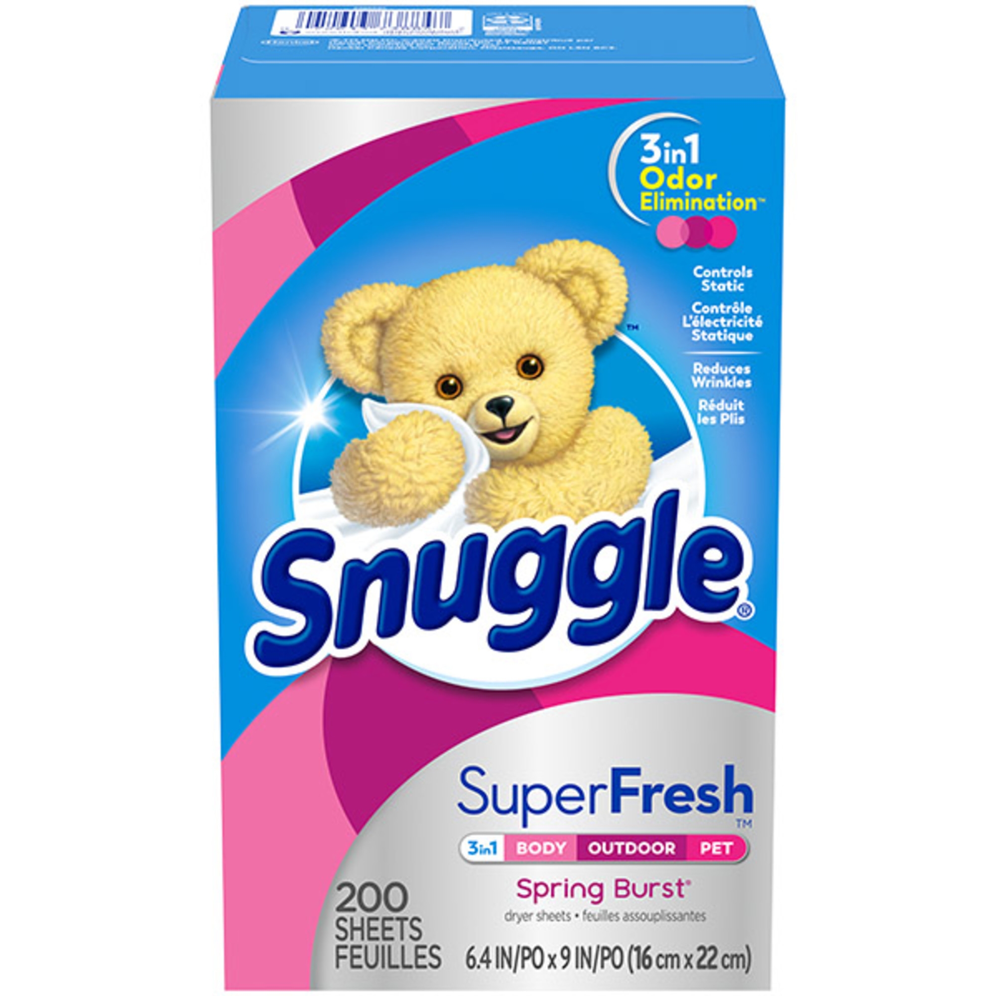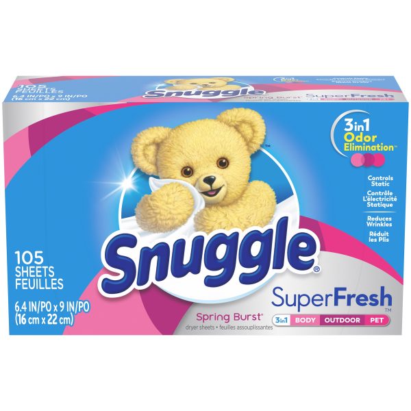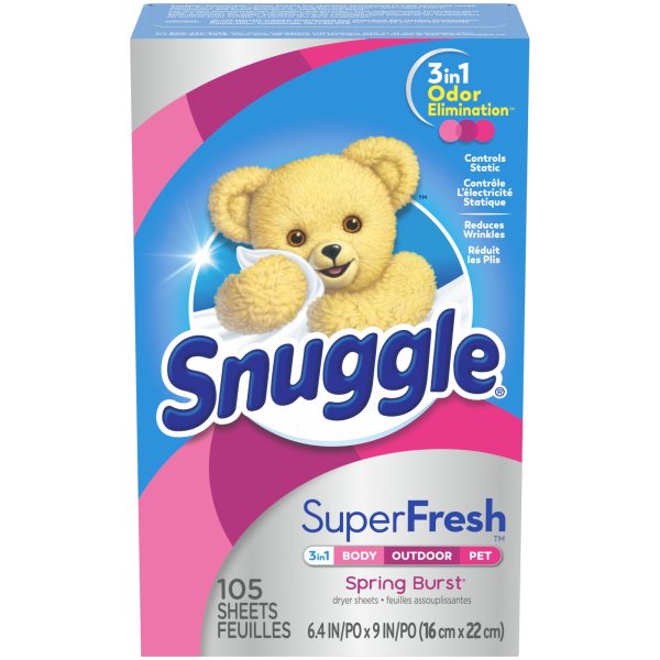 Snuggle Plus SuperFresh features the Snuggly softness you love, plus odor eliminating technology. It doesn’t just mask tough odor, it helps eliminate it and releases Snuggly freshness. Snuggle Plus SuperFresh is the first-ever fabric conditioner & dryer sheet regimen designed to help eliminate tough odor and keep your favorites fresh. For long-lasting freshness and static reduction, add a Snuggle brand dryer sheet to every load you dry. Place the sheet on top of wet clothes and start the dryer cycle as usual. Discard after use. Safe for standard and HE dryers. This package includes one box of 105 Snuggle Plus SuperFresh Spring Burst dryer sheets, enough for 105 loads.
