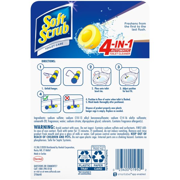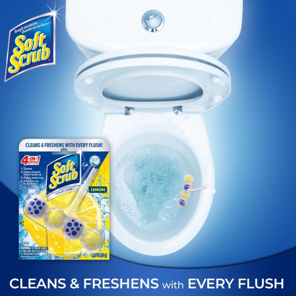 Soft Scrub 4-in-1 Toilet Care cleans your toilet bowl and prevents future build-up. Use Soft Scrub 4-in-1 rim hangers to fight toilet ring and freshen for up to 4 weeks. Each Soft Scrub 4-in-1 rim hanger has a fragrance boost to give a boost of freshness to the last flush. Just apply to the rim of your toilet and enjoy the cleaning and freshening benefits for up to four weeks. Warning: Eye and skin irritant. Harmful if swallowed. Avoid contact with eyes and skin. Do not ingest. First aid: Eyes/skin — For eye contact, hold eye open and rinse slowly and gently with water for at least 15 minutes. Seek medical attention if irritation develops. If swallowed, call a doctor immediately. Keep children and pets away from product. Directions: 1. For best results, clean toilet bowl thoroughly. 2. Take cube out of package. Do not remove protective wrap on cube (it is water soluble). 3. Remove lid from toilet tank and flush. When water is low, drop cube in tank near side wall away from water valve opening on bottom. 4. Wait 10 minutes before flushing again. Note: Once the water is no longer blue, cube is gone. *Each cube lasts up to 4 weeks. This package contains 2 rim hanger in Soft Scrub’s Lemon scent.
