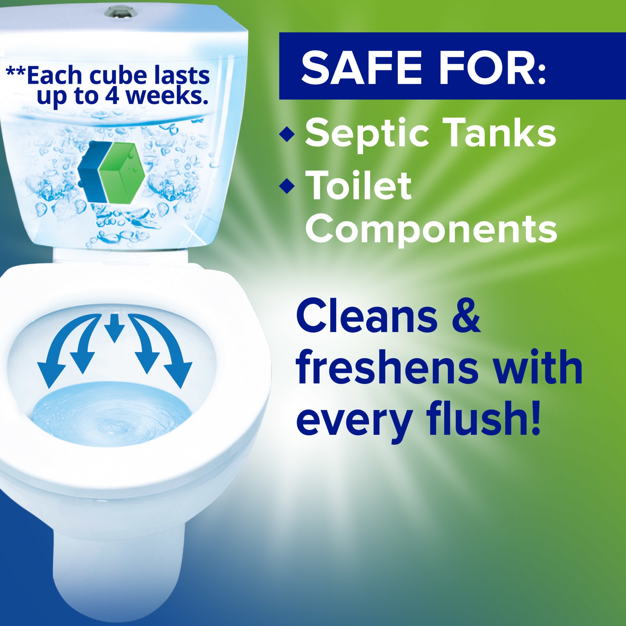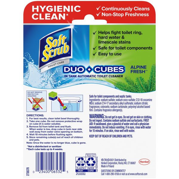 Soft Scrub Duo-Cubes in-tank automatic toilet cleaner helps fight toilet ring, hard water, and limescale stains. Soft Scrub Duo-Cubes are easy to use and safe for toilet components. Just drop a Soft Scrub Duo-Cube in the tank and enjoy cleaning and freshening benefits for up to four weeks! This package contains 2 Duo-Cubes in Soft Scrub’s Alpine Fresh scent for a total of 8 weeks of cleaning. Directions: 1. For best results, clean toilet bowl thoroughly. 2. Take cube out of package. Do not remove protective wrap on cube (it is water soluble). 3. Remove lid from toilet tank and flush. When water is low, drop cube in tank near side wall away from water valve opening on bottom. 4. Wait 10 minutes before flushing again. Note: Once the water is no longer blue, cube is gone. *Each cube lasts up to 4 weeks.