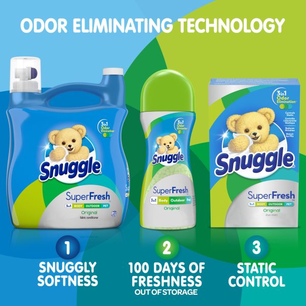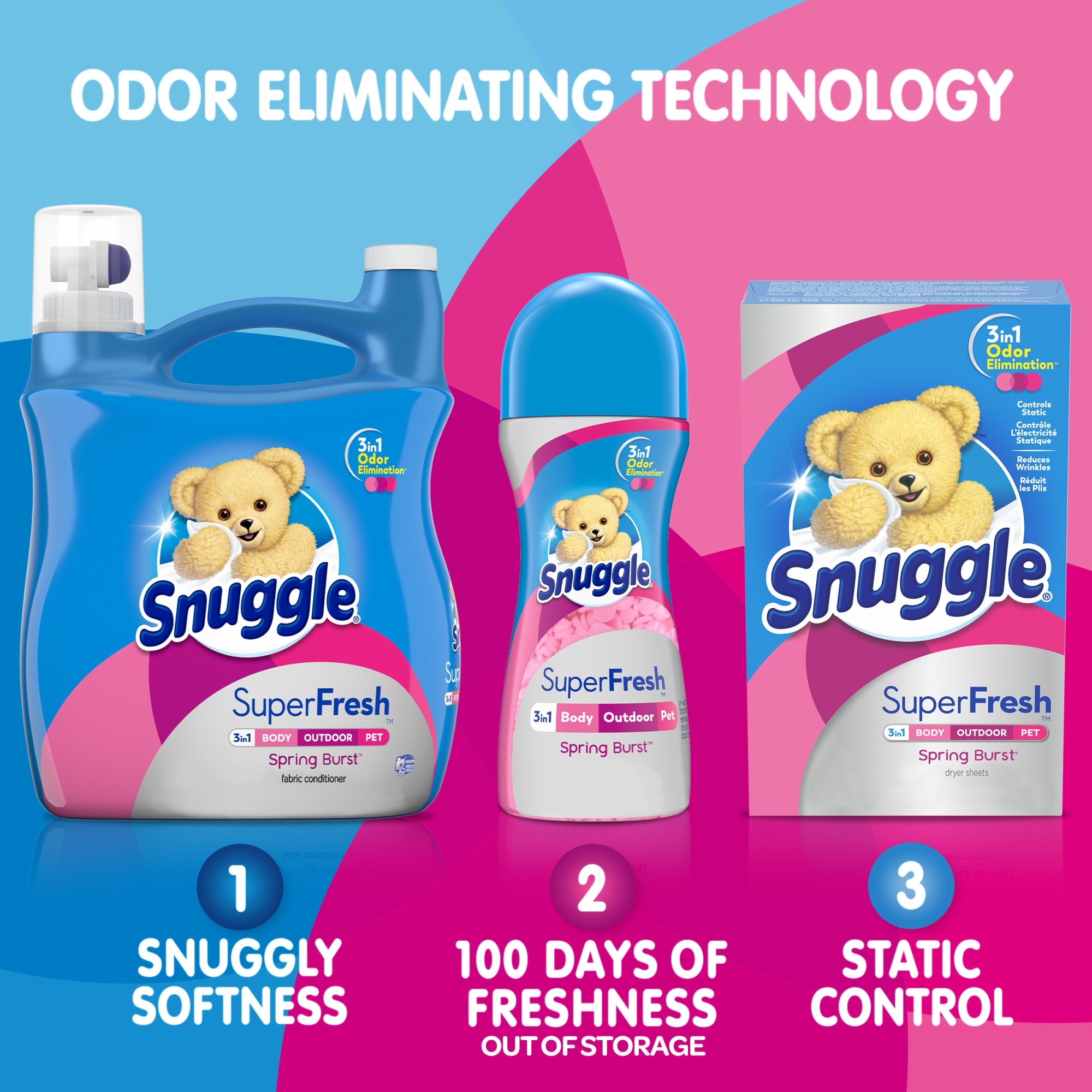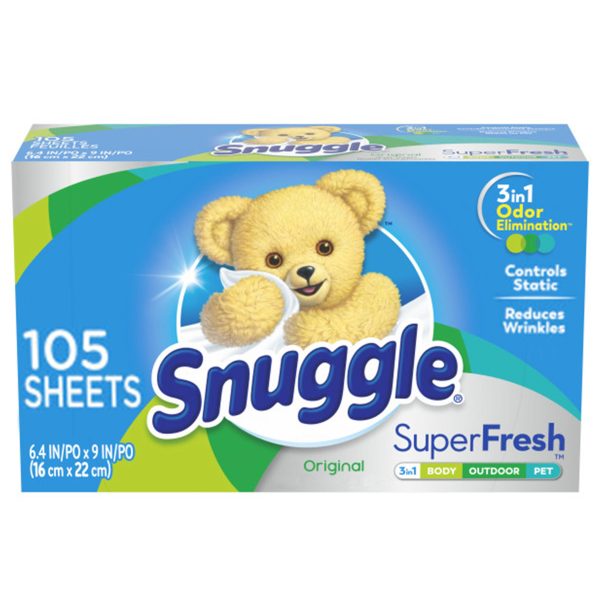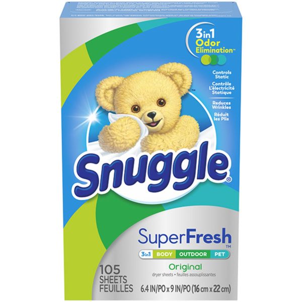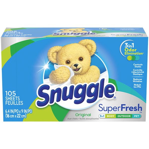 Snuggle Plus SuperFresh fabric conditioner dryer sheets don’t just mask tough odor, they help eliminate it and provide long-lasting freshness! Enjoy the Snuggle benefits you love like static control and lint prevention plus specially formulated odor eliminating technology that attacks tough odors like body, pet, active, damp and outdoor odors. Winner of the 2017 Product of the Year award, Original is our first scent in the our line of odor fighting variants. Try our odor fighting regimen use SuperFresh Original liquid fabric softener, Snuggle Scent Shakes SuperFresh Original, and SuperFresh Original dryer sheets. This package includes one box of 105 Snuggle Plus SuperFresh Original dryer sheets, enough for 105 loads.