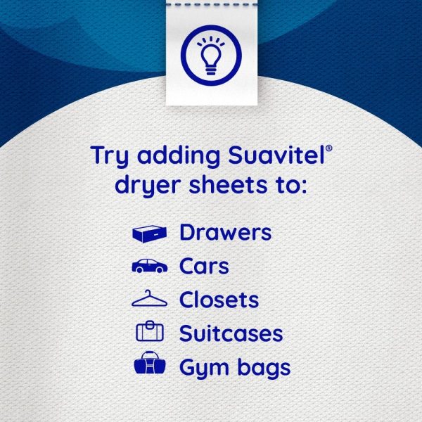 In today’s busy world, we could all use a product that does more. Suavitel Complete Fabric Conditioner Dryer Sheets have superior technology* that reduces static, reduces wrinkles, and provides Fast Dry benefits**, all while delivering irresistible freshness you and your family will love. * Provides Fast Dry benefit vs. Suavitel Regular Dryer Sheets **After 5 washes; tested on cotton and cotton polyester fabric; vs. detergent alone All you need to do is place a new sheet into the dryer onto the wet laundry at the start of the drying cycle. Try using more than one sheet in the dryer for an extra touch of freshness or for larger loads. Use a low heat setting for synthetic fibers. For faster and better drying, do not overfill the dryer and remember to discard used sheets prior to the next load. For that fresh Suavitel® scent in new places, try adding a Suavitel® dryer sheet to FRESHEN: drawers, cars, closets, suitcases, gym bags, & much more!