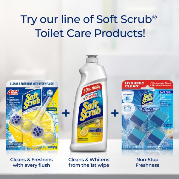 Soft Scrub 4-in-1 Toilet Care cleans your toilet bowl and prevents future build-up. Use Soft Scrub 4-in-1 rim hangers to fight toilet ring and freshen for up to 4 weeks. Each Soft Scrub 4-in-1 rim hanger has a fragrance boost to give a boost of freshness to the last flush.