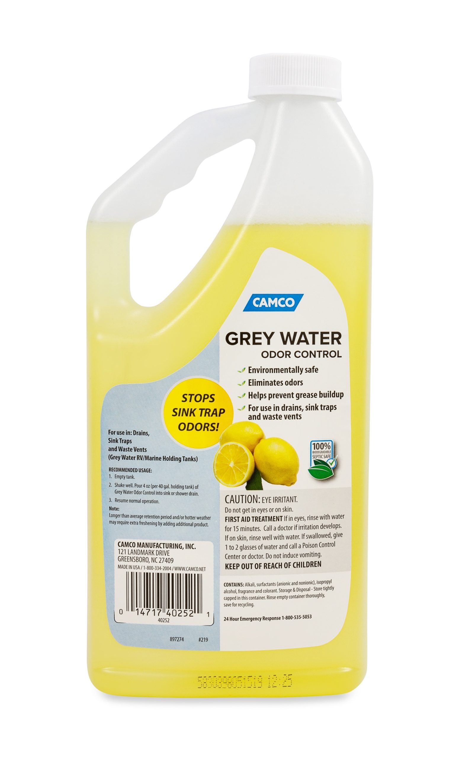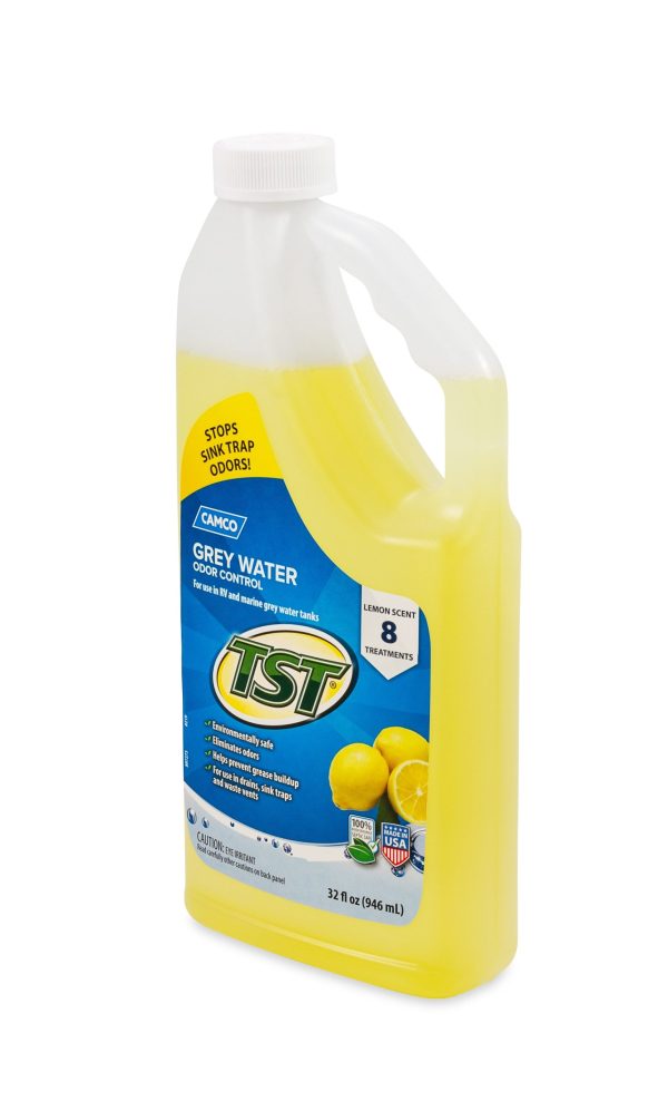 TST RV Grey Water Odor Control removes grease buildup in your grey water tank, sink and shower drains. This grey water holding tank deodorizer comes in a fresh lemon scent. Four ounces treats a 40-gallon holding tank. It is 100 percent biodegradable, does not contain formaldehyde, is environmentally safe and is non-staining. Product is safe for septic tanks.