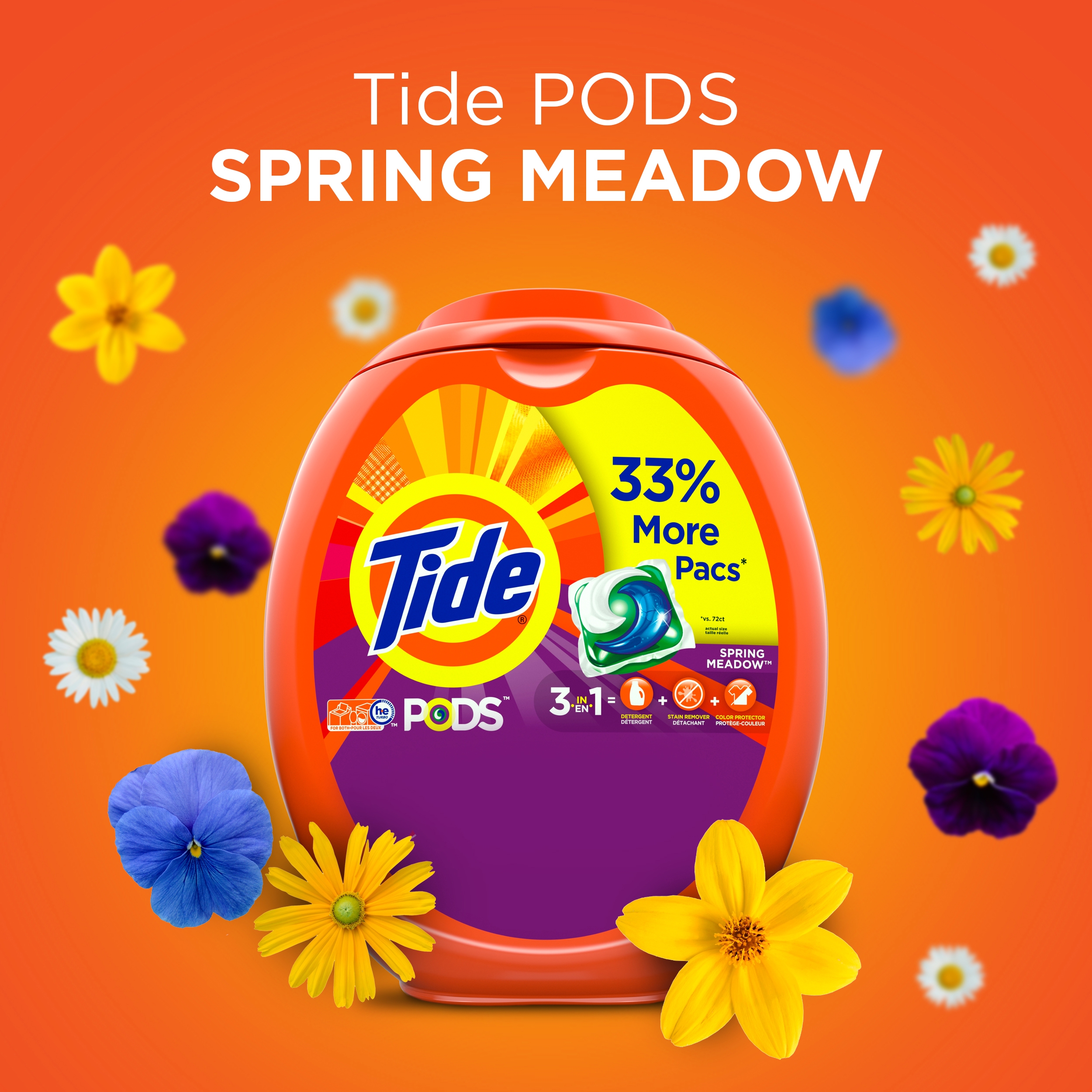 Tide PODS laundry detergent pacs offer surprisingly powerful clean in 1 step. Combining super concentrated detergent, extra odor fighters, and extra stain removers, each capsule cleans, freshens, and rejuvenates clothes for brighter brights and whiter whites. Small yet powerful, Tide PODS deliver cleaning power in a convenient, pre-measured unit dose form. Also, thanks to the special film and HE Turbo technology with quick-collapsing suds, the capsules dissolve completely in all temperatures and do not produce excess suds. The Spring Meadow scent is infused with with fresh floral notes to help keep your clothes smelling great. More than just a liquid in a pouch, Tide PODS delivers a surprisingly powerful clean in 1 step.