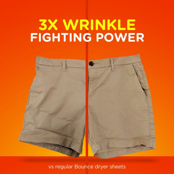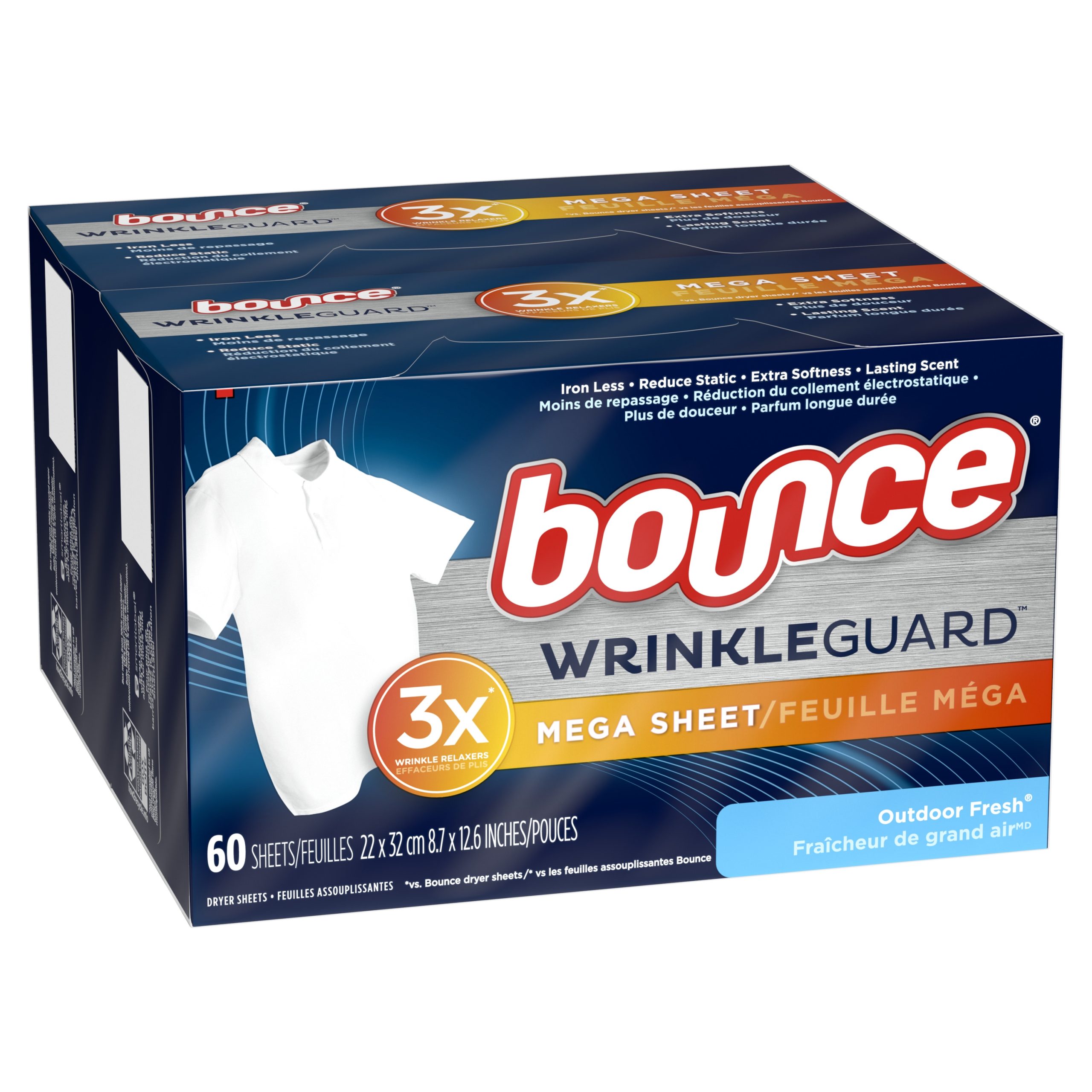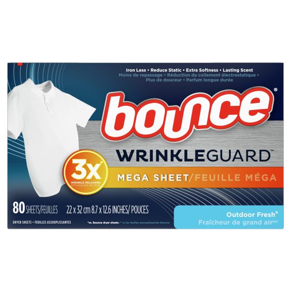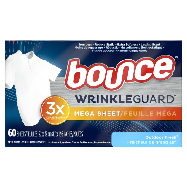 Tired of battling annoying wrinkles? Fight wrinkles the easy way with Bounce. Simply toss in our innovative Bounce WrinkleGuard Mega Sheet before every dryer load, to help prevent wrinkles on all dryer-safe fabrics. Mega Sheets are bigger, which means just one has 3X the wrinkle fighting ingredients* compared to the leading dryer sheet, helping fabrics come out of the dryer less wrinkly, softer, and fresh. Plus, it reduces static cling and leaves fabrics with an outdoor fresh scent you’ll love. Bounce WrinkleGuard Mega Sheets are your 4-in-1 solution for a better, less wrinkled laundry experience you can count on, right out of the dryer.*vs. leading dryer sheetDirections: Toss in 1 Mega Sheet per dryer load. Enjoy fabrics with less wrinkles, static and extra softness with an outdoor fresh scent, straight from the dryer.