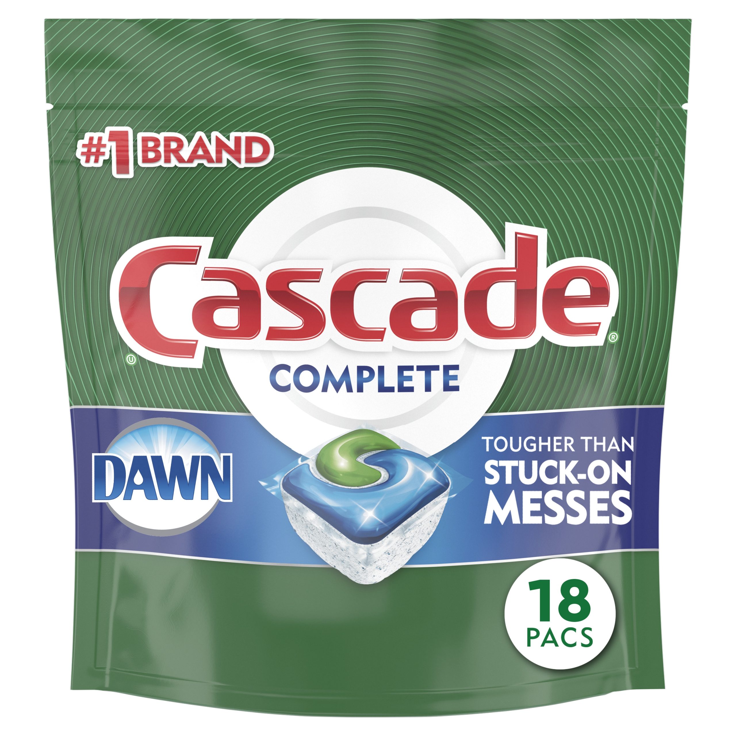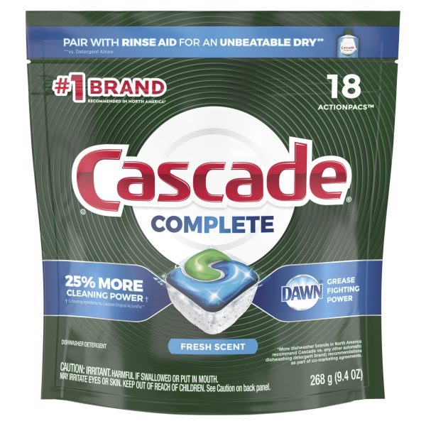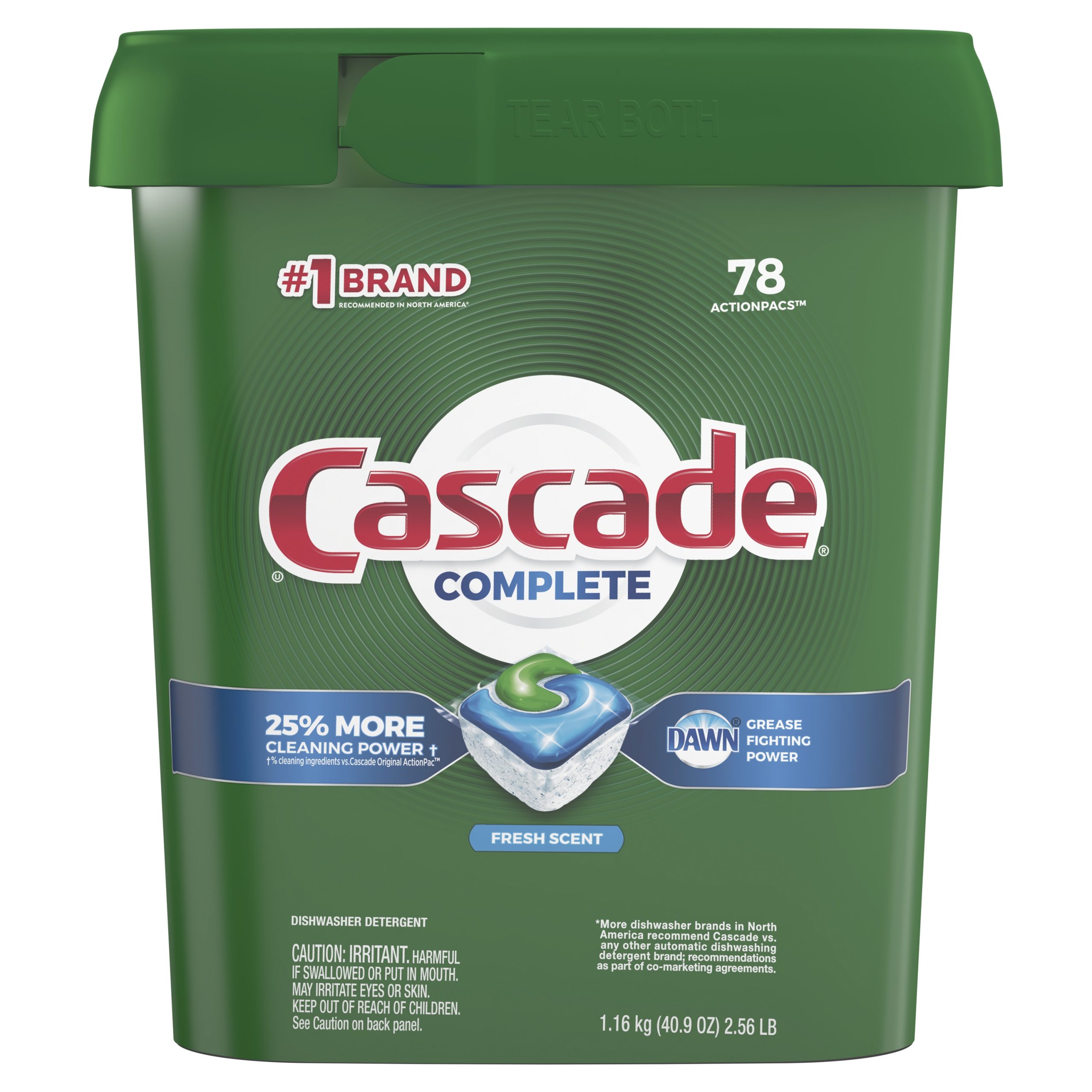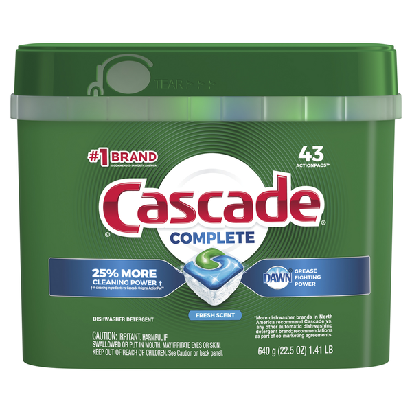 Cascade Complete ActionPacs dishwasher detergent powers away even 24-hour stuck-on messes for a complete clean. That’s because every ActionPac has 25% more Cleaning Power* (*% cleaning ingredients vs. Cascade Original) & is formulated with the grease-fighting power of Dawn dishwashing liquid. Cascade Complete ActionPacs are conveniently premeasured with no finicky wrapping-just toss in a pac. Cascade Complete ActionPacs are phosphate free. Plus, Cascade Complete ActionPacs dissolve quickly to unleash cleaning power early in the cycle. For best results, use Cascade Complete ActionPacs with Cascade Power Dry Rinse Aid for powerful drying and Cascade Dishwasher Cleaner to keep your dishwasher machine sparkling. Save up to 15 gallons of water per dishwasher load when you skip the pre-wash and run your dishwasher with Cascade Complete ActionPacs. Cascade is the #1 Recommended Brand in North America* *More dishwasher brands in North America recommend Cascade vs. any other automatic dishwashing detergent brand, recommendations as part of co-marketing agreements.