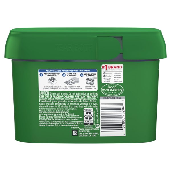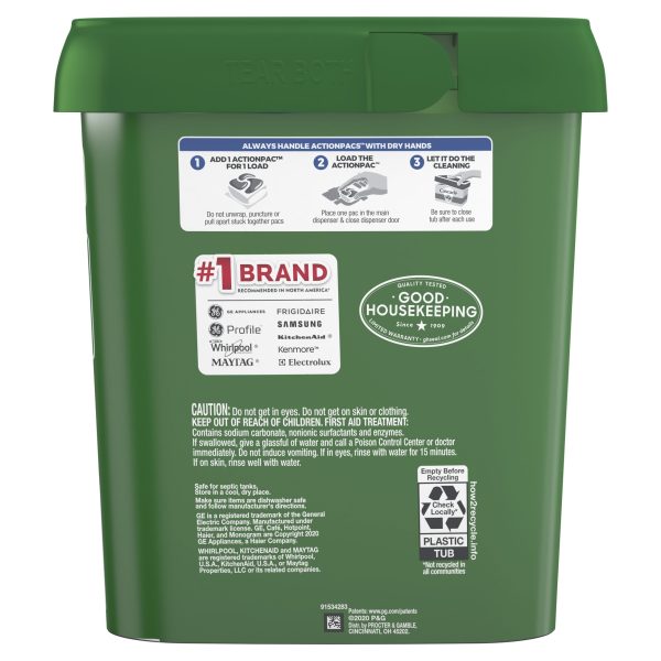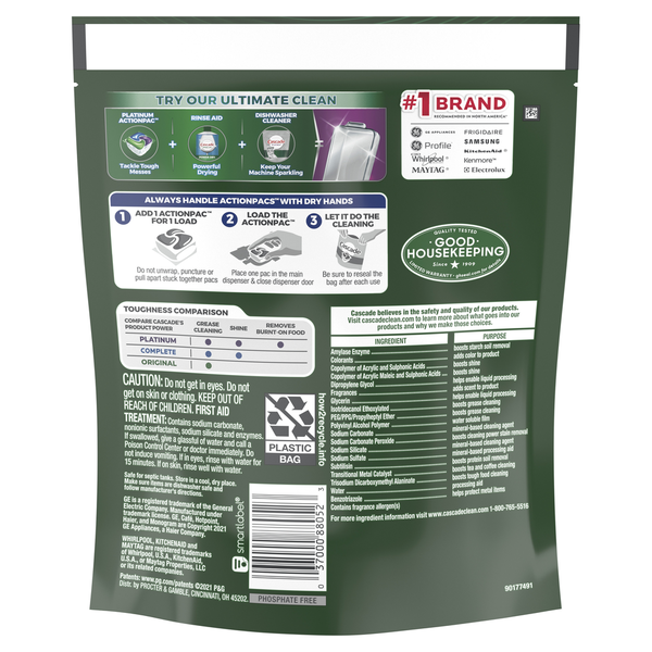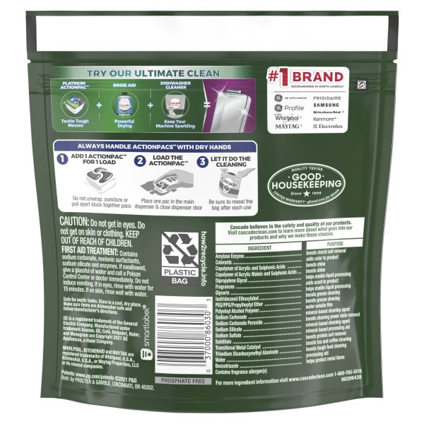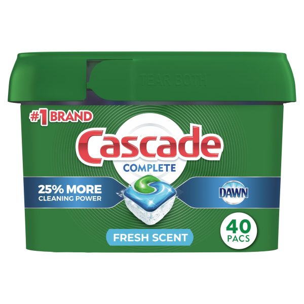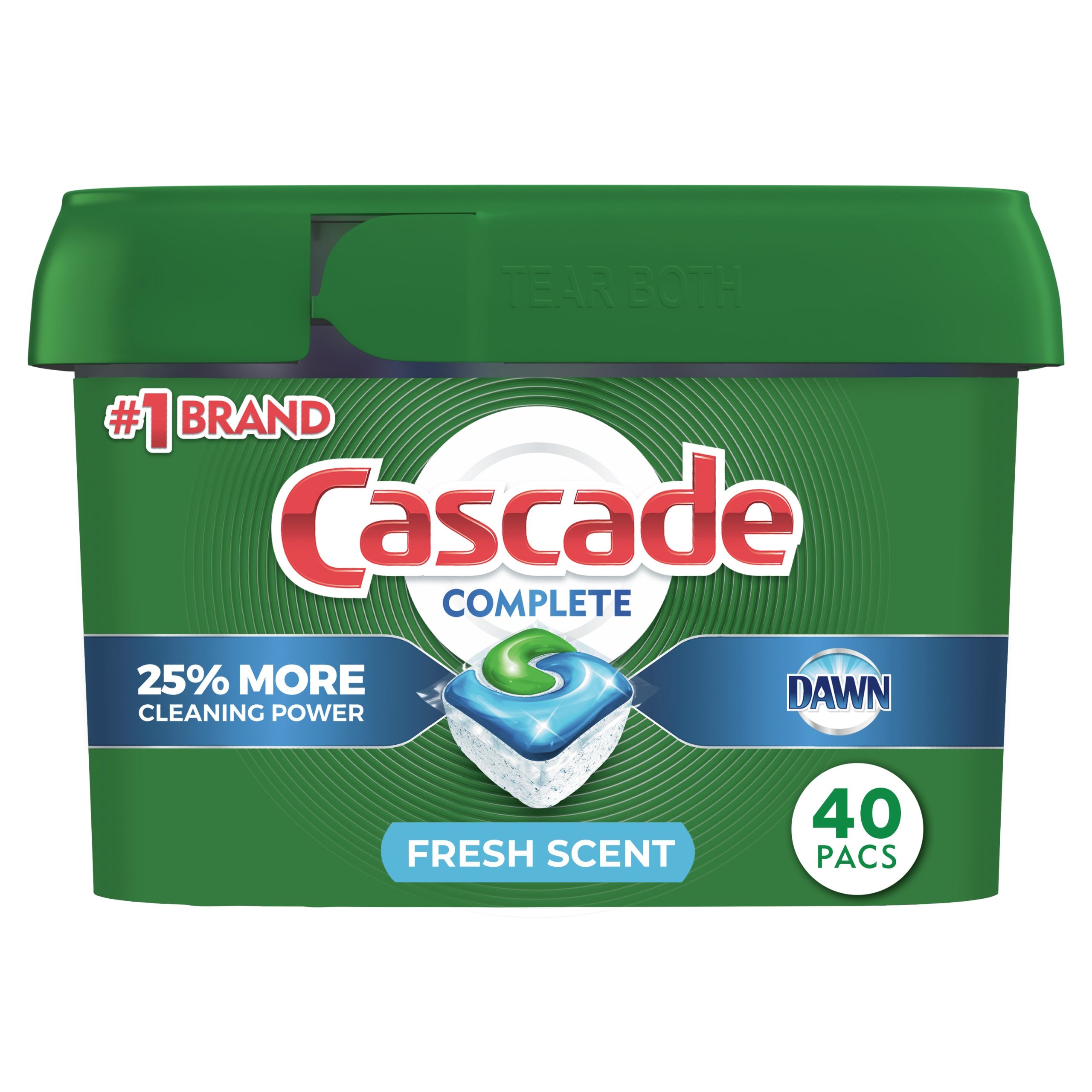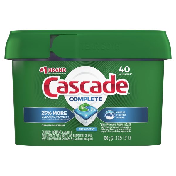 Cascade Complete ActionPacs dishwasher detergent powers away even 24-hour stuck-on messes for a complete clean. That’s because every ActionPac has 25% more Cleaning Power* (*% cleaning ingredients vs. Cascade Original) & is formulated with the grease-fighting power of Dawn dishwashing liquid. Cascade Complete ActionPacs are conveniently premeasured with no finicky wrapping-just toss in a pac. Cascade Complete ActionPacs are phosphate free. Plus, Cascade Complete ActionPacs dissolve quickly to unleash cleaning power early in the cycle. For best results, use Cascade Complete ActionPacs with Cascade Power Dry Rinse Aid for powerful drying and Cascade Dishwasher Cleaner to keep your dishwasher machine sparkling. Save up to 15 gallons of water per dishwasher load when you skip the pre-wash and run your dishwasher with Cascade Complete ActionPacs. Cascade is the #1 Recommended Brand in North America* *More dishwasher brands in North America recommend Cascade vs. any other automatic dishwashing detergent brand, recommendations as part of co-marketing agreements.