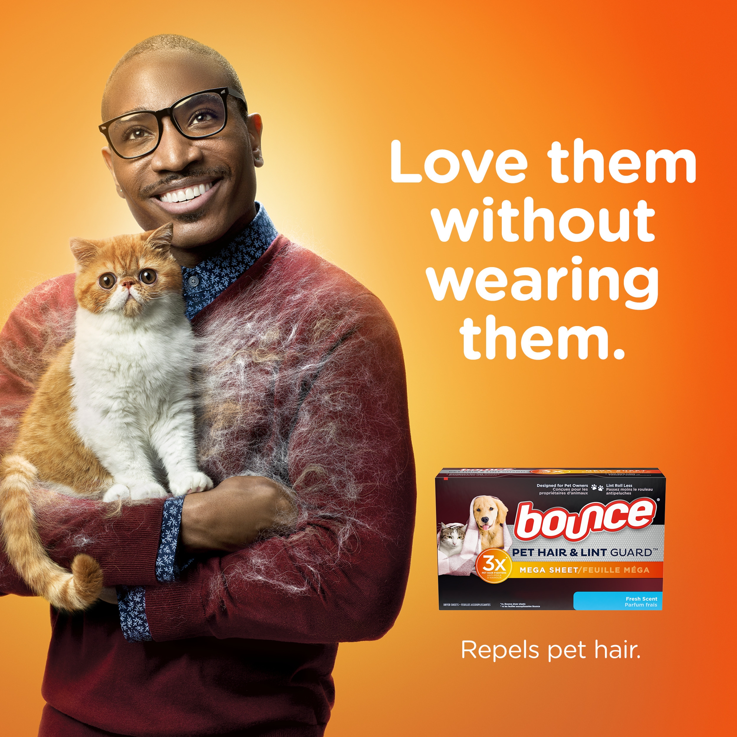 Give your furry friends a hug! Bounce Pet Hair & Lint Guard Mega Sheets dryer sheets repel pet hair from your clothes, before it sticks. One Bounce Mega Sheet has 3x the hair and lint fighting ingredients compared to the leading dryer sheet*. Just toss it in the dryer to bounce out pet hair and lint. Bounce dryer sheets also reduce wrinkles and static while adding extra softness. Thanks to Bounce Pet Hair + Lint Guard Mega Sheets, you can love your pet and lint roll less. *based on Nielsen category sales data