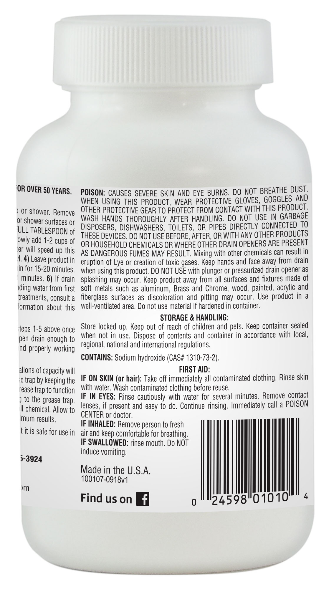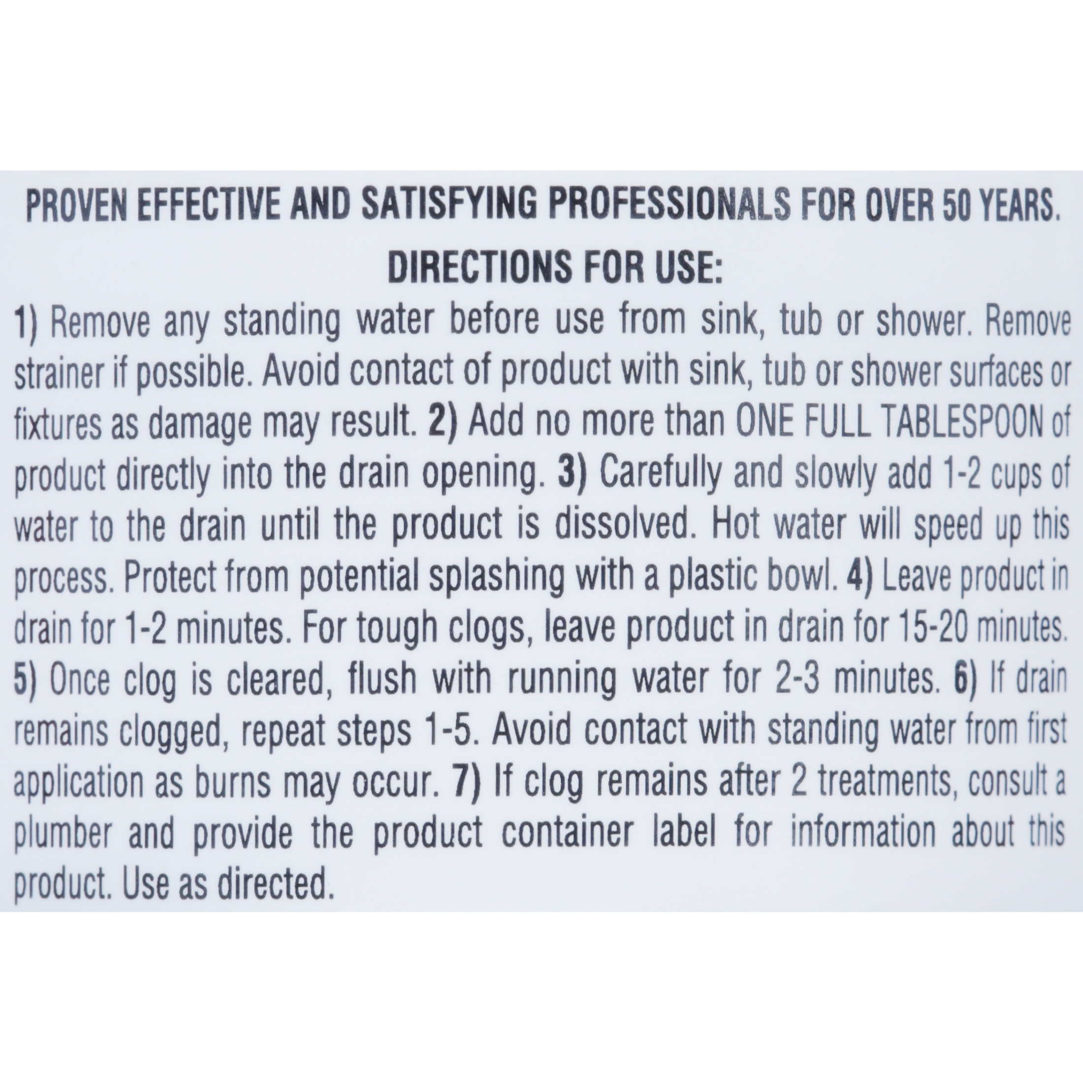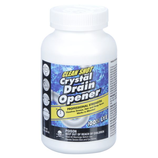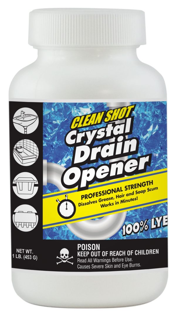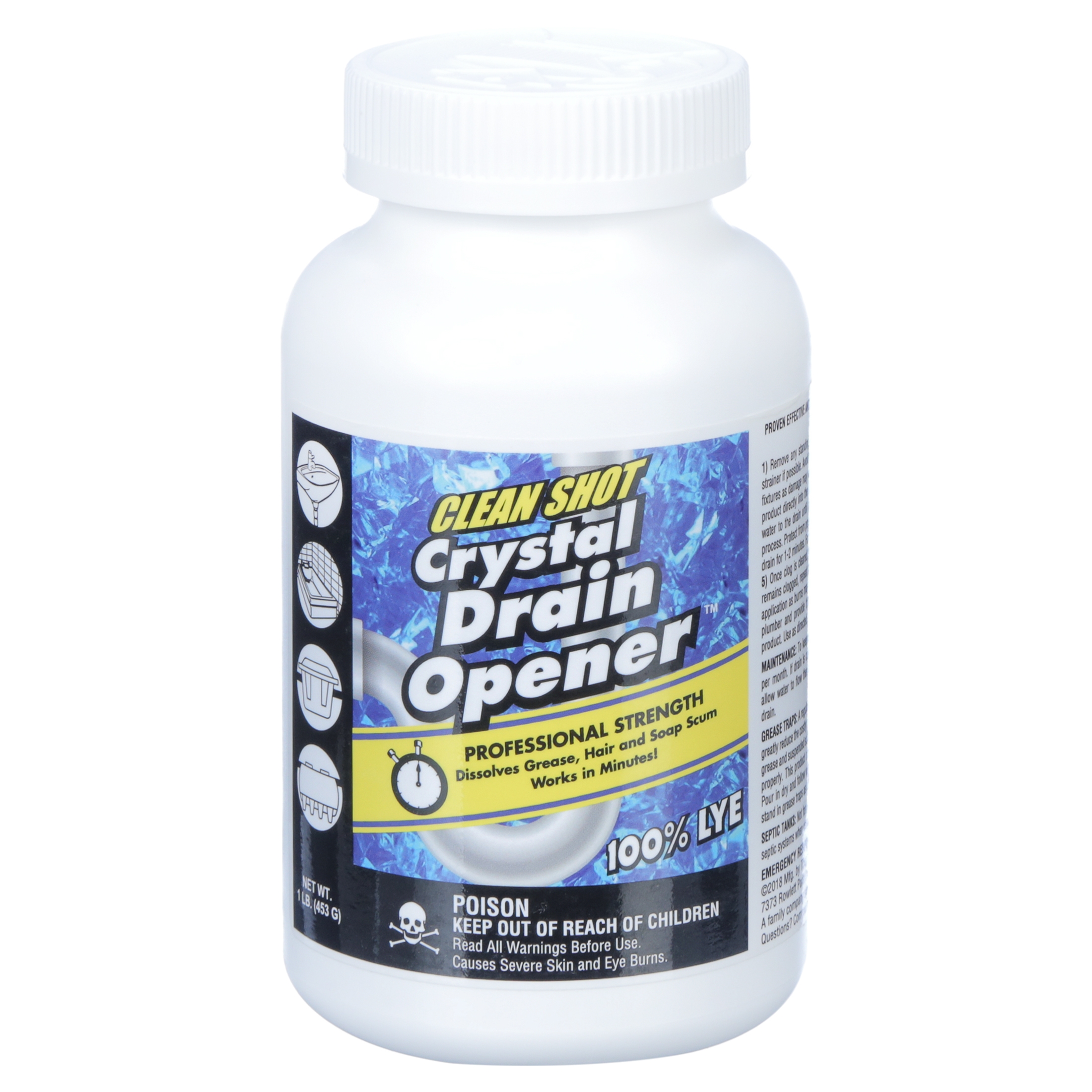 Clean Shot Crystal Drainer Opener is a professional grade, highest active content, crystal flake drain opener that is fully activated with hot water. Designed for use in virtually all small drains and grease traps as it is a non-acid formula. The fast-acting formula works in 60 seconds to dissolve built-up grease, oils, hair and soap scum. Use it as a clog remover and a drain opener.
