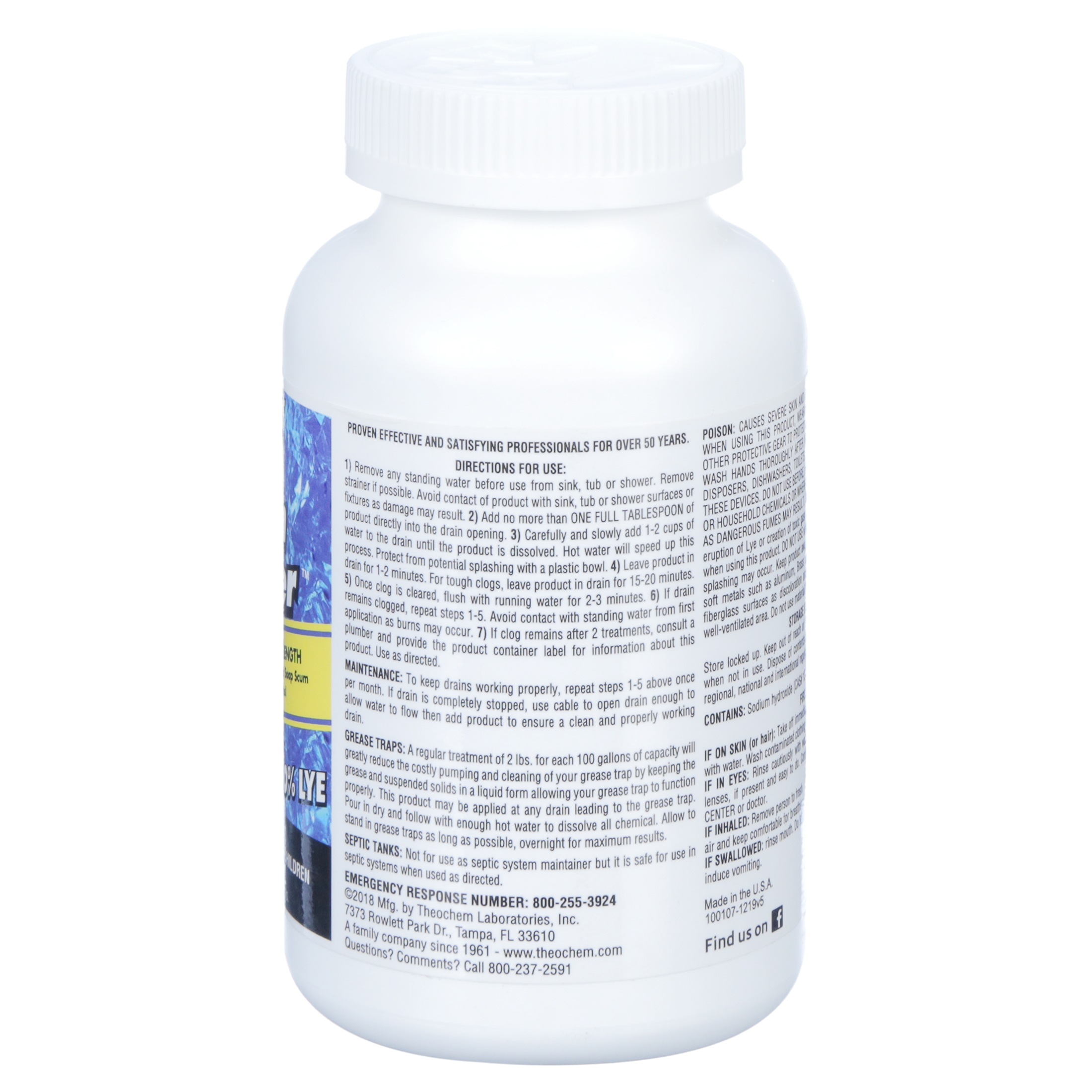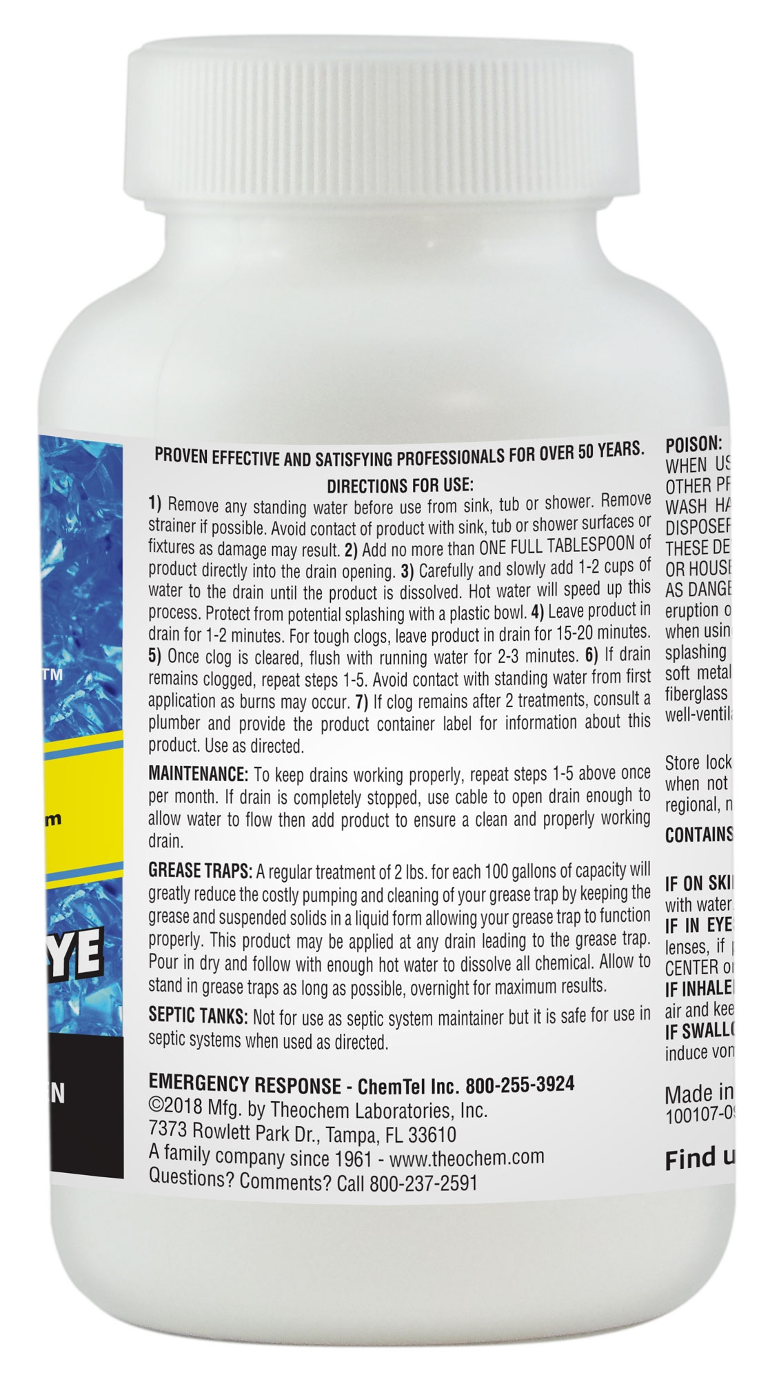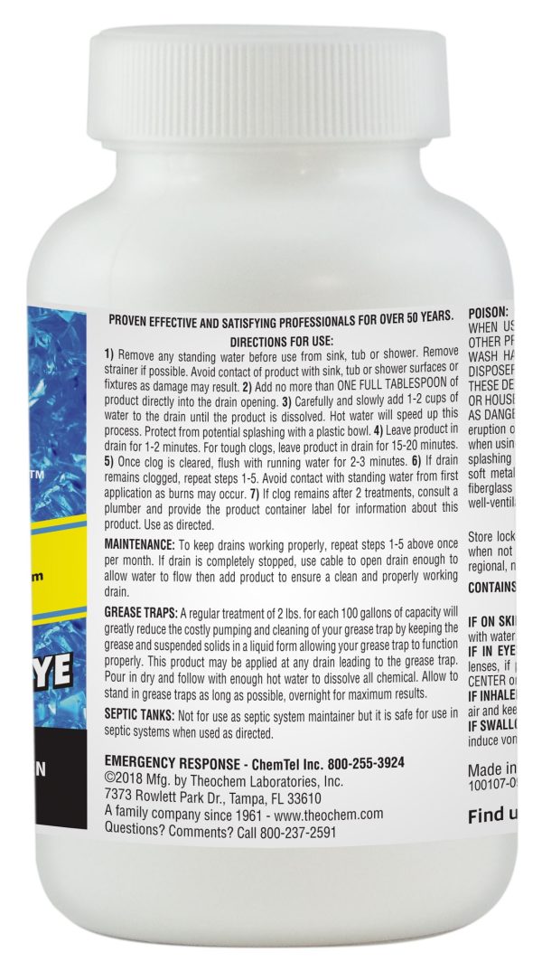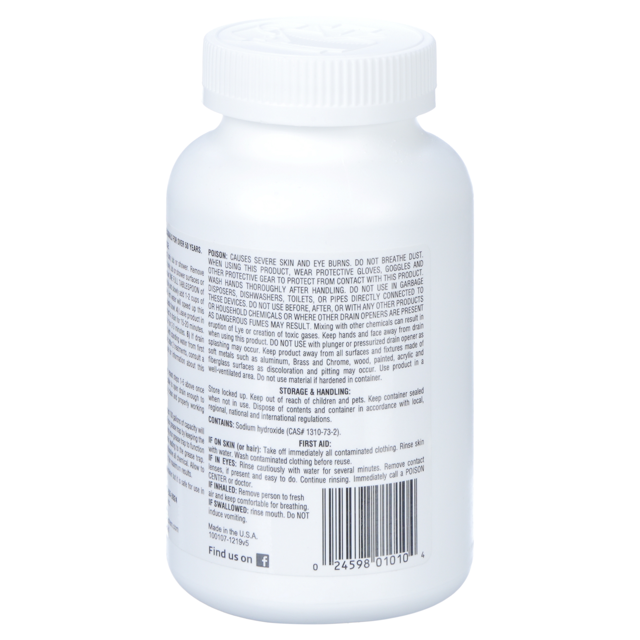 Clean Shot Crystal Drainer Opener is a professional grade, highest active content, crystal flake drain opener that is fully activated with hot water. Designed for use in virtually all small drains and grease traps as it is a non-acid formula. The fast-acting formula works in 60 seconds to dissolve built-up grease, oils, hair and soap scum. Use it as a clog remover and a drain opener.