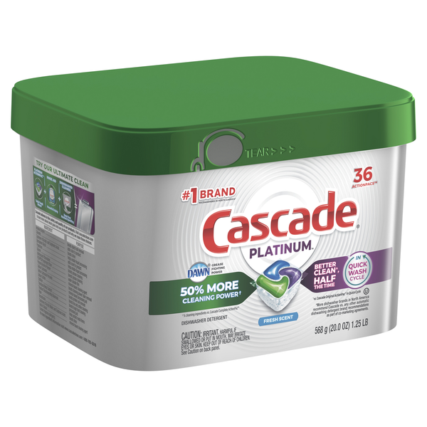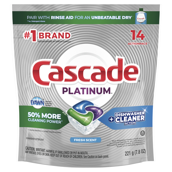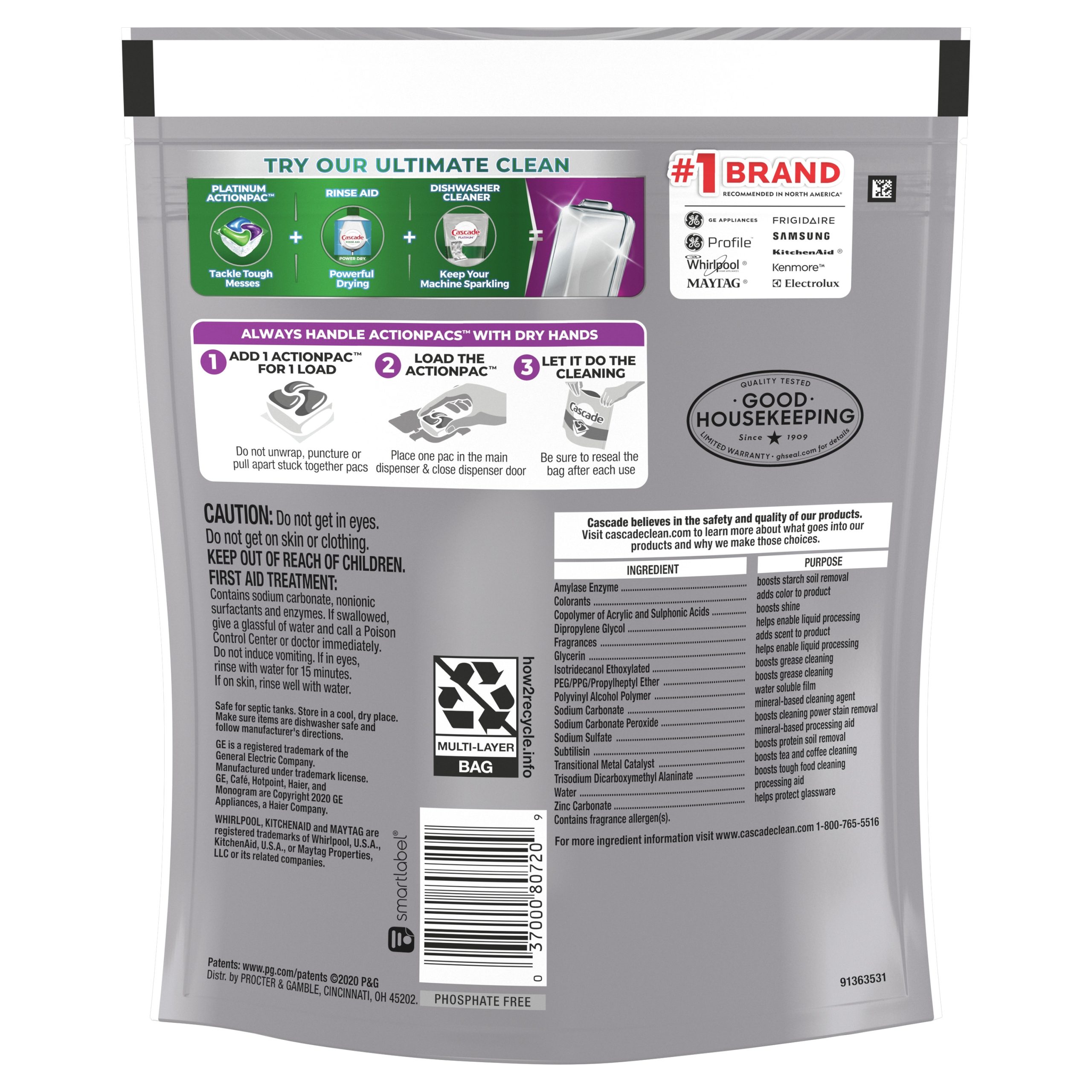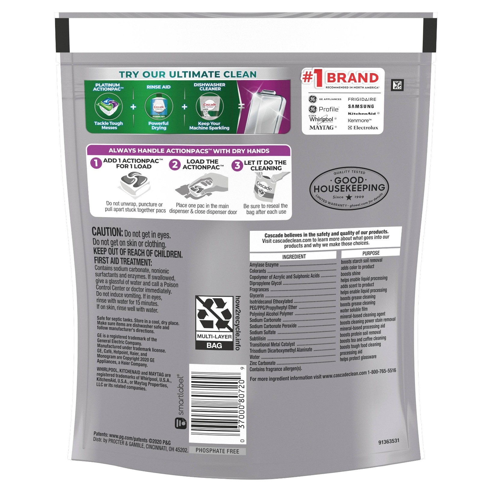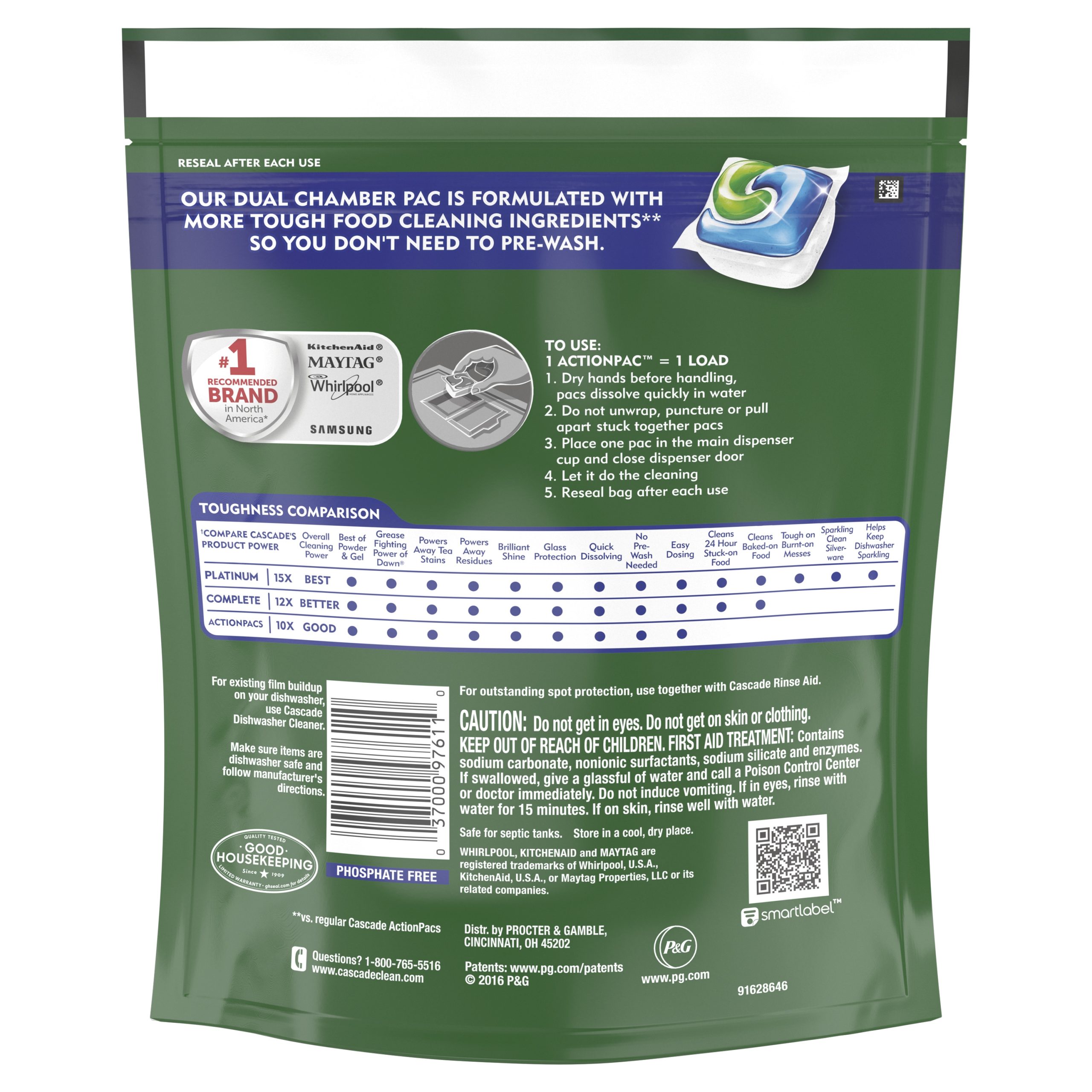 u0026bull;Cascade Platinum ActionPacs dishwasher detergent has 50% more cleaning power* and even works in the quick wash cycle (*%cleaning ingredients vs Cascade Complete ActionPacs)u003cbru003eu0026bull;Dissolves fast and release the grease-fighting power of Dawn, while food-seeking enzymes latch on and break down food into particles so small they can flow right down the drainu003cbru003eu0026bull;Powerful enough to clean 24-hour stuck-on foodu003cbru003eu0026bull;Convenient, premeasured ActionPac with no finicky wrapping. Phosphate freeu003cbru003eu0026bull;Use with Cascade Power Dry Rinse Aid and Cascade Dishwasher Cleaner for our best cleanu003cbru003eu0026bull;Save up to 15 gallons of water per dishwasher load when you skip the pre-wash and run your dishwasher with Cascade Platinumu003cbru003eu0026bull;#1 Recommended Brand in North America* *More dishwasher brands in North America recommend Cascade vs. any other automatic dishwashing detergent brand, recommendations as part of co-marketing agreements