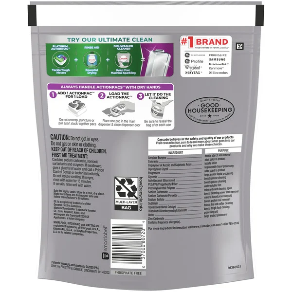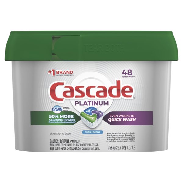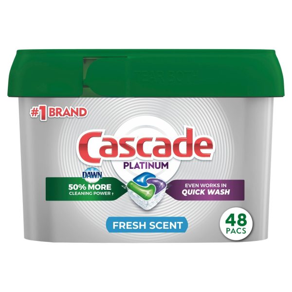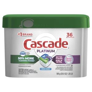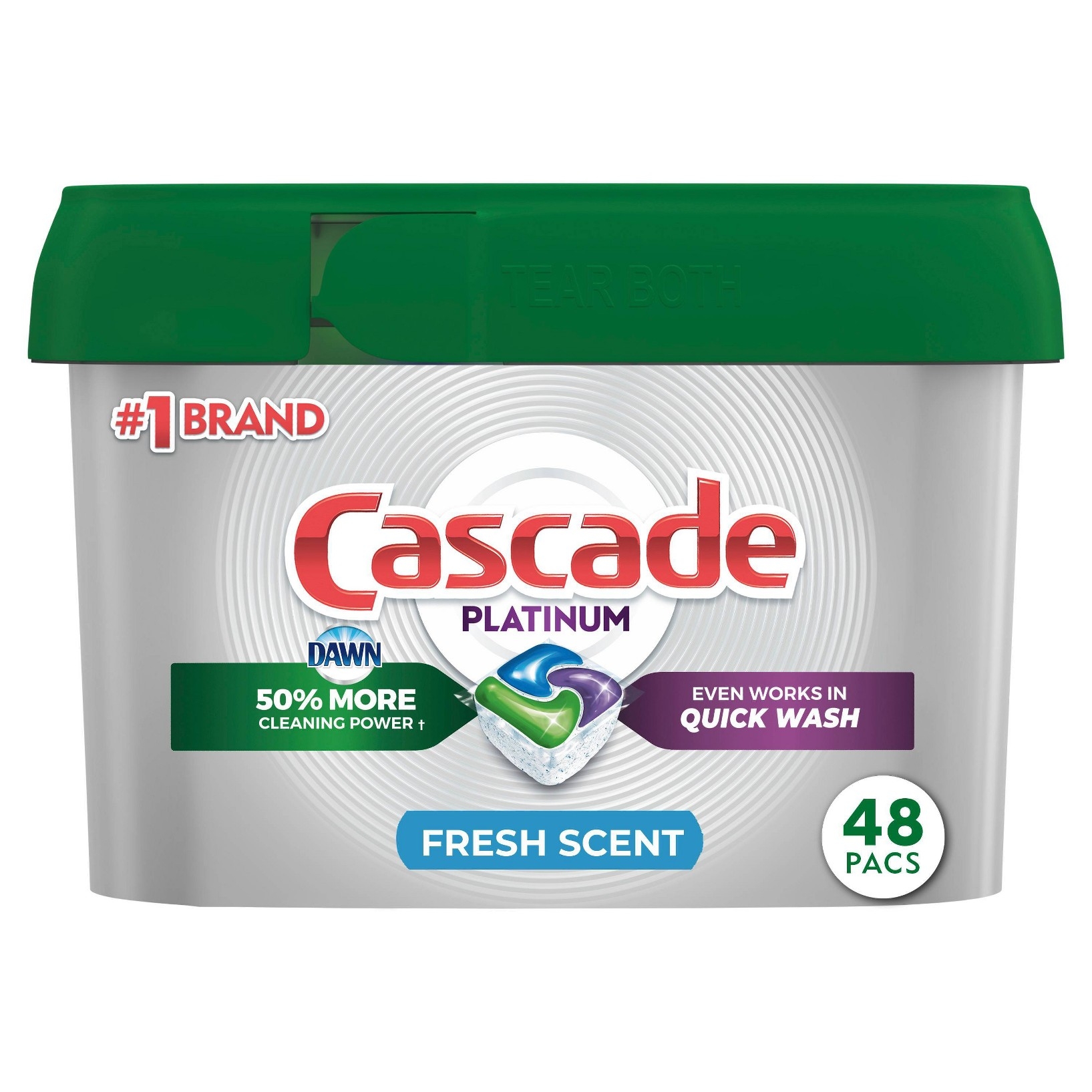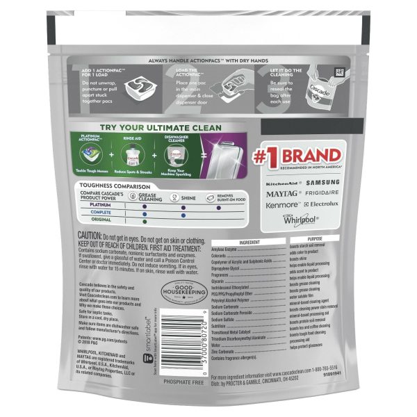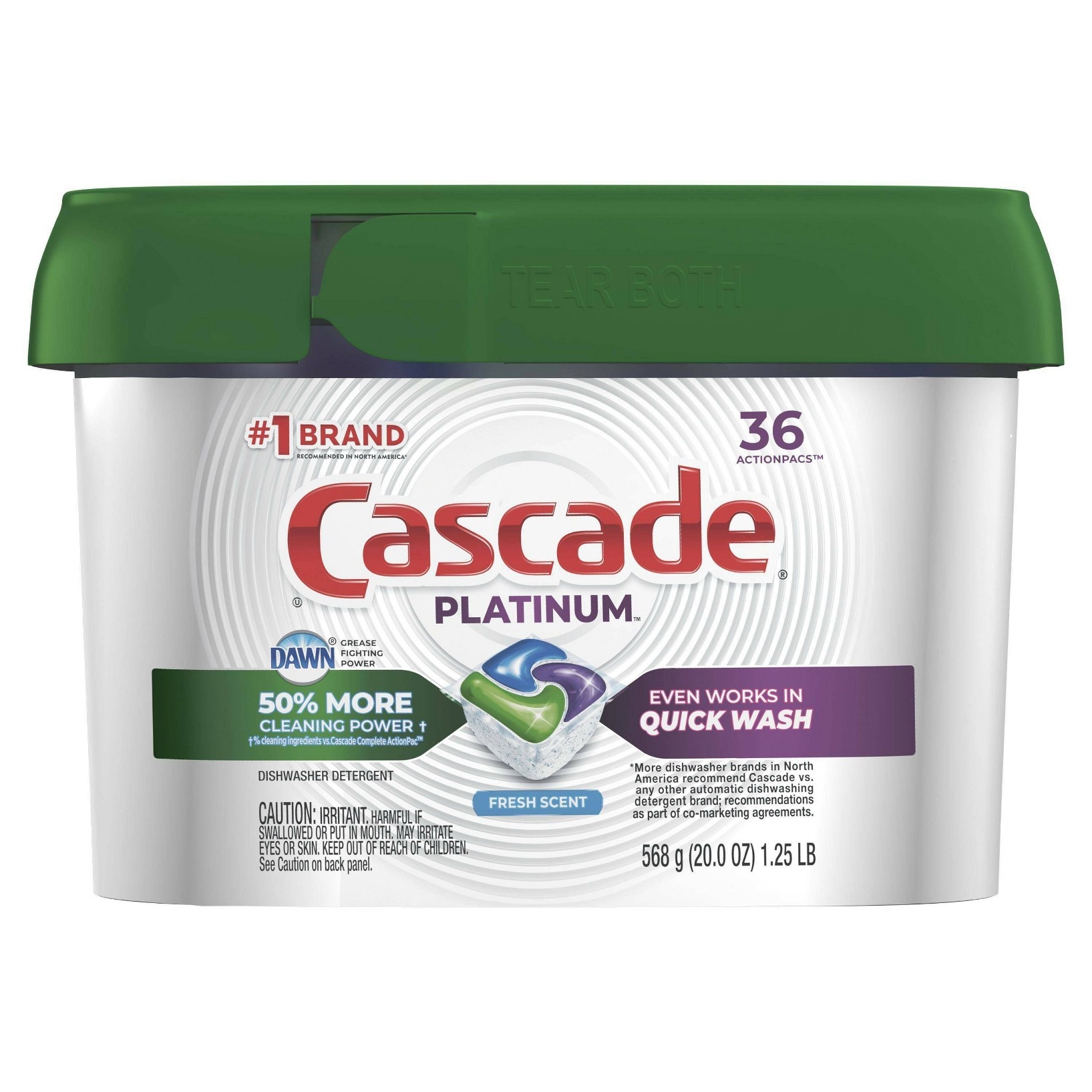 u0026bull;Cascade Platinum ActionPacs dishwasher detergent has 50% more cleaning power* and even works in the quick wash cycle (*%cleaning ingredients vs Cascade Complete ActionPacs)u003cbru003eu0026bull;Dissolves fast and release the grease-fighting power of Dawn, while food-seeking enzymes latch on and break down food into particles so small they can flow right down the drainu003cbru003eu0026bull;Powerful enough to clean 24-hour stuck-on foodu003cbru003eu0026bull;Convenient, premeasured ActionPac with no finicky wrapping. Phosphate freeu003cbru003eu0026bull;Use with Cascade Power Dry Rinse Aid and Cascade Dishwasher Cleaner for our best cleanu003cbru003eu0026bull;Save up to 15 gallons of water per dishwasher load when you skip the pre-wash and run your dishwasher with Cascade Platinumu003cbru003eu0026bull;#1 Recommended Brand in North America* *More dishwasher brands in North America recommend Cascade vs. any other automatic dishwashing detergent brand, recommendations as part of co-marketing agreements