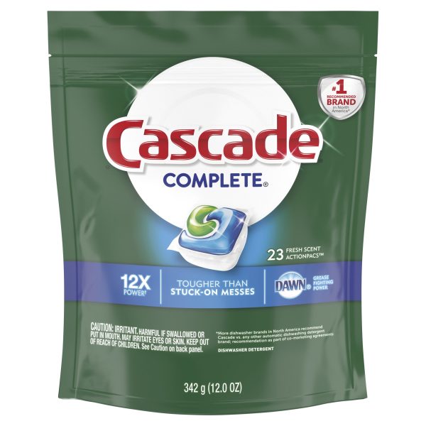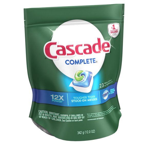 Powers away stuck-on messes – no pre-wash needed ActionPacs with the grease-fighting power of Dawn Rinse aid action rinses away residues and leaves dishes with a brilliant shine. Cascade Complete ActionPacs dishwasher detergent powers away even 24-hour stuck-on messes for a complete clean. That’s because every ActionPac is formulated with the grease-fighting power of Dawn. Dissolves quickly to unleash cleaning power early in the cycle.