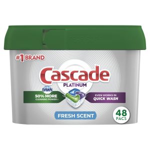 Cascade Platinum ActionPacs dishwasher detergent cleans burnt-on messes in just one wash, with no pre-wash needed. That’s because Platinum has 50% More Cleaning Power (% cleaning ingredients vs. Cascade Complete ActionPacs) to tackle burnt-on foods. It’s so powerful it even works in the Quick Wash cycle. Plus, Cascade Platinum dishwashing detergent is formulated to help prevent hard-water filming – keeping your machine looking fresh and clean. Simply pop in an ActionPacss and reveal a Platinum sparkle. Save up to 15 gallons of water per dishwasher load when you skip the pre-wash and run your dishwasher with Cascade Platinum.