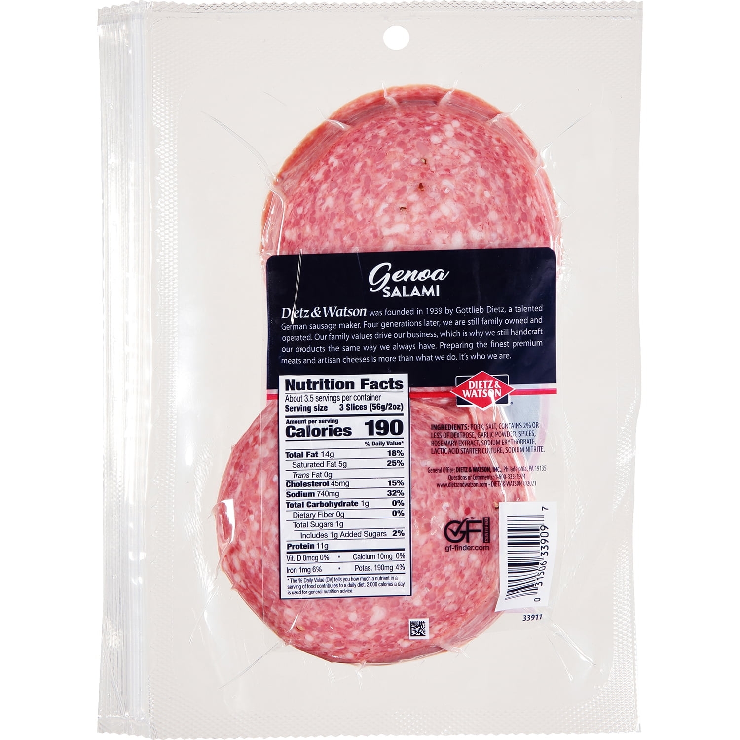 Dietz & Watson Pre-Sliced Genoa Salami. Mama mia! This authentic Italian style salami prepared from fresh, hand-trimmed pork and all natural regional spice, then fully cooked in the old-world style. Enjoy entertaining with this excellent ready-to-serve addition to your charcuterie board or with our White American Cheese for a tasty sandwich. Sliced and packaged into a resealable bag for your convenience. Dietz & Watson is a family business in the business of feeding families. For over 80 years, Dietz & Watson has been rooted in choice, transparency, quality and family. Our commitment to quality above all else, means we’ll continue to offer products that are both good and good for you, using time-honored recipes and the highest quality ingredients. Doing it the right way, even if it’s the hard way since 1939. Dietz & Watson, it’s a family thing.