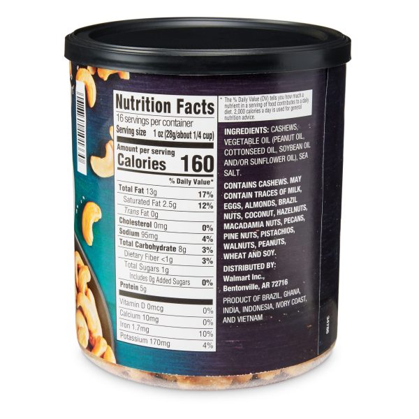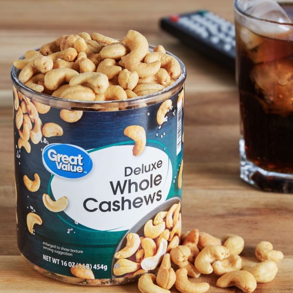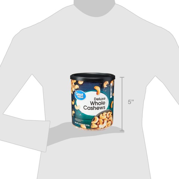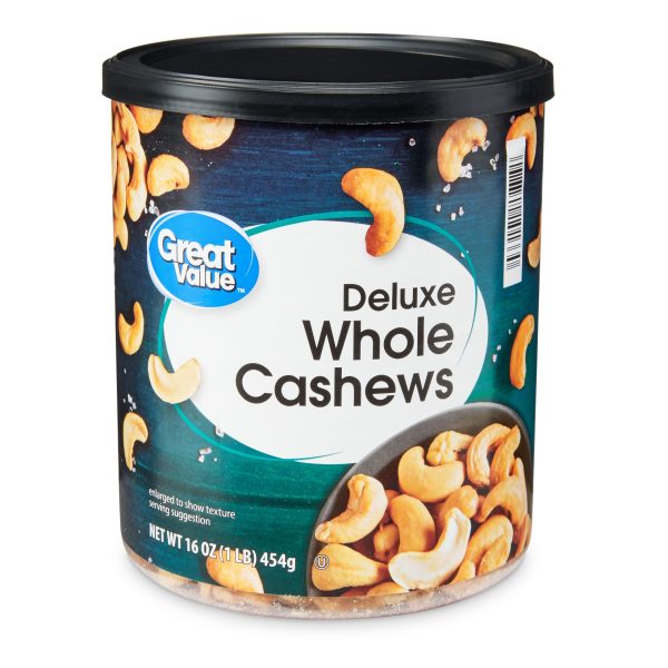 Stop your savory craving in its tracks with a handful of tasty Great Value Deluxe Salted Whole Cashews. Our cashews are seasoned with pure sea salt to bring out the robust, nutty flavor. Pass the one-pound canister around with your family while watching a movie for a delightful and nutritious snack. Pack a portion to take with you to work or school as a convenient afternoon bite to tide you over until dinner time. Each serving has five grams of protein, and there are 16 servings per container. Treat yourself anytime with Great Value Deluxe Salted Whole Cashews.Great Value products provide families with affordable, high quality grocery and household consumable options. With our wide range of product categories spanning grocery and household consumables, we offer you a variety of products for your family’s needs. Our products are conveniently available online and in Walmart stores nationwide, allowing you to stock up and save money at the same time.