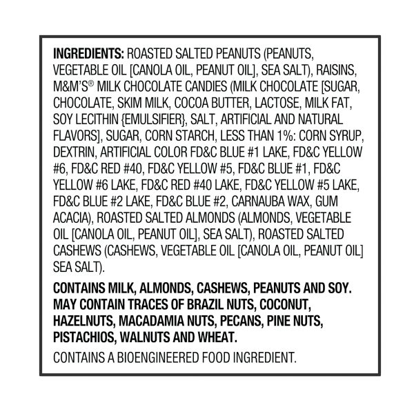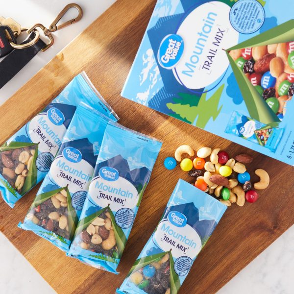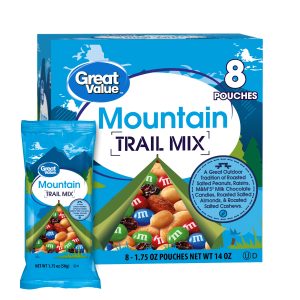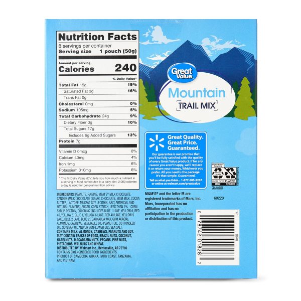 A Great Outdoor Tradition of Peanuts, Raisins, M&M’S Milk Chocolate Candies, Almonds & Cashews, Great Value Mountain Trail Mix is a sweet combination of healthy fats, energizing carbohydrates, and belly-filling protein that helps you power through your day. This mix contains a delicious variety of peanuts, raisins, M&M’S candies, almonds, and cashews for an irresistible flavor combination. This box contains eight individual-sized packages that are ideal to take along in your backpack for your next hike or camping trip, pack in your child’s school lunch, or stash at your office desk for a quick snack. Fuel your body and satisfy your sweet tooth with Great Value Mountain Trail Mix.