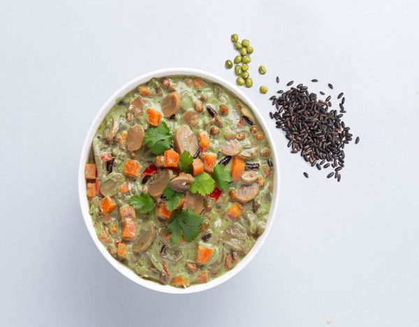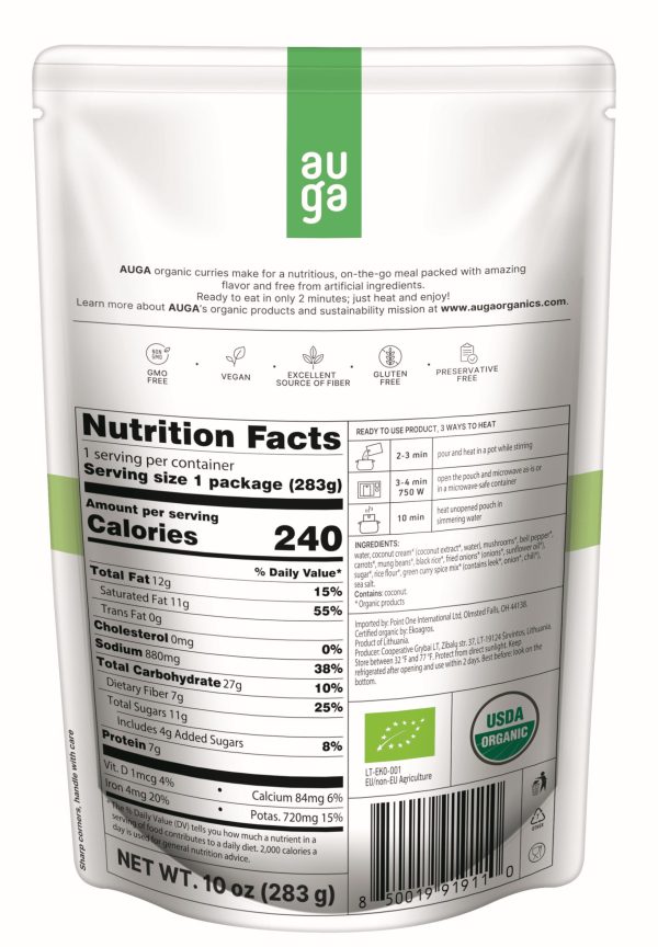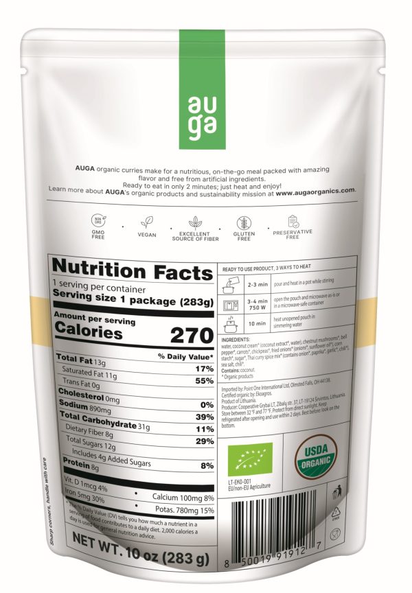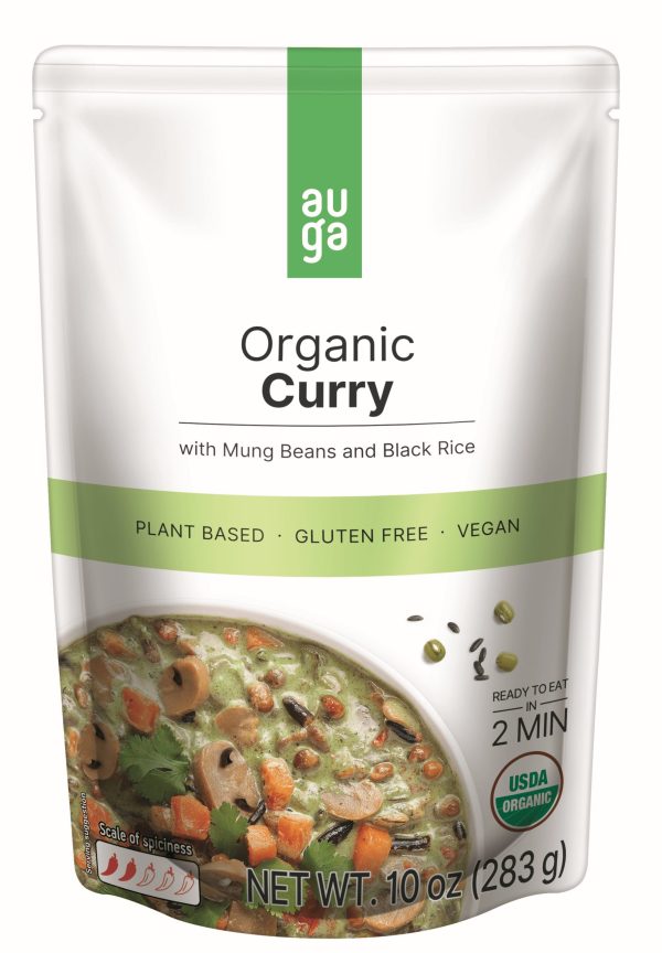 Variety Pack of AUGA Organic Curry Meal (10oz. per unit) – 2/ea: Green, Red and Yellow. Green Curry with Mung Beans & Black rice, Red Curry with Lentils & Shiitake Mushrooms, Yellow Curry with Chickpeas & Chestnut Mushrooms. Curry Meal is a nutritious, complete meal that is shelf stable and a convenient, healthy option for busy people. This plant-based green curry is cooked from organic vegetables, black rice, mung beans and spices. It slightly spicy (2 out of 5 on the heat index) and is free from: preservatives, gluten, dairy, and allergens (except coconut). Our eco-friendly packaging is BPA free and produces only 1/3 of the carbon emissions versus a can or glass jar. This ready-to-eat curry can be heated on the stovetop or in the microwave….you can even microwave the curry meal in the pouch! All AUGA products are USDA Organic, non-GMO, plant-based, and ready to eat. Many ingredients are sourced from our sustainable farms.