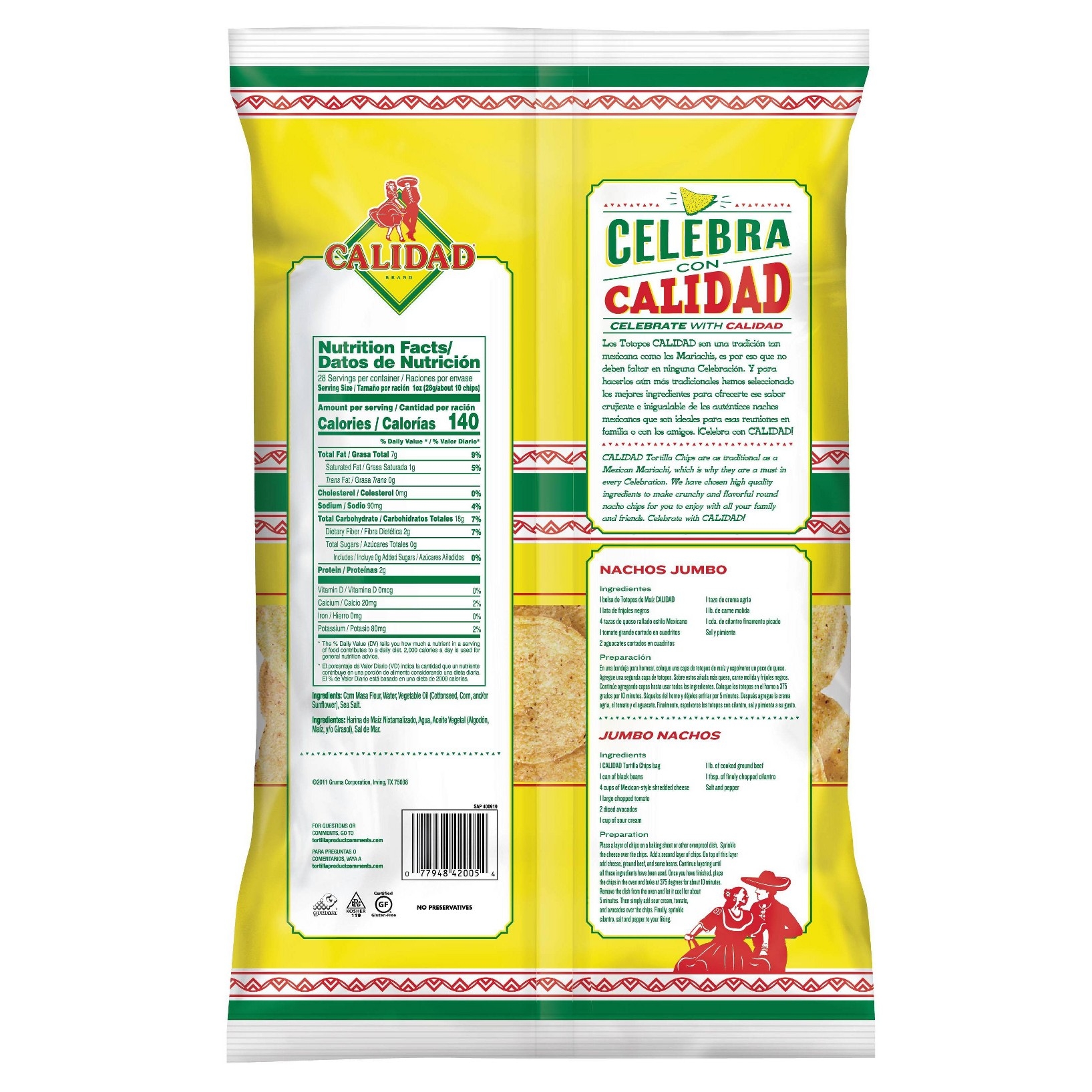 u0026bull;One 28oz bag of Calidad Yellow Corn Tortilla Chipsu003cbru003eu0026bull;Made with traditional ingredients and cooking methodsu003cbru003eu0026bull;0g of trans fats per servingu003cbru003eu0026bull;Certified gluten freeu003cbru003eu0026bull;Perfect for any authentic Mexican recipe