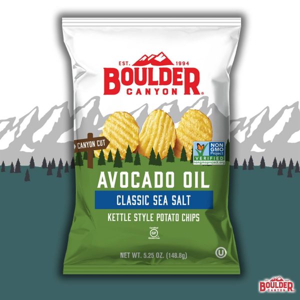 u0026bull;CRUNCHY, KETTLE COOKED – Boulder Canyon Kettle Cooked Potato Chips are thickly sliced potatoes that are kettle cooked in small batches cooked in 100% avocado oil. Made with simple ingredients and shipped directly from the manufacturer to ensure freshness!u003cbru003eu0026bull;UNIQUE FLAVOR u0026 OILS – The buttery flavor of avocado oil fused with classic savory sea salt, packs a salty zing in these kettle-cooked potato chips. Pair with your favorite chip dip and a sandwich and give those taste buds a flavor they won’t forget!u003cbru003eu0026bull;GLUTEN FREE – Enjoy these delicious, all natural, crunchy potato chips without the guilt. They are kettle-cooked in 100% avocado oil, contain no MSG and are gluten, cholesterol and trans-fat free.u003cbru003eu0026bull;PERFECT PARTY FAVOR – These individual bags are the perfect size for lunch, birthday party favor bags or give to wedding guests for late-night snacks. Leave them at work, in the car or pantry. They are easy to grab whenever and wherever you need a snack.u003cbru003eu0026bull;LIVE BETTER. EAT BOULDER. Since 1994, Boulder Canyon has delivered premium snacks with real food ingredients and fewer, better and minimally processed ingredients. Packing the crunch and flavor you crave for an extraordinary snacking experience.