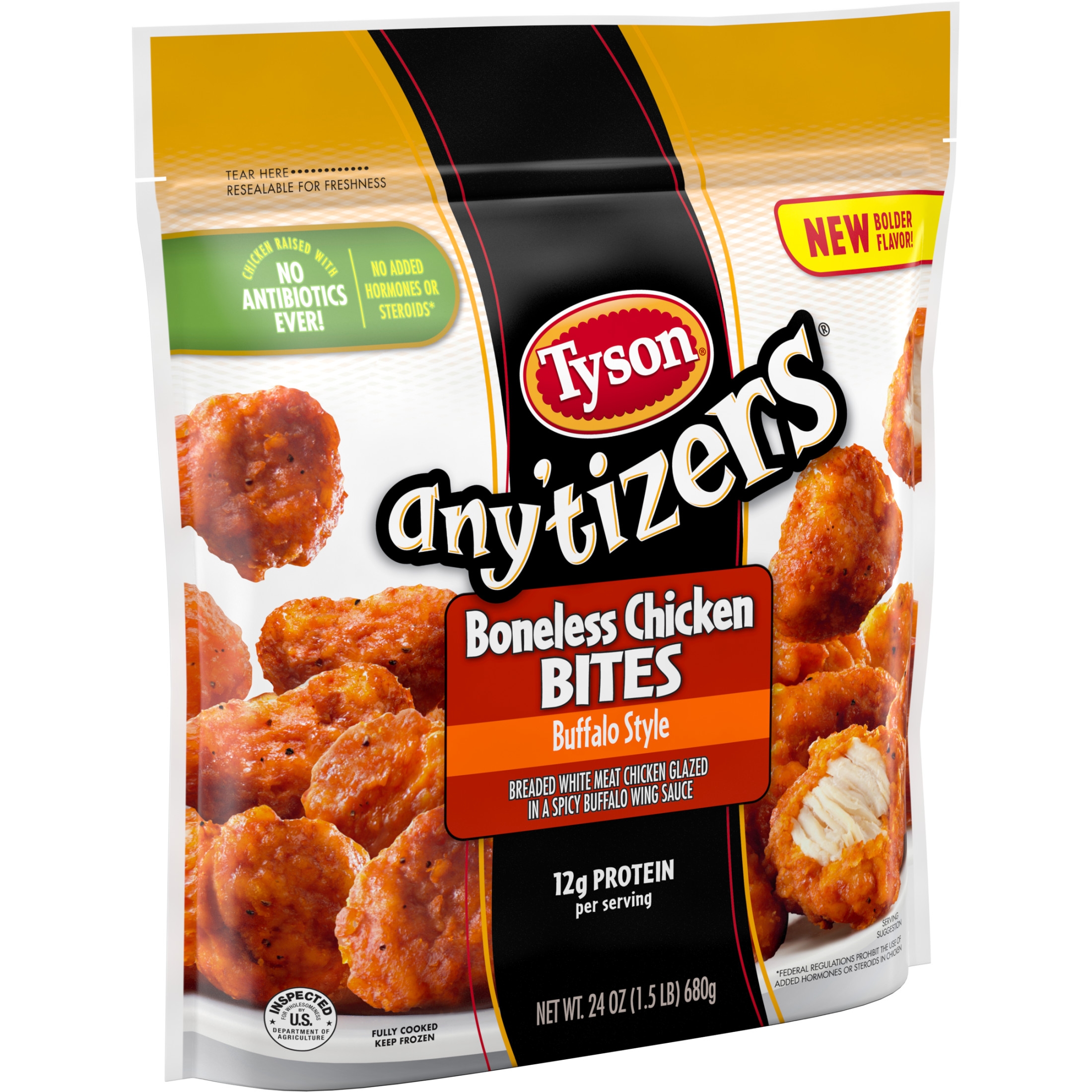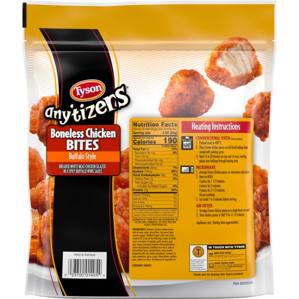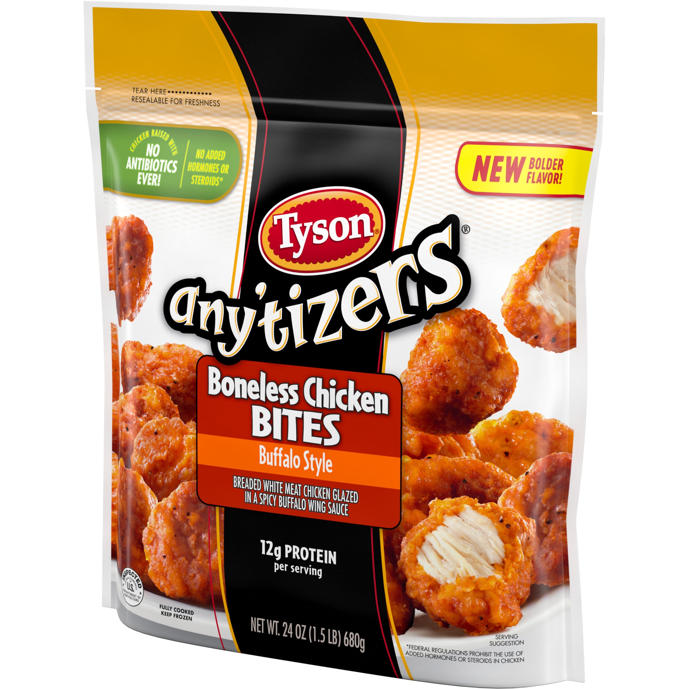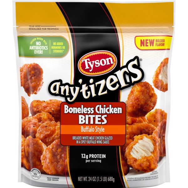 Take snack time to the next level with Tyson Any’tizers Buffalo Style Boneless Chicken Bites, now with new bolder flavor. A spicy, tangy kick for your taste buds, these juicy, flavor packed Buffalo chicken bites are ready to satisfy all your snacking needs. Each bite is coated with buffalo style goodness and has just the right amount of crispy breading. Made with boneless all white meat chicken, these convenient, fully cooked chicken bites are a breeze to prep from frozen in the oven, microwave or air fryer. These tender bites are made with chicken raised with no antibiotics ever, no added hormones or steroids*, and provide 12 grams of protein per serving. Heat and serve these crave worthy breaded chicken bites as an alternative to chicken nuggets. Includes one 24 oz resealable package of chicken bites. Keep it real. Keep it Tyson. Look for other Tyson snacks including our Buffalo wings for the fryer and baked Buffalo chicken wings. *Federal regulations prohibit the use of added hormones or steroids in chicken.