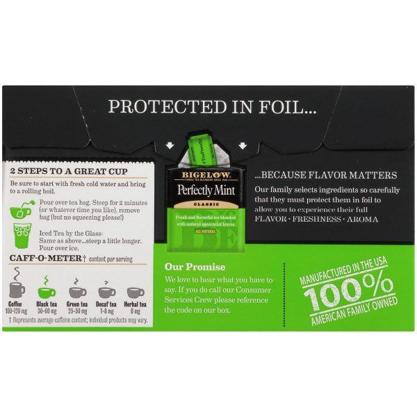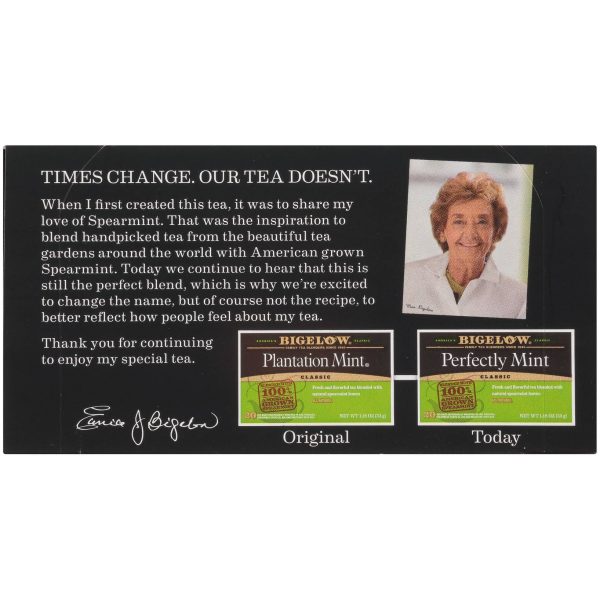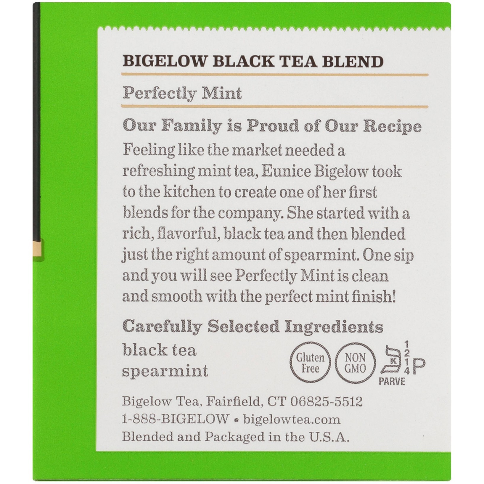 u0026bull;Bigelow Perfectly Mint Tea, Tea Bags, 20 Ctu003cbru003eu0026bull;The perfect blend of tea and American grown mintu003cbru003eu0026bull;20 Tea bags, individually wrapped in foil pouches for peak flavor, freshness and aromau003cbru003eu0026bull;Gluten–free, Non-GMO, Kosher Parve, Kosher for Passoveru003cbru003eu0026bull;Bigelow Tea is Family Owned and Blended u0026 Packaged in the USA since 1945u003cbru003eu0026bull;Each Ingredient has been carefully selected by the Bigelow Family to deliver an uncompromised quality tea experienceu003cbru003eu0026bull;Bigelow Tea is proud to be a Certified B Corporation! We meet the highest verified standards of social and environmental performance, transparency, and accountability