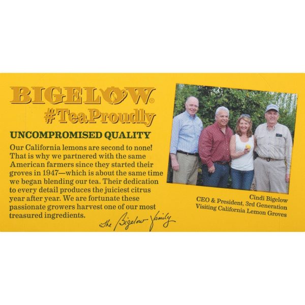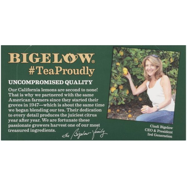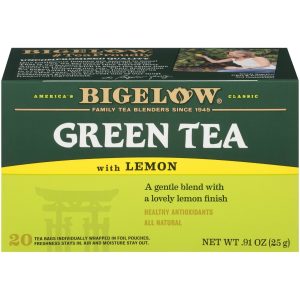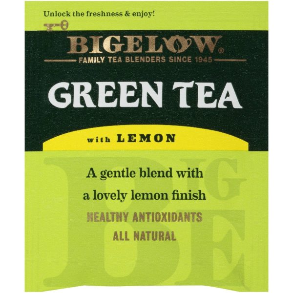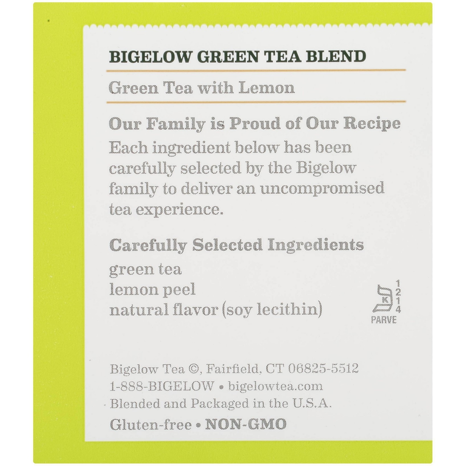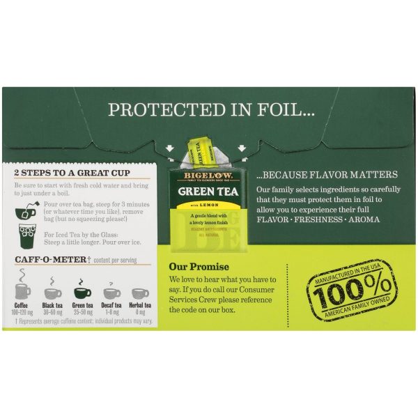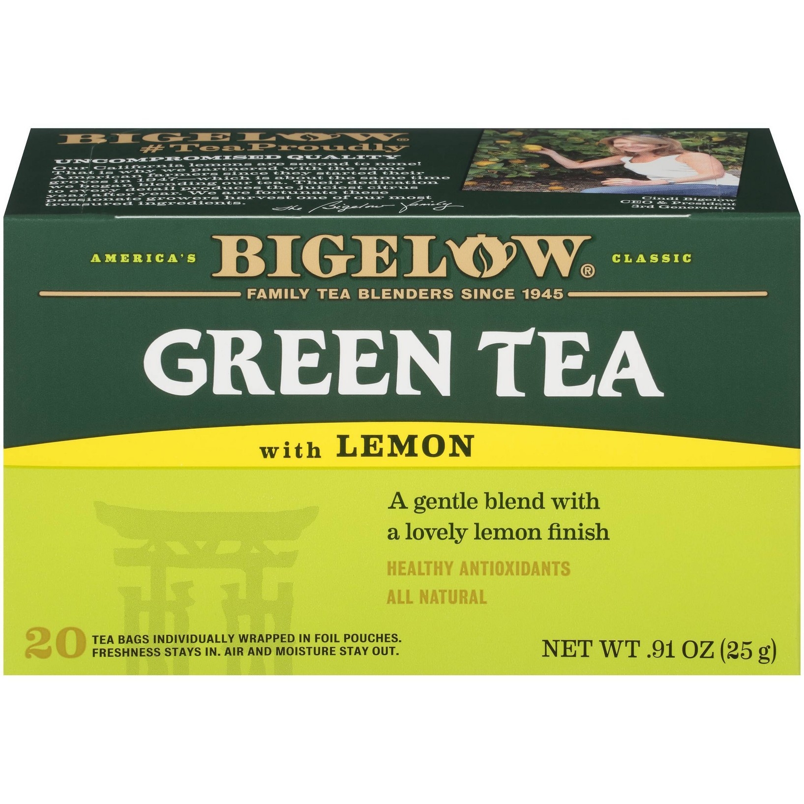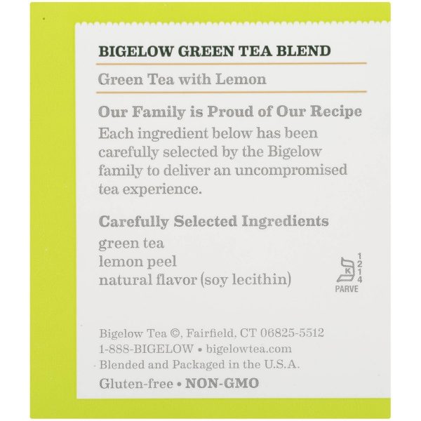u0026bull;Bigelow Green Tea with Lemon, Tea Bags, 20 Ctu003cbru003eu0026bull;Smooth green tea with a lovely lemon finishu003cbru003eu0026bull;20 Tea bags, individually wrapped in foil pouches for peak flavor, freshness and aromau003cbru003eu0026bull;Gluten–free, Non-GMO, Kosher Parveu003cbru003eu0026bull;Bigelow Tea is Family Owned and Blended u0026 Packaged in the USA since 1945u003cbru003eu0026bull;Each Ingredient has been carefully selected by the Bigelow Family to deliver an uncompromised quality tea experienceu003cbru003eu0026bull;Bigelow Tea is proud to be a Certified B Corporation! We meet the highest verified standards of social and environmental performance, transparency, and accountability