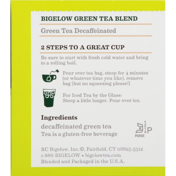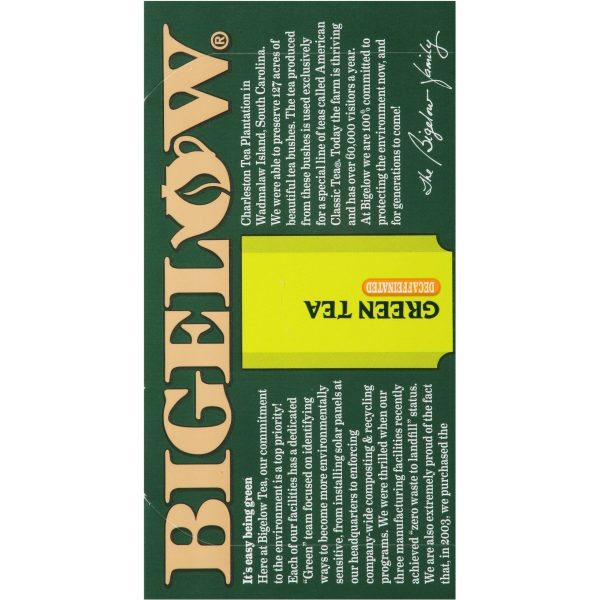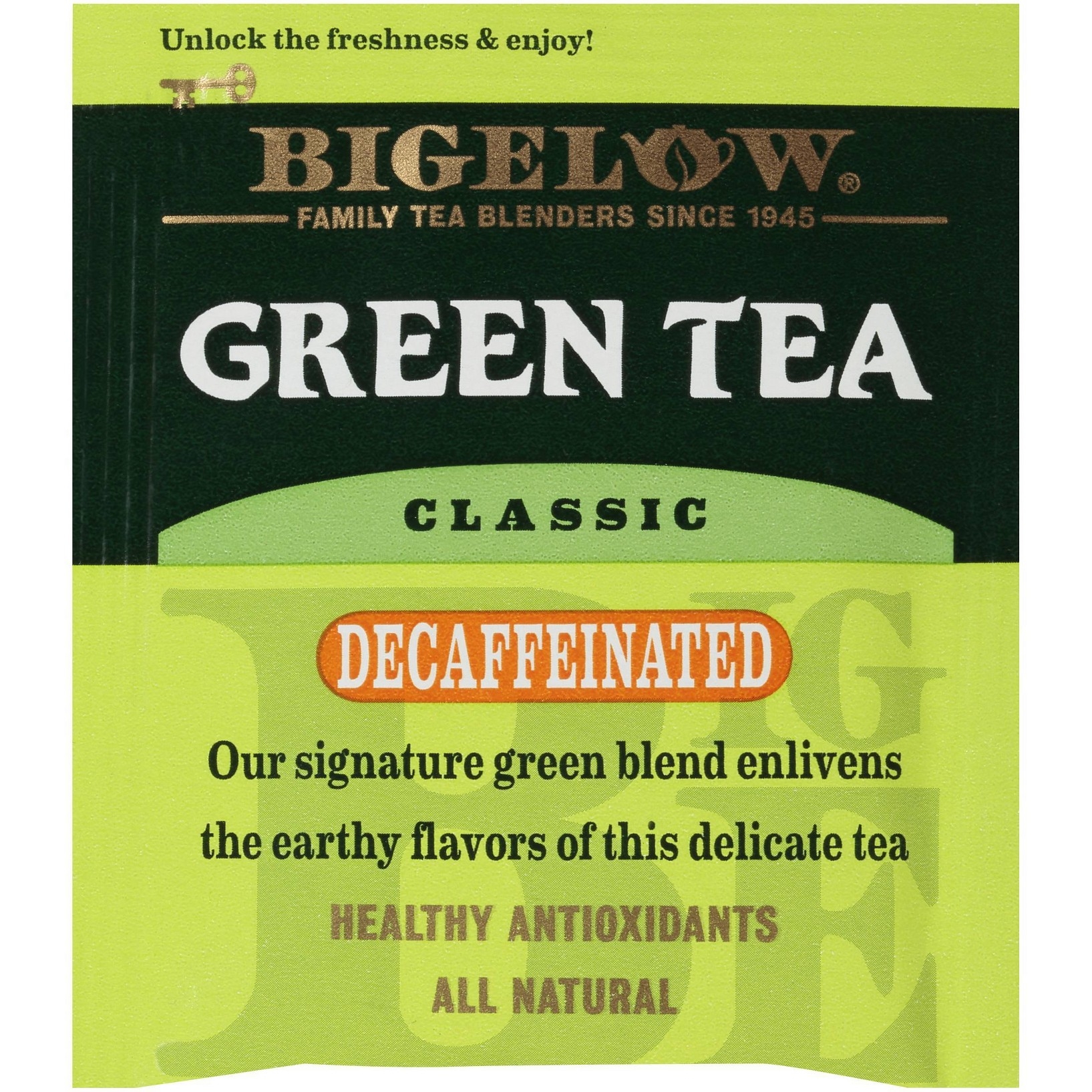 u0026bull;Bigelow Classic Green Tea Decaffeinated, Tea Bags, 20 Ctu003cbru003eu0026bull;Hand picked tea for a smooth and balanced taste without the caffeine. Our classic green tea is simply unmatchedu003cbru003eu0026bull;20 Tea bags, individually wrapped in foil pouches for peak flavor, freshness and aromau003cbru003eu0026bull;Gluten-free , Non-GMO, Kosher Parve, Kosher Passoveru003cbru003eu0026bull;Bigelow Tea is Family Owned and Blended u0026 Packaged in the USA since 1945u003cbru003eu0026bull;Each Ingredient has been carefully selected by the Bigelow Family to deliver an uncompromised quality tea experienceu003cbru003eu0026bull;Bigelow Tea is proud to be a Certified B Corporation! We meet the highest verified standards of social and environmental performance, transparency, and accountability
