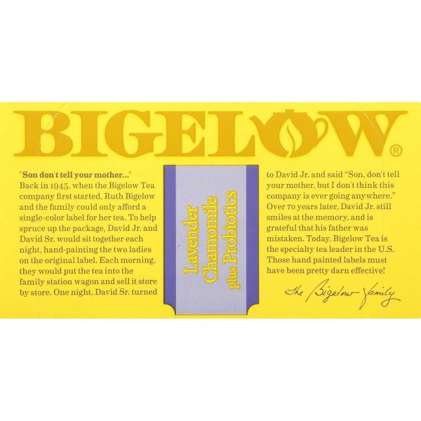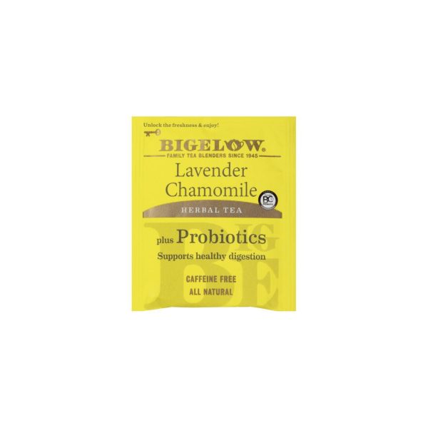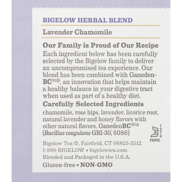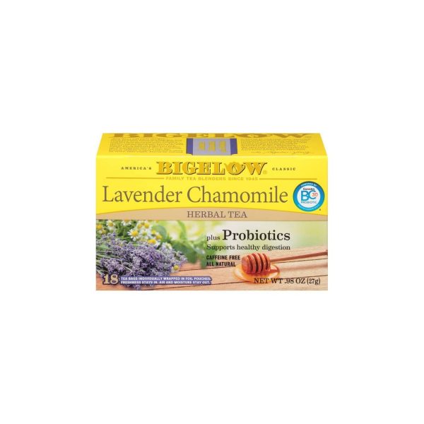 u0026bull;Bigelow Lavender Chamomile plus Probiotics, Herbal Tea, Tea Bags, 18 Ctu003cbru003eu0026bull;Soothing combination of lavender and chamomile plus Ganeden BC30 probioticu003cbru003eu0026bull;18 Tea bags, individually wrapped in foil pouches for peak flavor, freshness and aromau003cbru003eu0026bull;Caffeine-free, Gluten–free, Non-GMO, Kosher Parveu003cbru003eu0026bull;Bigelow Tea is Family Owned and Blended u0026 Packaged in the USA since 1945u003cbru003eu0026bull;Each Ingredient has been carefully selected by the Bigelow Family to deliver an uncompromised quality tea experienceu003cbru003eu0026bull;Bigelow Tea is proud to be a Certified B Corporation! We meet the highest verified standards of social and environmental performance, transparency, and accountability