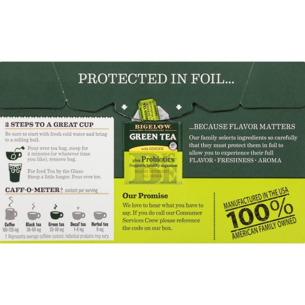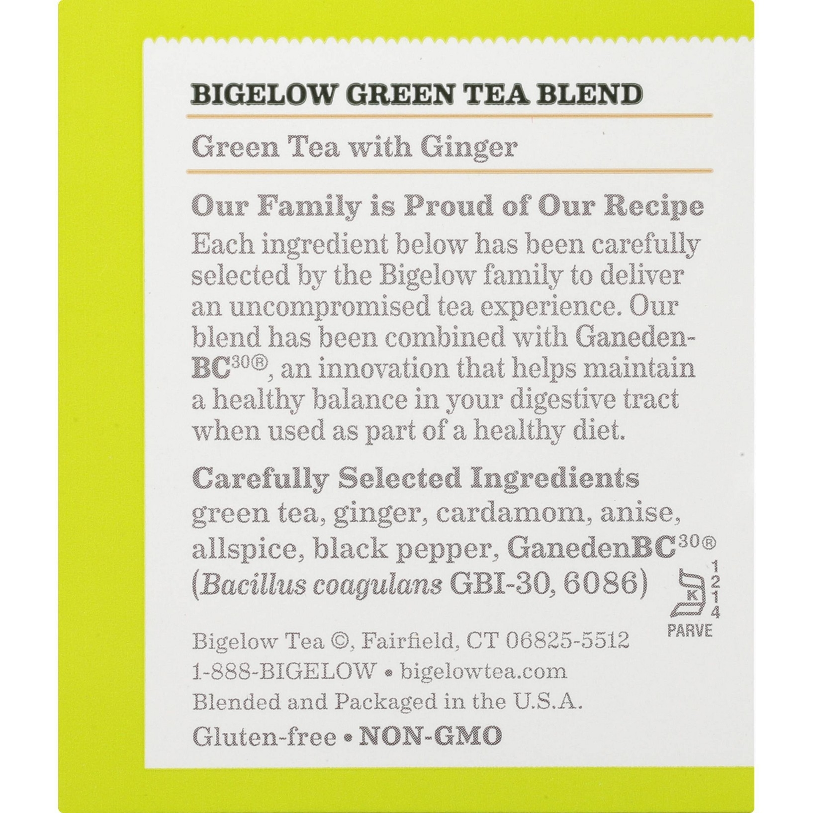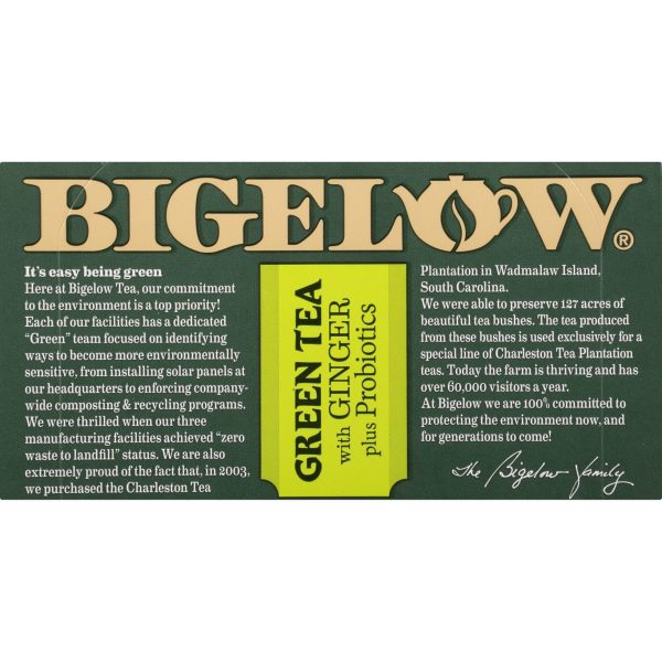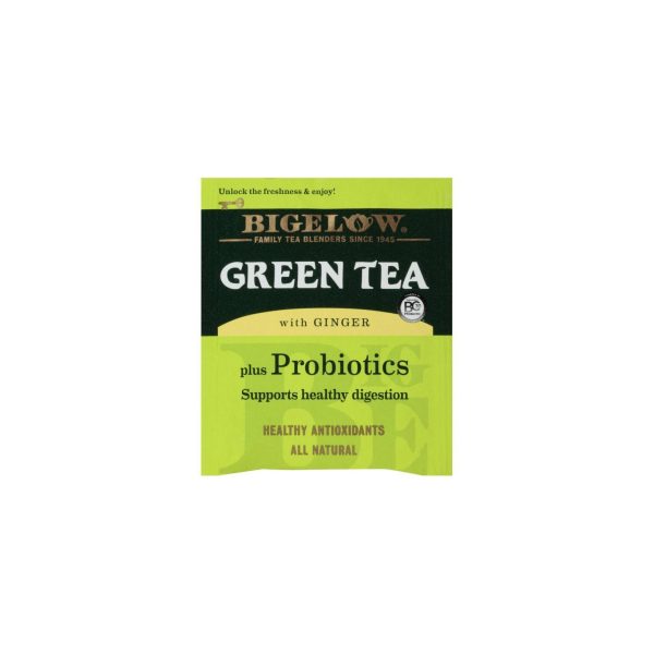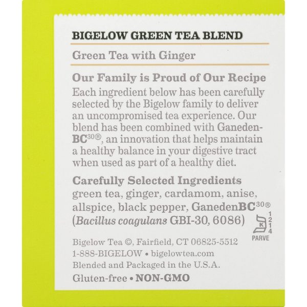 u0026bull;Bigelow Green Tea with Ginger plus Probiotics, Tea Bags, 18 Ctu003cbru003eu0026bull;Green tea blended with zesty ginger plus Ganeden BC30 probioticu003cbru003eu0026bull;18 Tea bags, individually wrapped in foil pouches for peak flavor, freshness and aromau003cbru003eu0026bull;Gluten–free, Non-GMO, Kosheru003cbru003eu0026bull;Bigelow Tea is Family Owned and Blended u0026 Packaged in the USA since 1945u003cbru003eu0026bull;Each Ingredient has been carefully selected by the Bigelow Family to deliver an uncompromised quality tea experienceu003cbru003eu0026bull;Bigelow Tea is proud to be a Certified B Corporation! We meet the highest verified standards of social and environmental performance, transparency, and accountability