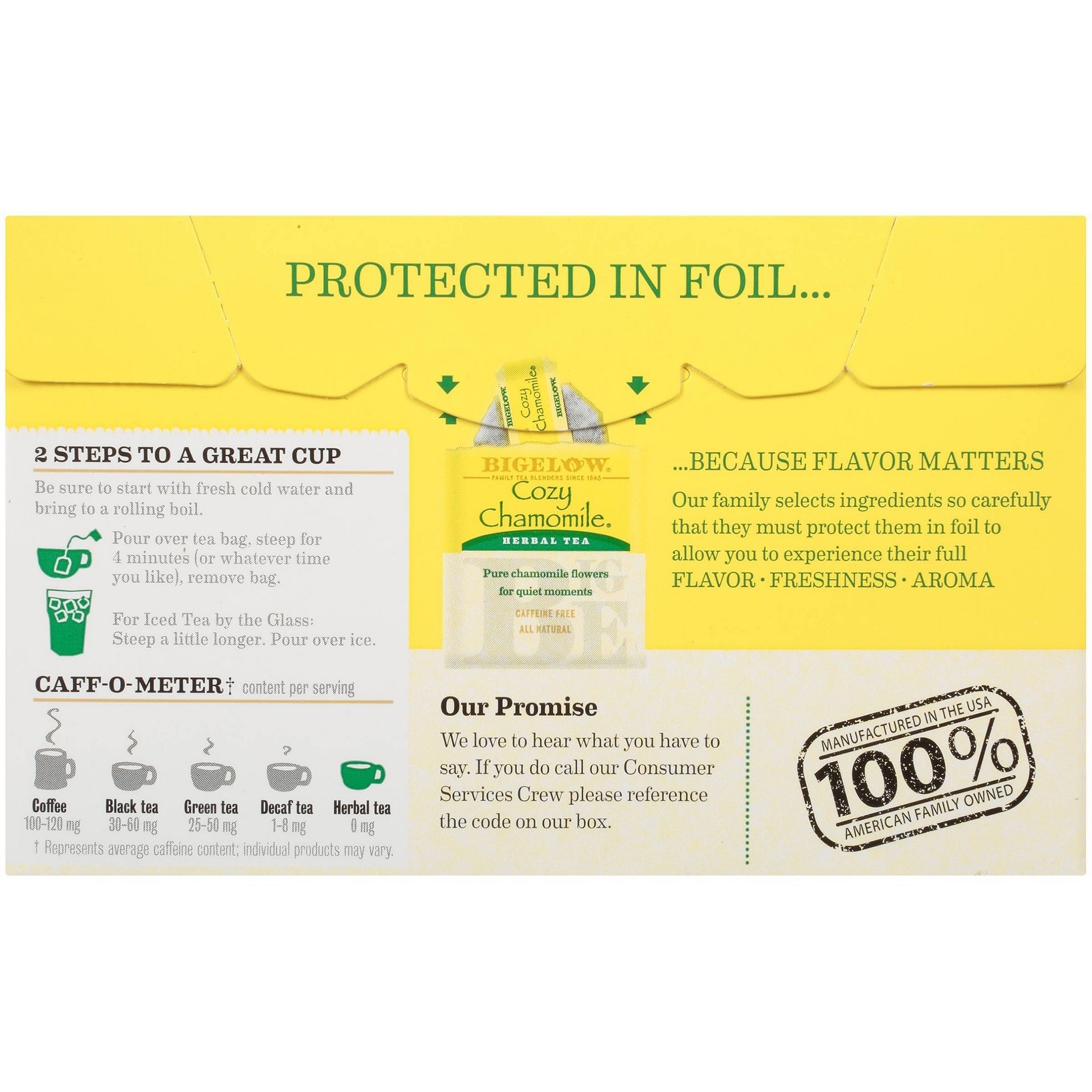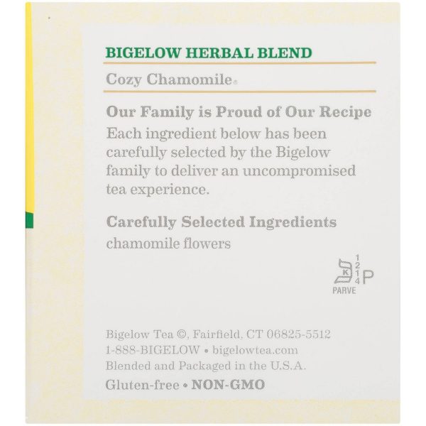 u0026bull;Bigelow Cozy Chamomile, Herbal Tea, Tea Bags, 20 Ctu003cbru003eu0026bull;We use the whole chamomile flower for an exceptional taste. Smooth and full bodied, delicately sweetu003cbru003eu0026bull;20 Tea bags, individually wrapped in foil pouches for peak flavor, freshness and aromau003cbru003eu0026bull;Caffeine-free, Gluten–free, Non-GMO, Kosher Parve, Kosher for Passoveru003cbru003eu0026bull;Bigelow Tea is Family Owned and Blended u0026 Packaged in the USA since 1945u003cbru003eu0026bull;Each Ingredient has been carefully selected by the Bigelow Family to deliver an uncompromised quality tea experienceu003cbru003eu0026bull;Bigelow Tea is proud to be a Certified B Corporation! We meet the highest verified standards of social and environmental performance, transparency, and accountability