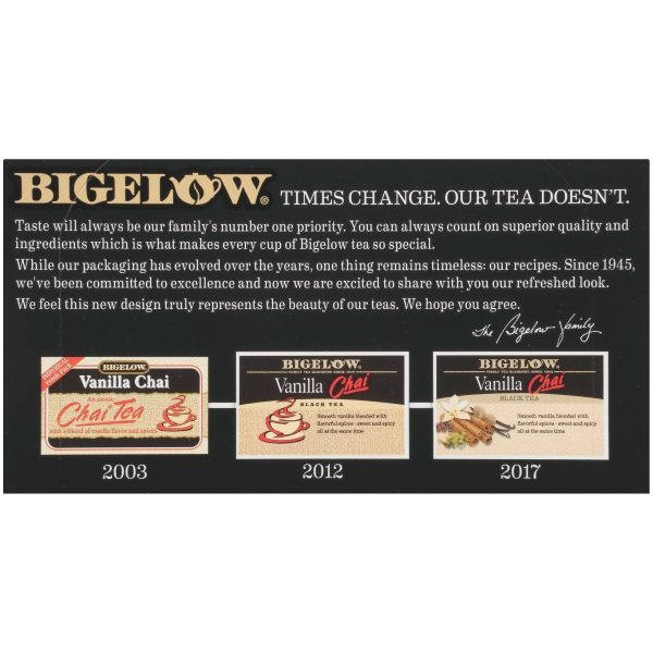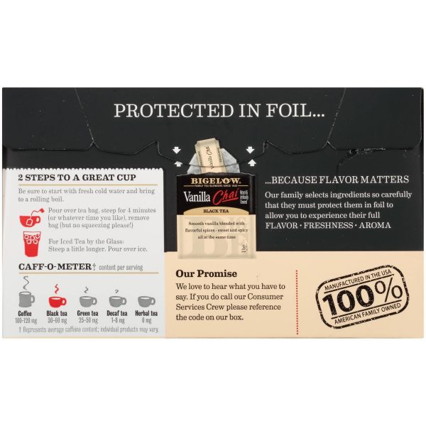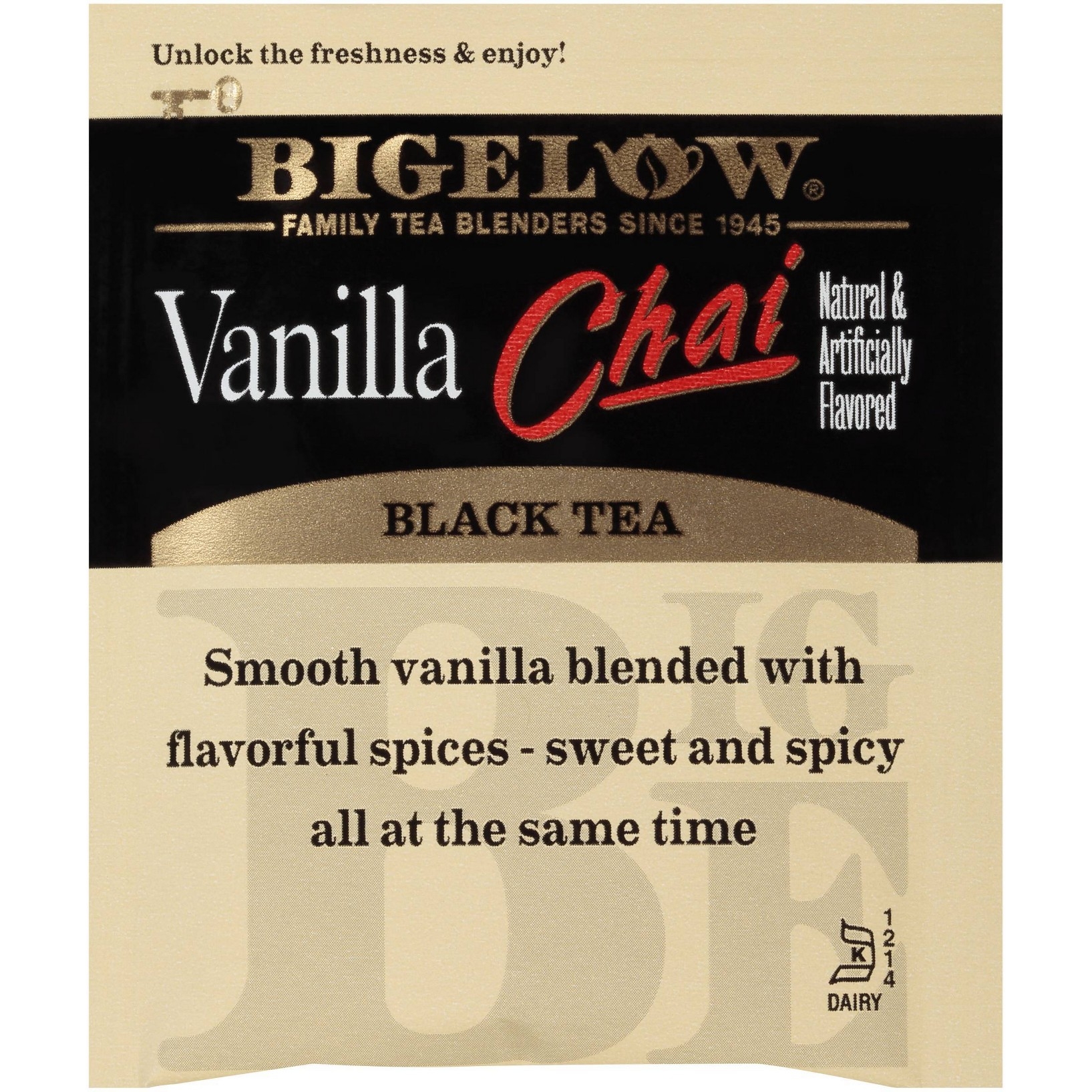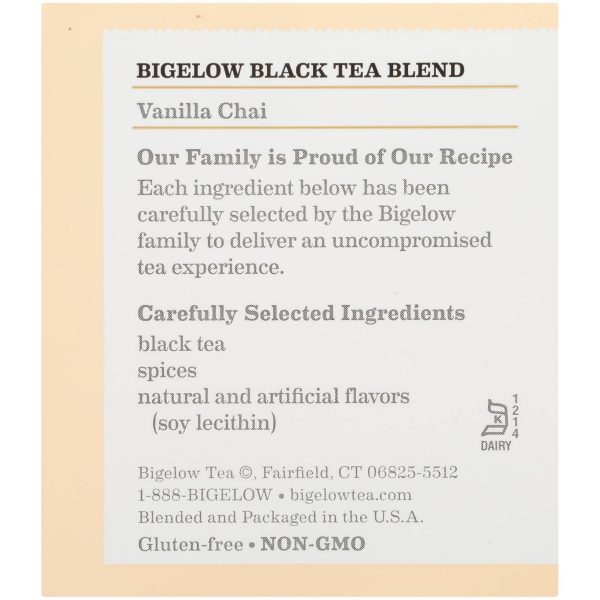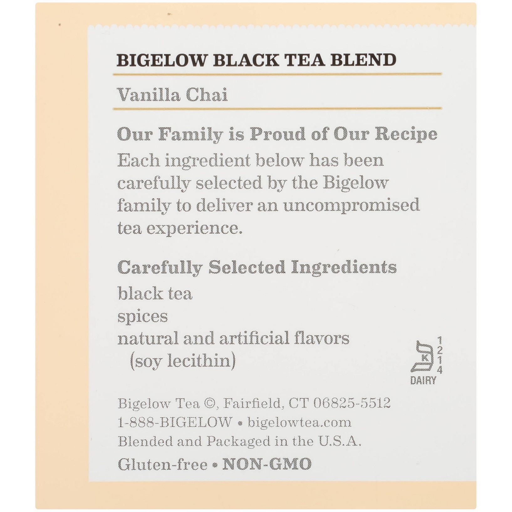 u0026bull;Bigelow Vanilla Chai, Black Tea, Tea Bags, 20 Ctu003cbru003eu0026bull;Smooth vanilla blended with flavorful spices and black teau003cbru003eu0026bull;20 Tea bags, individually wrapped in foil pouches for peak flavor, freshness and aromau003cbru003eu0026bull;Gluten–free, Non-GMO, Kosher Dairyu003cbru003eu0026bull;Bigelow Tea is Family Owned and Blended u0026 Packaged in the USA since 1945u003cbru003eu0026bull;Each Ingredient has been carefully selected by the Bigelow Family to deliver an uncompromised quality tea experienceu003cbru003eu0026bull;Bigelow Tea is proud to be a Certified B Corporation! We meet the highest verified standards of social and environmental performance, transparency, and accountability
