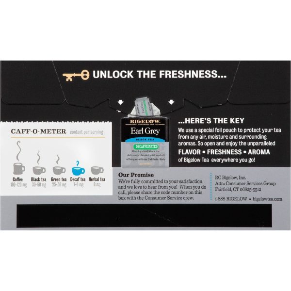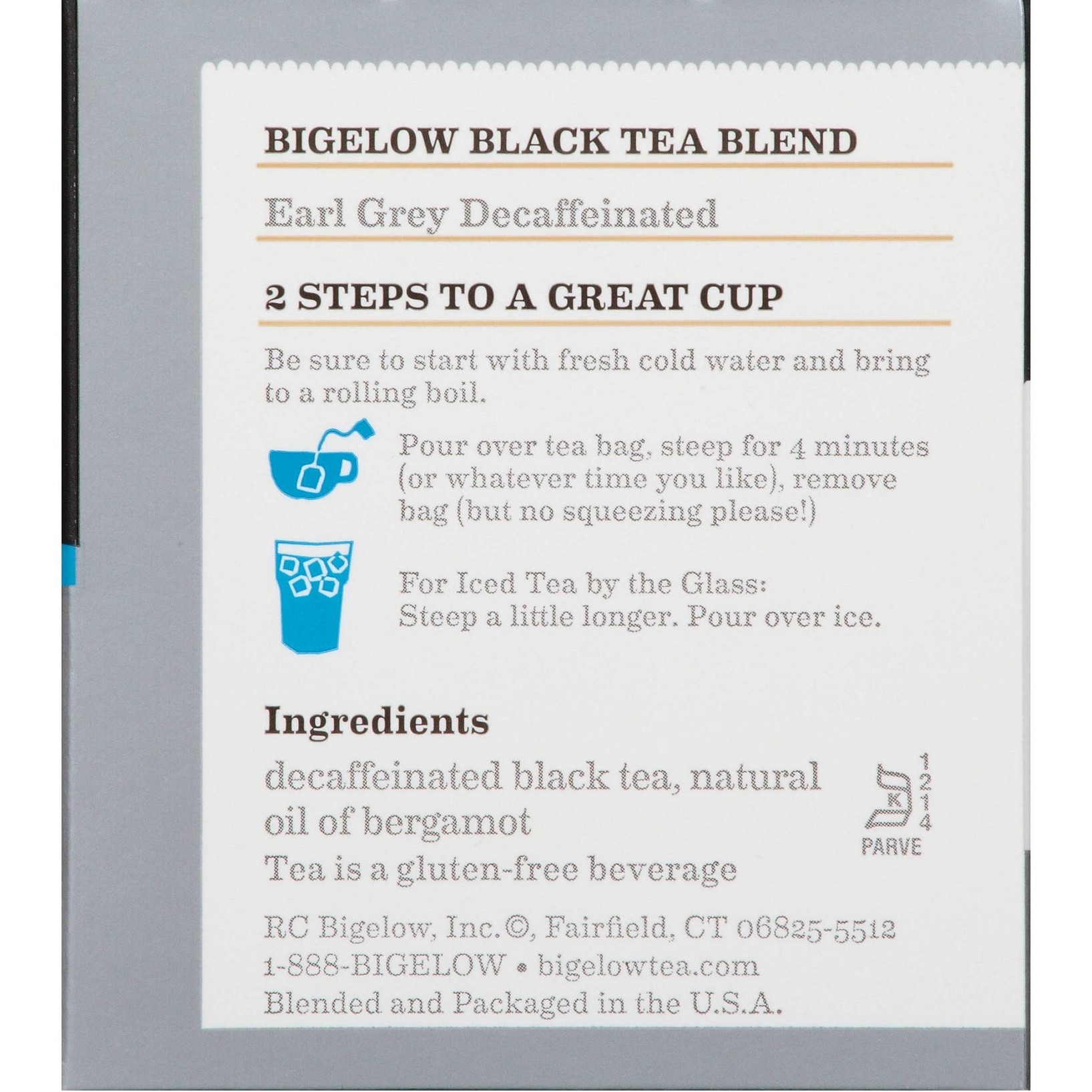 u0026bull;Bigelow Earl grey Decaffeinated, Black Tea, Tea Bags, 20 Ctu003cbru003eu0026bull;Hand Picked tea leaves from high elevation gardens expertly blended with pure bergamot oil from Calabria, Italy without the caffeineu003cbru003eu0026bull;20 Tea bags, individually wrapped in foil pouches for peak flavor, freshness and aromau003cbru003eu0026bull;Gluten–free, Non-GMO, Kosher Parveu003cbru003eu0026bull;Bigelow Tea is Family Owned and Blended u0026 Packaged in the USA since 1945u003cbru003eu0026bull;Each Ingredient has been carefully selected by the Bigelow Family to deliver an uncompromised quality tea experienceu003cbru003eu0026bull;Bigelow Tea is proud to be a Certified B Corporation! We meet the highest verified standards of social and environmental performance, transparency, and accountability
