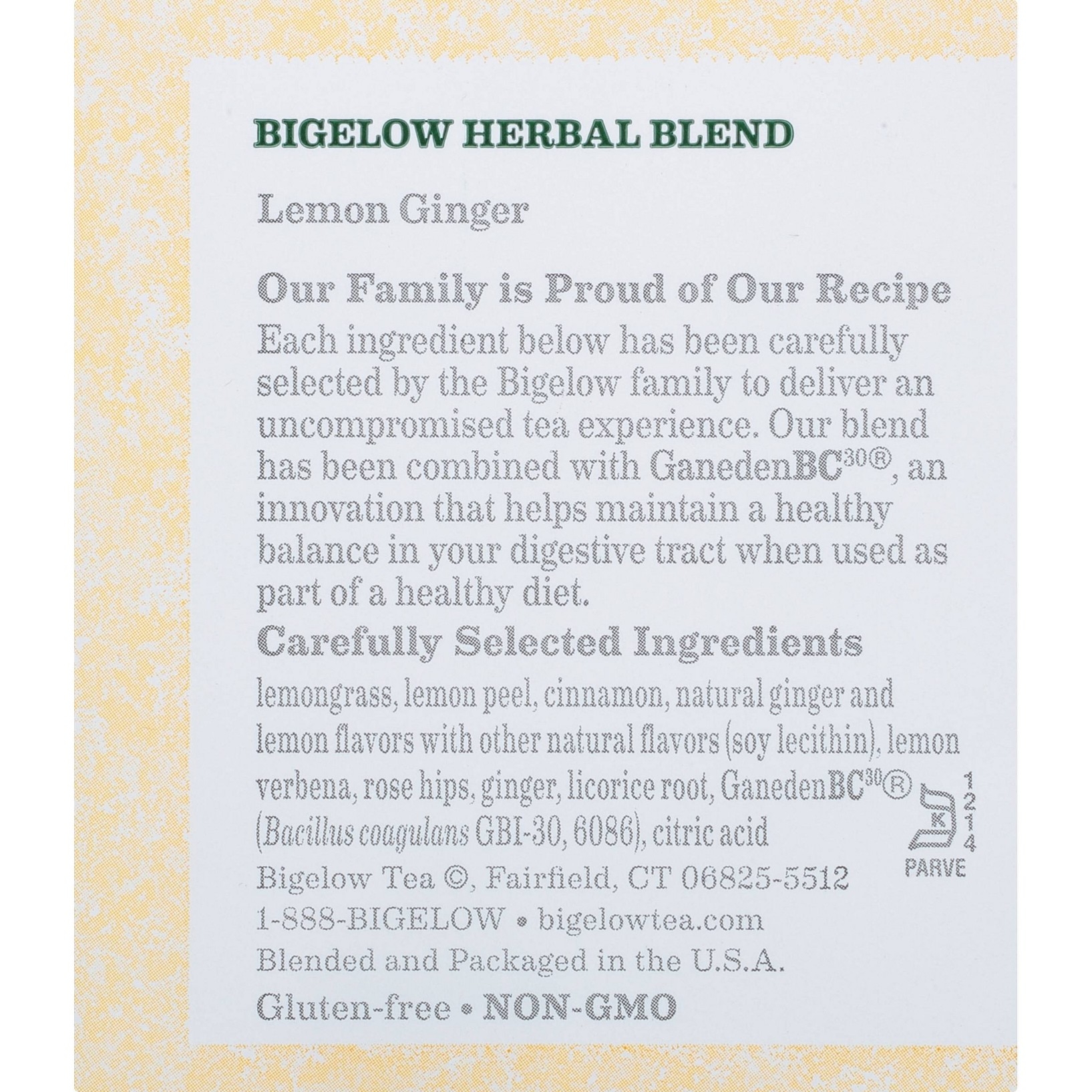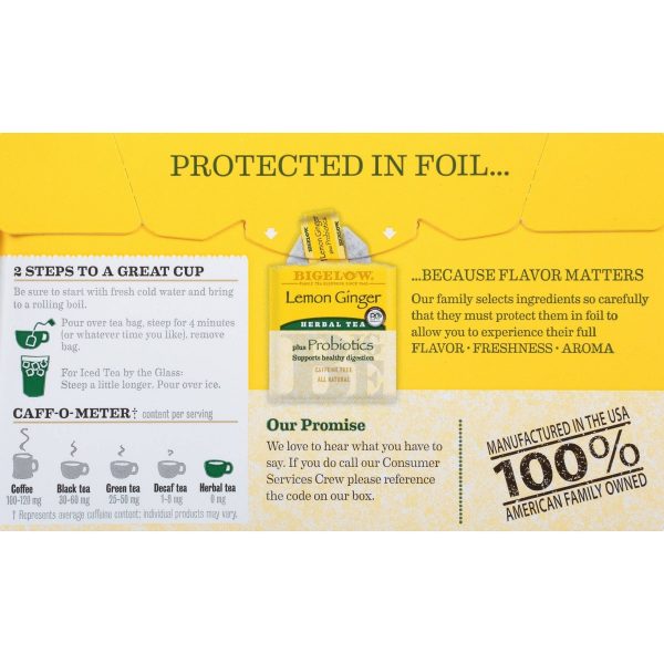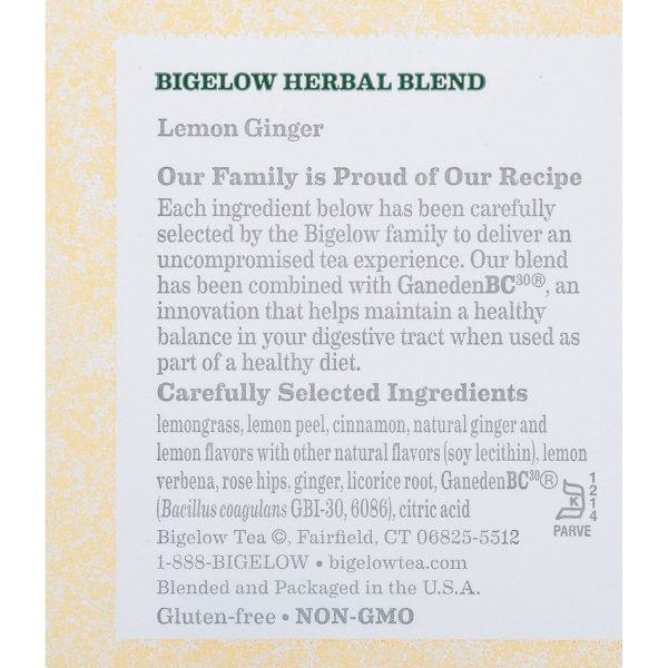 u0026bull;Bigelow Lemon Ginger Probiotics, Herbal Tea, Tea Bags, 18 Ctu003cbru003eu0026bull;Delicious blend of zesty lemon and ginger combined with Ganeden BC30 probiotic that supports overall healthy digestionu003cbru003eu0026bull;18 Tea bags, individually wrapped in foil pouches for peak flavor, freshness and aromau003cbru003eu0026bull;Caffeine-free, Gluten–free, Non-GMO, Kosher Parveu003cbru003eu0026bull;Bigelow Tea is Family Owned and Blended u0026 Packaged in the USAu003cbru003eu0026bull;Each Ingredient has been carefully selected by the Bigelow Family to deliver an uncompromised quality tea experienceu003cbru003eu0026bull;Bigelow Tea is proud to be a Certified B Corporation! We meet the highest verified standards of social and environmental performance, transparency, and accountability