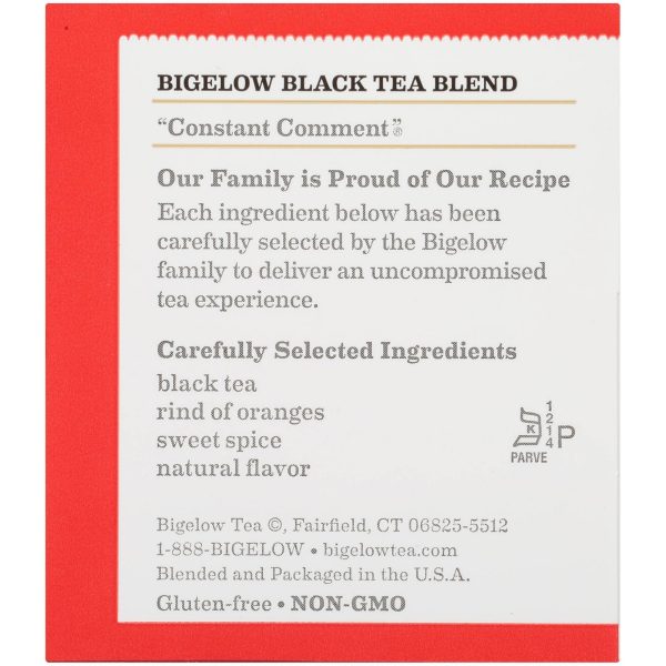 u0026bull;Bigelow Constant Comment, Black Tea, Tea Bags, 20 Ctu003cbru003eu0026bull;The Bigelow Family’s first and most famous blend flavored with a secret recipe of orange rind and sweet spiceu003cbru003eu0026bull;20 Tea bags, individually wrapped in foil pouches for peak flavor, freshness and aromau003cbru003eu0026bull;Gluten–free, Non-GMO, Kosher Parve, Kosher for Passoveru003cbru003eu0026bull;Bigelow Tea is Family Owned and Blended u0026 Packaged in the USA since 1945u003cbru003eu0026bull;Each Ingredient has been carefully selected by the Bigelow Family to deliver an uncompromised quality tea experienceu003cbru003eu0026bull;Bigelow Tea is proud to be a Certified B Corporation! We meet the highest verified standards of social and environmental performance, transparency, and accountability