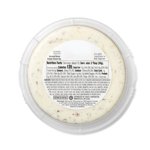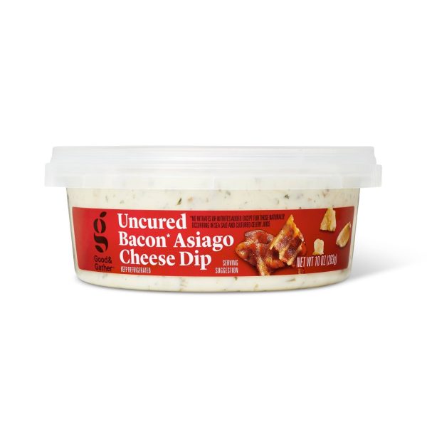Get a tasty nosh on the table in no time with Bacon Asiago Dip from Good u0026 Gather™. This Asiago bacon dip is a savory blend of uncured bacon, cream cheese, Asiago cheese and mozzarella cheese — with no artificial preservatives, synthetic colors or artificial flavors. Enjoy this delicious dip with chips, pretzels or raw veggies for an easy snack, or put some on top of a baked potato or stir into chili for an extra dash of rich flavor. Whether eaten straight out of the refrigerator or heated up, you’re sure to appreciate that this dip comes in a convenient package that lets you enjoy it without having to get an extra plate or bowl dirty. u003cbr /u003eu003cbr /u003eEvery product that carries the Good u0026 Gather™ name starts with quality ingredients that deliver great taste, making it easier for you and your family to eat well, every day. We promise you’ll love each bite, or your money back.