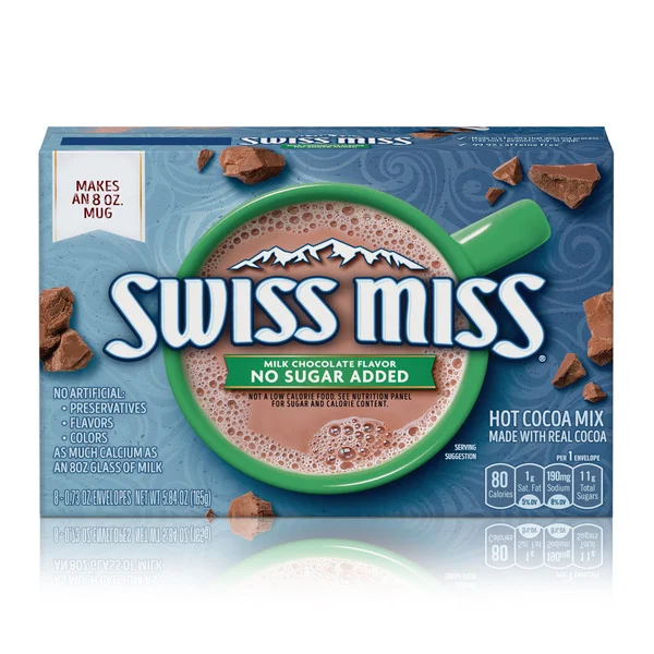 Enjoy each sip of Swiss Miss Milk Chocolate Flavor No Sugar Added Hot Cocoa Mix. It’s the warm, comforting hot cocoa drink that’s perfect for mornings, snow days and sweet evening treats. Made with real milk, this Swiss Miss Milk Chocolate Flavor Hot Cocoa with no added sugar is a delicious, sensible treat. This milk chocolate flavored hot drink has 80 calories per serving and has no artificial flavors, colors or preservatives. So, after a long day of work or play, enjoy a moment of milk chocolatey relaxation. Whatever you’re warming up to, know that you’ll find delights in every mug of Swiss Miss Hot Cocoa Mix.